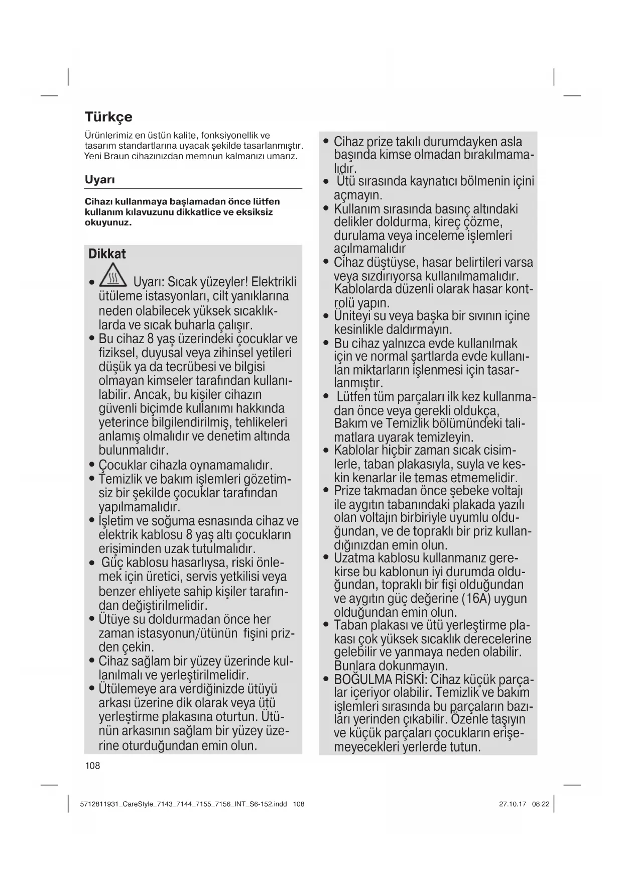 BOĞULMA RİSKİ: Cihaz küçük parça- lar içeriyor olabilir. Temizlik ve bakım işlemleri sırasında bu parçaların bazı- ları yerinden çıkabilir. Özenle taşıyın ve küçük parçaları çocukların erişe- meyecekleri yerlerde tutun. 5712811931_CareStyle_7143_7144_7155_7156_INT_S6-152.indd 1085712811931_CareStyle_7143_7144_7155_7156_INT_S6-152.indd 108 27.10.17 08:2227.10.17 08:22109