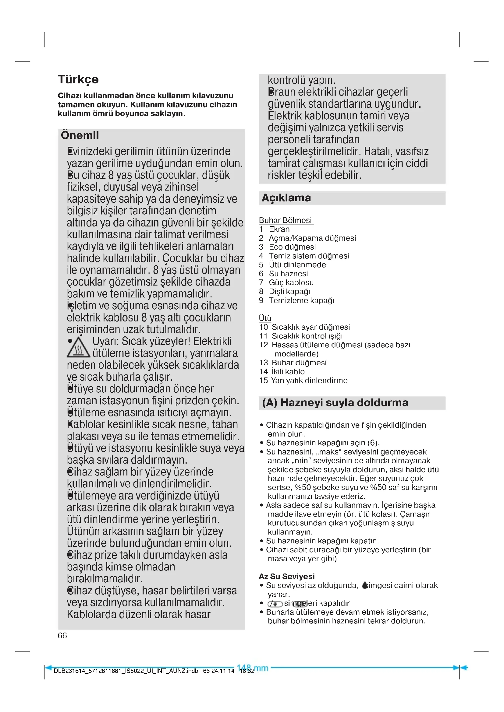 Braun elektrikli cihazlar geçerli güvenlik standartlarına uygundur. Elektrik kablosunun tamiri veya değişimi yalnızca yetkili servis personeli tarafından gerçekleştirilmelidir. Hatalı, vasıfsız tamirat çalışması kullanıcı için ciddi riskler teşkil edebilir. Açıklama Buhar Bölmesi 1 Ekran 2 Açma/Kapama düğmesi 3 Eco düğmesi 4 Temiz sistem düğmesi 5 Ütü dinlenmede 6 Su haznesi 7 Güç kablosu 8 Dişli kapağı 9 Temizleme kapağı Ütü 10 Sıcaklık ayar düğmesi 11 Sıcaklık kontrol ışığı 12 Hassas ütüleme düğmesi (sadece bazı modellerde) 13 Buhar düğmesi 14 İkili kablo 15 Yan yatık dinlendirme (A) Hazneyi suyla doldurma