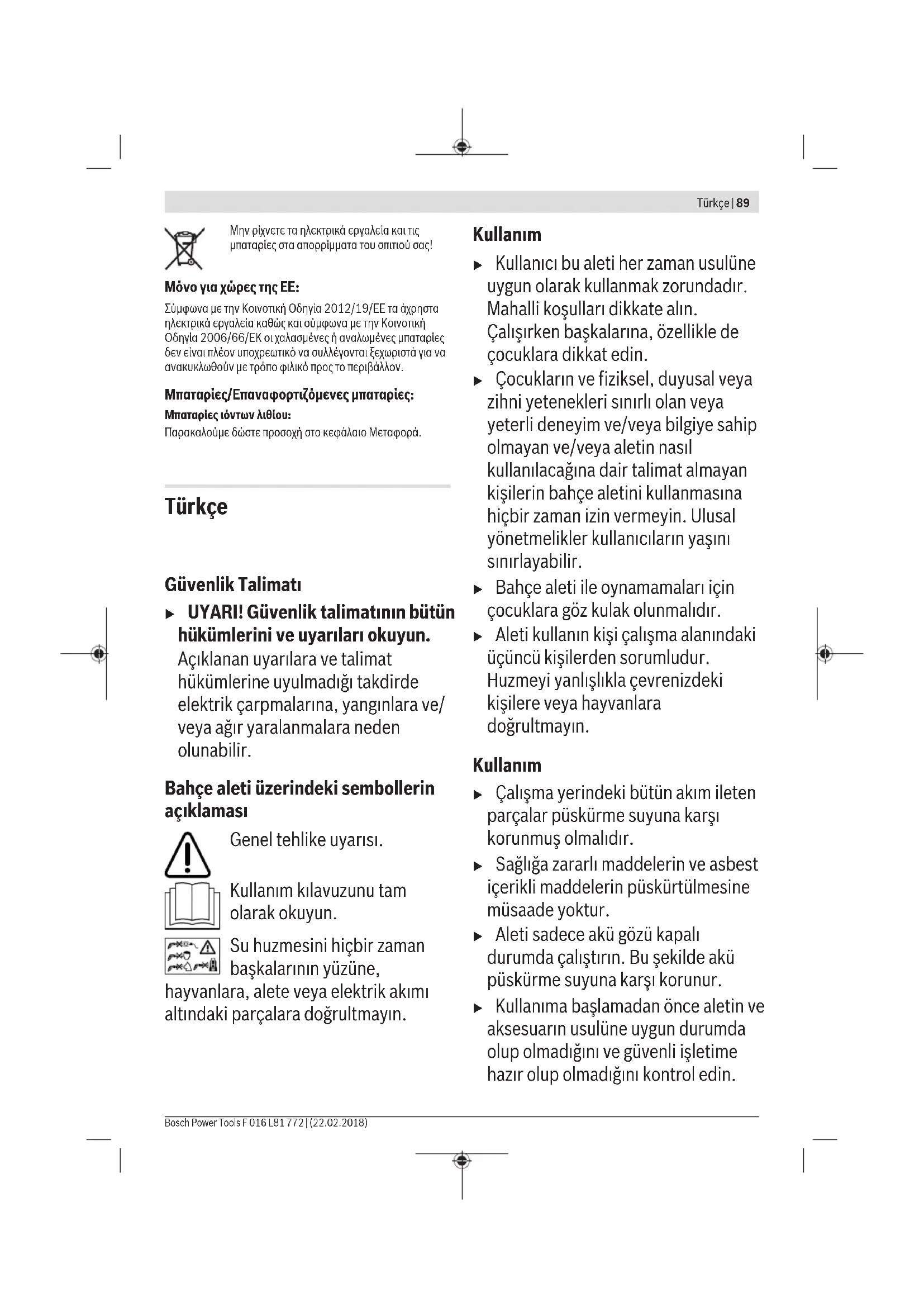 2012/19/EU yönemeligi uyarınca kullanim ömrünu tamamlamş elektrikleri al aletleri ve 2006/66/EC yönemeligi uyarınca arizalı vya kullanim ömrünu tamamlamş aküller/ bataryalar ayrı ayır toplanmak ve cevre dostu tasiye icin bir geri donusüm merkezineGYonderilmek zorundadir.