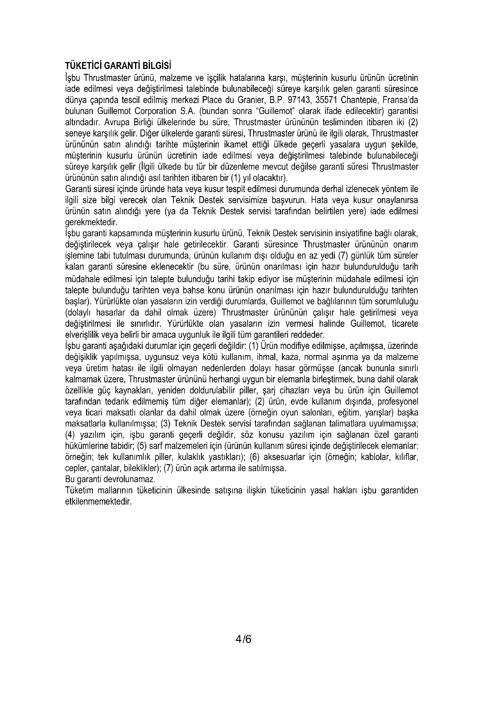 TÜKETİCİ GARANTİ BİLGİSİ İşbu Thrustmaster ürünü, malzeme ve işçilik hatalarına karşı, müşterinin kusurlu ürünün ücretinin iade edilmesi veya değiştirilmesi talebinde bulunabileceği süreye karşılık gelen garanti süresince dünya çapında tescil edilmiş merkezi Place du Granier, B.P. 97143, 35571 Chantepie, Fransa’da bulunan Guillemot Corporation S.A. (bundan sonra “Guillemot” olarak ifade edilecektir) garantisi altındadır. Avrupa Birliği ülkelerinde bu süre, Thrustmaster ürününün tesliminden itibaren iki (2) seneye karşılık gelir. Diğer ülkelerde garanti süresi, Thrustmaster ürünü ile ilgili olarak, Thrustmaster ürününün satın alındığı tarihte müşterinin ikamet ettiği ülkede geçerli yasalara uygun şekilde, müşterinin kusurlu ürünün ücretinin iade edilmesi veya değiştirilmesi talebinde bulunabileceği süreye karşılık gelir (İlgili ülkede bu tür bir düzenleme mevcut değilse garanti süresi Thrustmaster ürününün satın alındığı as ıl tarihten itibaren bir (1) yıl olacaktır). Garanti süresi içinde üründe hata veya kusur tespit edilmesi durumunda derhal izlenecek yöntem ile ilgili size bilgi verecek olan Teknik Destek servisimize başvurun. Hata veya kusur onaylanırsa ürünün satın alındığı yere (ya da Teknik Destek servisi tarafından belirtilen yere) iade edilmesi gerekmektedir. İşbu garanti kapsamında müşterinin kusurlu ürünü, Teknik Destek servisinin insiyatifine bağlı olarak, değiştirilecek veya çalışır hale getirilecektir. Garanti süresince Thrustmaster ürününün onarım işlemine tabi tutulması durumunda, ürünün kullanım dışı olduğu en az yedi (7) günlük tüm süreler kalan garanti süresine eklenecektir (bu süre, ürünün onarılması için hazır bulundurulduğu tarih müdahale edilmesi için talepte bulunduğu tarihi takip ediyor ise müşterinin müdahale edilmesi için talepte bulunduğu tarihten veya bahse konu ürünün onarılması için hazır bulundurulduğu tarihten başlar). Yürürlükte olan yasaların izin verdiği durumlarda, Guillemot ve bağlılarının tüm sorumluluğu (dolaylı hasarlar da dahil olmak üzere) Thrustmaster ürününün çalışır hale getirilmesi veya değiştirilmesi ile sınırlıdır. Yürürlükte olan yasaların izin vermesi halinde Guillemot, ticarete elverişlilik veya belirli bir amaca uygunluk ile ilgili tüm garantileri reddeder. İşbu garanti aşağıdaki durumlar için geçerli değildir: (1) Ürün modifiye edilmişse, açılmışsa, üzerinde değişiklik yapılmışsa, uygunsuz veya kötü kullanım, ihmal, kaza, normal aşınma ya da malzeme veya üretim hatası ile ilgili olmayan nedenlerden dolayı hasar görmüşse (ancak bununla sınırlı kalmamak üzere, Thrustmaster ürününü herhangi uygun bir elemanla birleştirmek, buna dahil olarak özellikle güç kaynakları, yeniden doldurulabilir piller, şarj cihazları veya bu ürün için Guillemot tarafından tedarik edilmemiş tüm diğer elemanlar); (2) ürün, evde kullanım dışında, profesyonel veya ticari maksatlı olanlar da dahil olmak üzere (örneğin oyun salonları, e ğitim, yarışlar) başka maksatlarla kullanılmışsa; (3) Teknik Destek servisi tarafından sağlanan talimatlara uyulmamışsa; (4) yazılım için, işbu garanti geçerli değildir, söz konusu yazılım için sağlanan özel garanti hükümlerine tabidir; (5) sarf malzemeleri için (ürünün kullanım süresi içinde değiştirilecek elemanlar: örneğin; tek kullanımlık piller, kulaklık yastıkları); (6) aksesuarlar için (örneğin; kablolar, kılıflar, cepler, çantalar, bileklikler); (7) ürün açık artırma ile satılmışsa. Bu garanti devrolunamaz. Tüketim mallarının tüketicinin ülkesinde satışına ilişkin tüketicinin yasal hakları işbu garantiden etkilenmemektedir.5