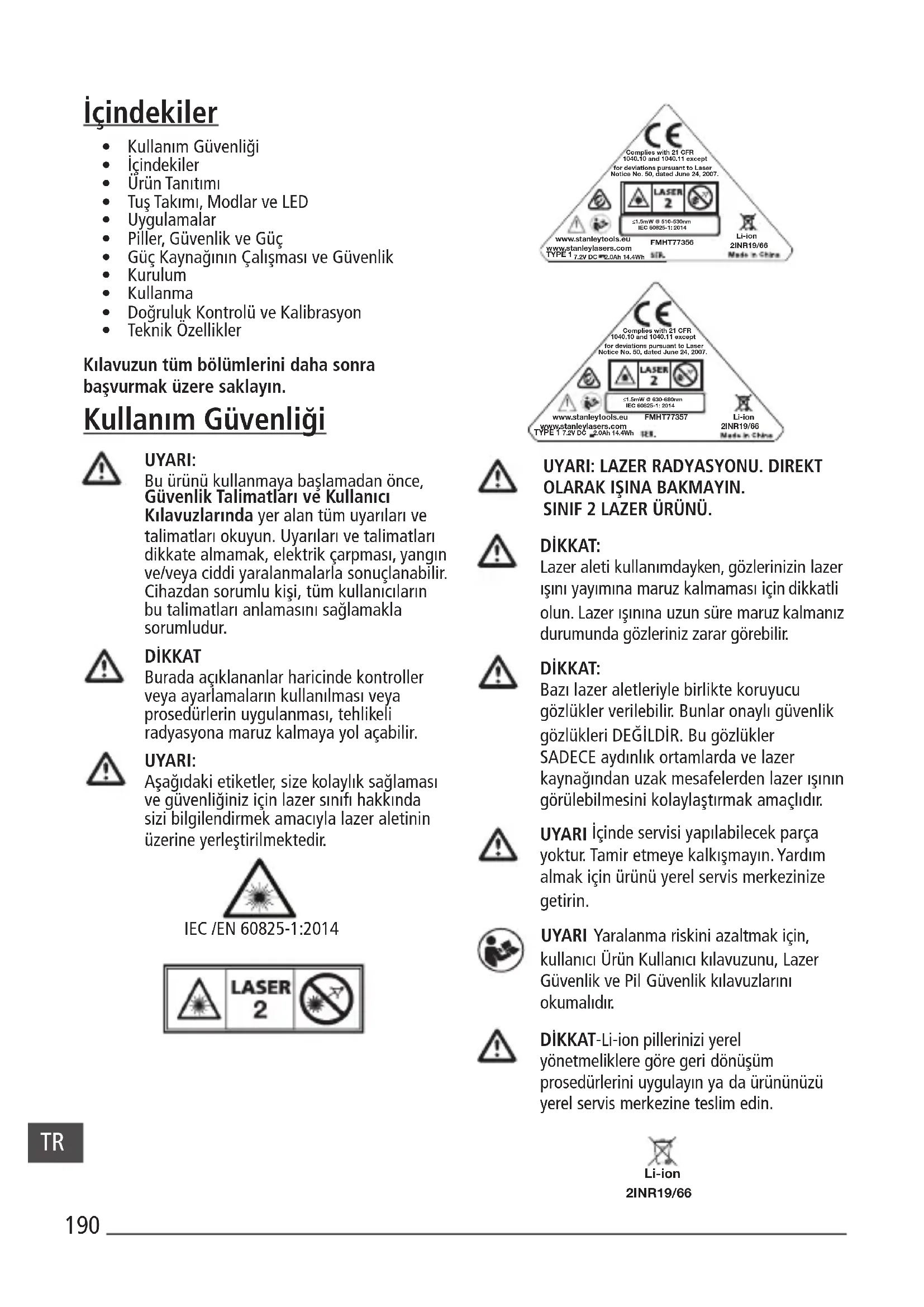 - Lazer ürünü kullanıcı tarafından bakımı yapılabilecek bir ürün değildir ve herhangi bir arıza veya hasar durumunda distribütöre ya da Stanley Garanti/Servis Merkezine götürülmelidir. Uygun servis işlemleri, vasıı bir kişi tarafından sadece parçaların aynıları kullanılarak gerçekleştirilebilir. Bu, ürünün güvenliğinin muhafaza edilmesini sağlayacaktır.193