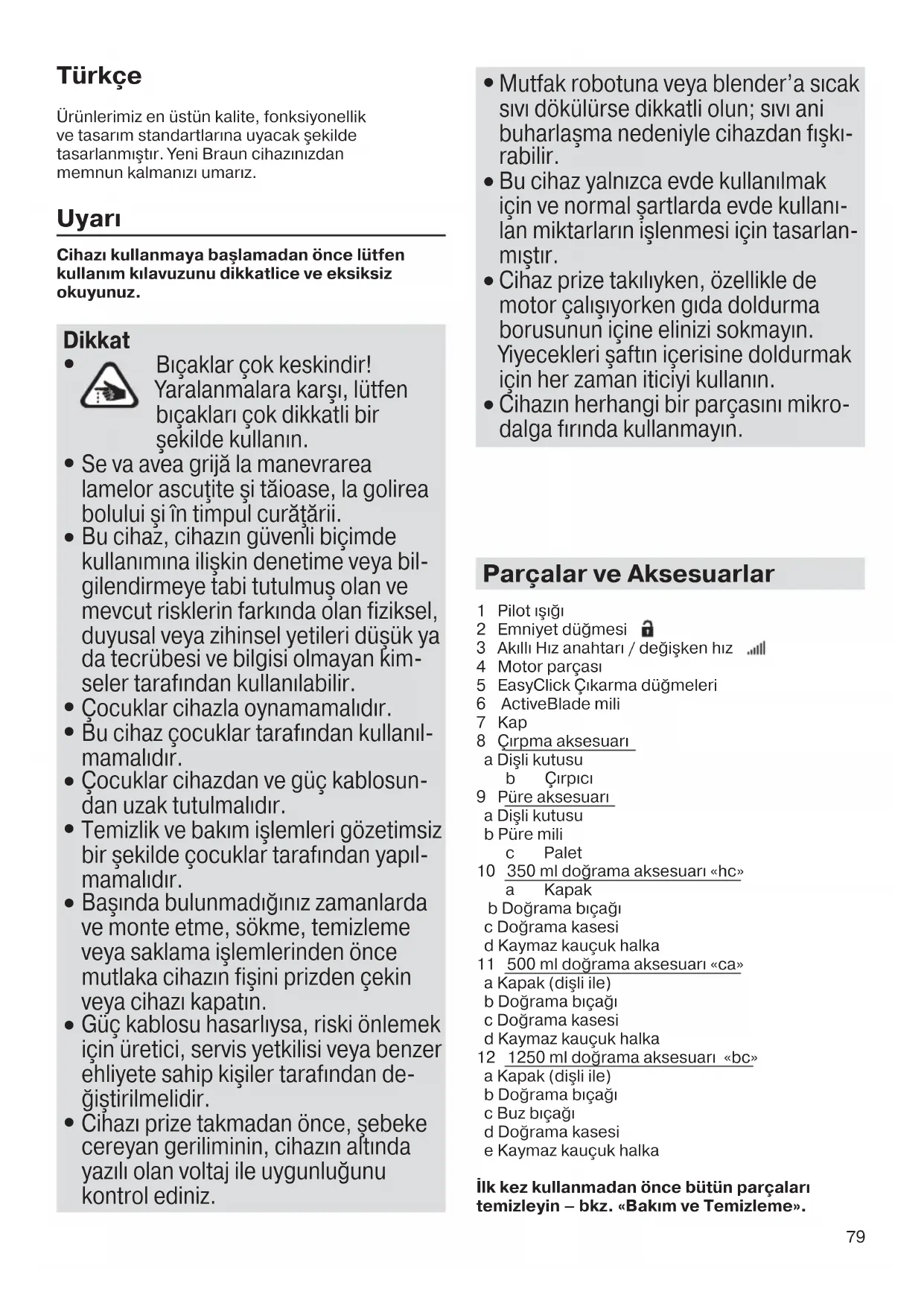 - Pigment içeriği yüksek yiyecekleri (ör. havuç) işlemden geçirirken aksesuarların rengi bozulabilir. Bu parçaları temizlemeden önce bitkisel yağ ile silin. Hem tasarım özellikleri hem de bu kullanım talimatları haber vermeksizin değiştirilebilir. Cihaz kullanım ömrünü tamamladığında lütfen evsel atıklarla birlikte atmayın. Cihazı atmak için Braun Servis Merkezine veya ülkenizde bulunan uygun toplama noktalarına bırakabilirsiniz. Gıda maddeleri ile temas eden aksam ve materyaller Avrupa Birliğinin 1935/2004 sayılı yönergesi ile öngörülen tavsiyelere uygundur. 5722112414_MQ9045X_INT_S6-116.indd 82 17.10.16 11:2183 Română (RO/MD) Produsele noastre sunt proiectate pentru a îndeplini cele mai ridicate standarde de calitate, funcţionalitate şi design. Sperăm să vă bucuraţi pe deplin de noul dvs. aparat Braun. Înainte de utilizare Citiţi integral şi cu atenţie instrucţiunile de utilizare înainte a folosi aparatul. Atenţie
