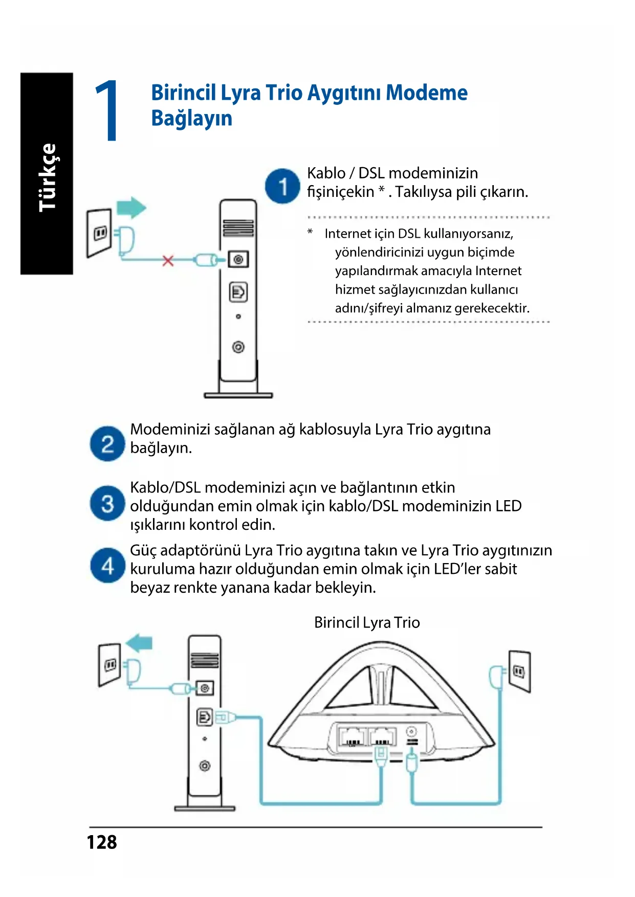 Modeminizi saglanan ağ kablosuyla Lyra Trio aygünna baglayin.