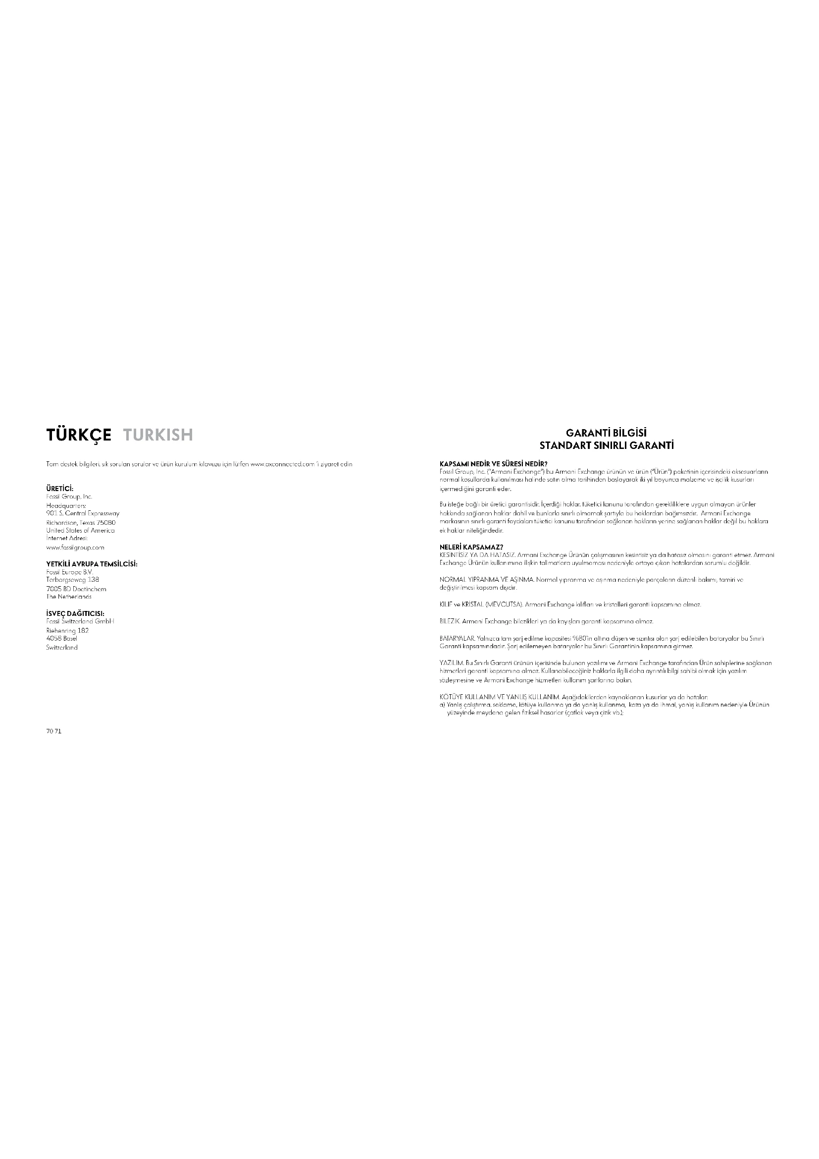KAPSAMI NEDİR VE SÜRESİ NEDİR? Fossil Group, Inc. (“Armani Exchange”) bu Armani Exchange ürünün ve ürün (“Ürün”) paketinin içerisindeki aksesuarların normal koşullarda kullanılması halinde satın alma tarihinden başlayarak iki yıl boyunca malzeme ve işçilik kusurları içermediğini garanti eder. Bu isteğe bağlı bir üretici garantisidir. İçerdiği haklar, tüketici kanunu tarafından gerekliliklere uygun olmayan ürünler hakkında sağlanan haklar dahil ve bunlarla sınırlı olmamak şartıyla bu haklardan bağımsızdır. Armani Exchange markasının sınırlı garanti faydaları tüketici kanunu tarafından sağlanan hakların yerine sağlanan haklar değil bu haklara ek haklar niteliğindedir. NELERİ KAPSAMAZ? KESİNTİSİZ YA DA HATASIZ. Armani Exchange Ürünün çalışmasının kesintisiz ya da hatasız olmasını garanti etmez. Armani Exchange Ürünün kullanımına ilişkin talimatlara uyulmaması nedeniyle ortaya çıkan hatalardan sorumlu değildir. NORMAL YIPRANMA VE AŞINMA. Normal yıpranma ve aşınma nedeniyle parçaların düzenli bakımı, tamiri ve değiştirilmesi kapsam dışıdır. KILIF ve KRİSTAL (MEVCUTSA). Armani Exchange kılıfları ve kristalleri garanti kapsamına almaz. BILEZIK. Armani Exchange bilezikleri ya da kayışları garanti kapsamına almaz. BATARYALAR. Yalnızca tam şarj edilme kapasitesi %80’in altına düşen ve sızıntısı olan şarj edilebilen bataryalar bu Sınırlı Garanti kapsamındadır. Şarj edilemeyen bataryalar bu Sınırlı Garantinin kapsamına girmez. YAZILIM. Bu Sınırlı Garanti ürünün içerisinde bulunan yazılımı ve Armani Exchange tarafından Ürün sahiplerine sağlanan hizmetleri garanti kapsamına almaz. Kullanabileceğiniz haklarla ilgili daha ayrıntılı bilgi sahibi olmak için yazılım sözleşmesine ve Armani Exchange hizmetleri kullanım şartlarına bakın. KÖTÜYE KULLANIM VE YANLIŞ KULLANIM. Aşağıdakilerden kaynaklanan kusurlar ya da hatalar: a) Yanlış çalıştırma, saklama, kötüye kullanma ya da yanlış kullanma, kaza ya da ihmal, yanlış kullanım nedeniyle Ürünün yüzeyinde meydana gelen fiziksel hasarlar (çatlak veya çizik vb.);72 73 b) Sıvıyla, suyla, yağmurla, aşırı nem ya da yoğun terlemeyle, kum, kir ya da benzer maddelerle, aşırı sıcak ya da yiyeceklerle temas; c) Ürünün ticari amaçlarla kullanılması ya da Ürünü normal olmayan kullanıma ya da koşullara maruz bırakma; ya da d) Armani Exchange markasının kusuru olmayan diğer hareketler kapsam dışıdır. ARMANI EXCHANGE OLMAYAN ÜRÜNLERİN KULLANIMI. Armani Exchange olmayan ya da sertifikalı olmayan ürünlerin, aksesuarların ya da yazılımın ya da diğer dış ekipmanların kullanılmasından kaynaklanan kusurlar ya da hasarlar kapsam dışındadır. DEĞİŞTİRİLMİŞ ÜRÜNLER. Aşağıda yazılı olanları içeren ürün: a) Silinmiş, değiştirilmiş ya da aşındırılmış seri numaraları ya da üretim tarihi kodları ya da diğer takip markaları; b) Kırılmış mühürler ya da yetkili olmayan aracılar ya da tamir merkezleri tarafından tahrifat yapılmış ya da erişim sağlanmış olduğuna ilişkin kanıtların olması halinde; kapsam dışıdır. YETKİLİ OLMAYAN SATICILAR. Yetkili Armani Exchange bayiinden alınmamış ürünler kapsam dışındadır. İLETİŞİM HİZMETLERİ. Ürün ile abone olabileceğiniz ya da Ürün ile beraber kullanabileceğiniz herhangi bir iletişim hizmetinden ya da sinyalinden kaynaklanan ürün hataları, hasarları ya da arızaları kapsam dışıdır. ARMANI EXCHANGE MARKASININ YÜKÜMLÜLÜKLERİ NELERDİR? Geçerli garanti süresi boyunca, Ürünün bu Sınırlı Garanti koşulları uyarınca hizmet vermek üzere gönderildiği bilinerek, Armani Exchange bir ücretlendirme olmaksızın yalnızca kendi tercihiyle olmak üzere, Ürünü tamir eder, değiştirir ya da Ürünün satın alma fiyatını geri öder. Armani Exchange kendi tercihiyle olmak şartıyla, bir Ürünü tamir ederken yeniden oluşturulmuş, yeniden düzenlenmiş ya da yeni parçalar kullanabilir ya da Ürünü yeniden oluşturulmuş, yeniden düzenlenmiş ya da yeni bir Ürünle değiştirebilir. Tüm değiştirilmiş Ürünler ilk ürünün garanti süresinden geri kalan süre boyunca ya da doksan (90) gün boyunca, hangisi daha uzunsa, garanti kapsamında olur. Tüm değiştirilmiş Ürünler, parçalar, unsurlar, kartlar ve ekipmanlar Armani Exchange mülkiyetine geçecektir. Yürürlükteki kanunlarca izin verilen açıkça belirtilen kapsam hariç olmak üzere bu Sınırlı Garantinin devredilmesi ya da atanması yasaktır. BİR GARANTİ HİZMETİ ALMAK İçİN NE YAPMALISINIZ? Bu Sınırlı Garanti kapsamında hizmet almak için Ürünü satış faturasıyla ya da satın alma tarihini gösteren, fatura yerine geçebilecek bir kanıtla, Ürünün seri numarası ve satıcının ismi ve adresiyle beraber kargo için elverişli bir konteyner içerisinde bir yetkili servis merkezine geri göndermelisiniz. Armani Exchange bir Ürünün bu Sınırlı Garanti kapsamında olmadığını tespit ederse, tamir ve böyle bir Ürünün geri gönderilmesi için gerekli tüm parça, kargo ve işçilik ücretlerini ödemek zorundadır. En yakın uluslararası servis merkezini bulmak için, lütfen www.axconnected.com adresini ziyaret edin Ürününüze eklenen hiçbir veri, yazılım ya da uygulama yeniden yüklenmeyecektir. Bu garanti hizmeti boyunca içeriklerin bir kısmı ya da tamamı silinebileceği ya da yeniden biçimlendirileceği için Ürünü garanti hizmeti için Armani Exchange e göndermeden önce Üründeki içeriğin bağımsız bir yedek kopyasını saklamalısınız. ARMANI EXCHANGE MARKASINA AİT SORUMLULUĞUN SINIRLARI NELERDİR? BUNDAN ÖNCEKİ GARANTİLER VE YASAL YOLLAR AYRICALIKLIDIR VE İFADE YA DA İMA EDİLMİŞ YA DA YASAL, DİĞER TÜM GARANTİLERİN, ŞARTLAR YA DA KOŞULLARIN, HERHANGİ BİR DURUMDA, ARMANI EXCHA