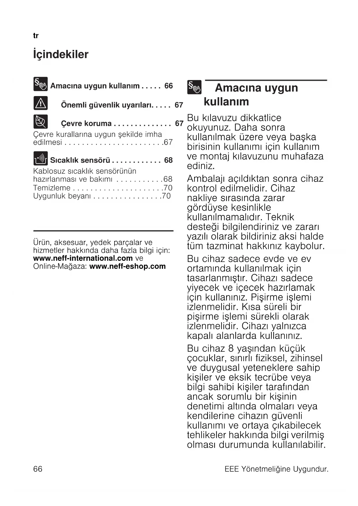 - Uygunluk beyanı Produktinfo Ürün, aksesuar, yedek parçalar ve hizmetler hakkında daha fazla bilgi için: www.neff-international.com ve Online-Mağaza: www.neff-eshop.com 8 Amacına uygun kullanım Amacına uygun kullanım Bu kılavuzu dikkatlice okuyunuz. Daha sonra kullanılmak üzere veya başka birisinin kullanımı için kullanım ve montaj kılavuzunu muhafaza ediniz. Ambalajı açıldıktan sonra cihaz kontrol edilmelidir. Cihaz nakliye sırasında zarar gördüyse kesinlikle kullanılmamalıdır. Teknik desteği bilgilendiriniz ve zararı yazılı olarak bildiriniz aksi halde tüm tazminat hakkınız kaybolur. Bu cihaz sadece evde ve ev ortamında kullanılmak için tasarlanmıştır. Cihazı sadece yiyecek ve içecek hazırlamak için kullanınız. Pişirme işlemi izlenmelidir. Kısa süreli bir pişirme işlemi sürekli olarak izlenmelidir. Cihazı yalnızca kapalı alanlarda kullanınız. Bu cihaz 8 yaş ından küçük çocuklar, sınırlı fiziksel, zihinsel ve duygusal yeteneklere sahip kişiler ve eksik tecrübe veya bilgi sahibi kişiler tarafından ancak sorumlu bir kişinin denetimi altında olmaları veya kendilerine cihazın güvenli kullanımı ve ortaya çıkabilecek tehlikeler hakkında bilgi verilmiş olması durumunda kullanılabilir.EEE Yönetmeliǧine Uygundur. p. 70