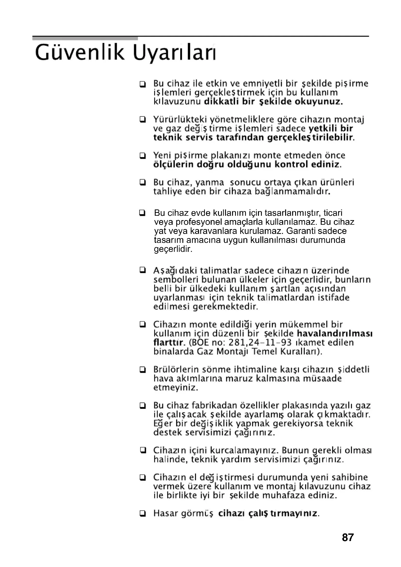 tasarlanmıştır, ticari veya profesyonel yat veya karavanlara kurulamaz. Garanti amaçlarla kullanılamaz. Bu cihaz sadece tasarım amacına uygun Bu cihaz evde kullanım için kullanılması durumunda geçerlidir.88 Elektrik çarpması riski oluşturabileceği için, pişirme kullanmayınız. plakasını temizlemek üzere buharlı temizleme makinaları DAHA ÖNCE BELİRTİLMİŞ OLAN GÜVENLİK UY ARILARINA UYULMAMASI HALİNDE,
