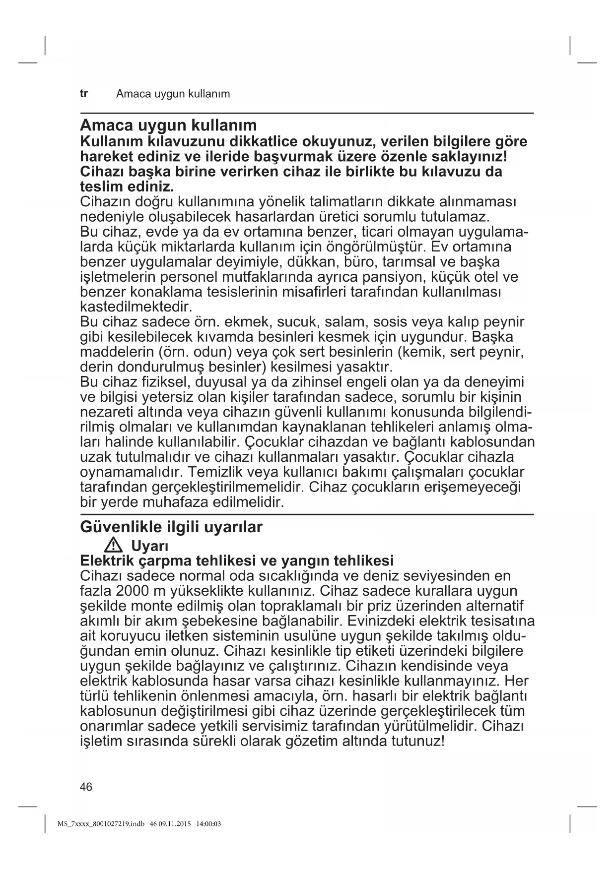 Amacauygunkullanım Amaca uygun kullanım Kullanım kılavuzunu dikkatlice okuyunuz, verilen bilgilere göre hareket ediniz ve ileride başvurmak üzere özenle saklayınız! Cihazı başka birine verirken cihaz ile birlikte bu kılavuzu da teslim ediniz. Cihazındoğrukullanımınayöneliktalimatlarındikkatealınmaması nedeniyleoluşabilecekhasarlardanüreticisorumlututulamaz. Bucihaz,evdeyadaevortamınabenzer,ticariolmayanuygulama- lardaküçükmiktarlardakullanımiçinöngörülmüştür.Evortamına benzeruygulamalardeyimiyle,dükkan,büro,tarımsalvebaşka işletmelerinpersonelmutfaklarındaayrıcapansiyon,küçükotelve benzerkonaklamatesislerininmisarleritarafındankullanılması kastedilmektedir. Bucihazsadeceörn.ekmek,sucuk,salam,sosisveyakalıppeynir gibikesilebilecekkıvamdabesinlerikesmekiçinuygundur.Başka maddelerin(örn.odun)veyaçoksertbesinlerin(kemik,sertpeynir, derindondurulmuşbesinler)kesilmesiyasaktır. Bucihazziksel,duyusalyadazihinselengeliolanyadadeneyimi vebilgisiyetersizolankişilertarafındansadece,sorumlubirkişinin nezaretialtındaveyacihazıngüvenlikullanımıkonusundabilgilendi- rilmişolmalarıvekullanımdankaynaklanantehlikelerianlamışolma- larıhalindekullanılabilir.Çocuklarcihazdanvebağlantıkablosundan uzaktutulmalıdırvecihazıkullanmalarıyasaktır.Çocuklarcihazla oynamamalıdır.Temizlikveyakullanıcıbakımıçalışmalarıçocuklar tarafındangerçekleştirilmemelidir.Cihazçocuklarınerişemeyeceği biryerdemuhafazaedilmelidir. Güvenlikle ilgili uyarılar W Uyarı Elektrik çarpma tehlikesi ve yangın tehlikesi Cihazısadecenormalodasıcaklığındavedenizseviyesindenen fazla2000myüksekliktekullanınız.Cihazsadecekurallarauygun şekildemonteedilmişolantopraklamalıbirprizüzerindenalternatif akımlıbirakımşebekesinebağlanabilir.Evinizdekielektriktesisatına aitkoruyucuiletkensistemininusulüneuygunşekildetakılmışoldu- ğundaneminolunuz.Cihazıkesinlikletipetiketiüzerindekibilgilere uygunşekildebağlayınızveçalıştırınız.Cihazınkendisindeveya elektrikkablosundahasarvarsacihazıkesinliklekullanmayınız.Her türlütehlikeninönlenmesiamacıyla,örn.hasarlıbirelektrikbağlantı kablosunundeğiştirilmesigibicihazüzerindegerçekleştirilecektüm onarımlarsadeceyetkiliservisimiztarafındanyürütülmelidir.Cihazı işletimsırasındasürekliolarakgözetimaltındatutunuz! MS_7xxxx_8001027219.indb 46 09.11.2015 14:00:03 47