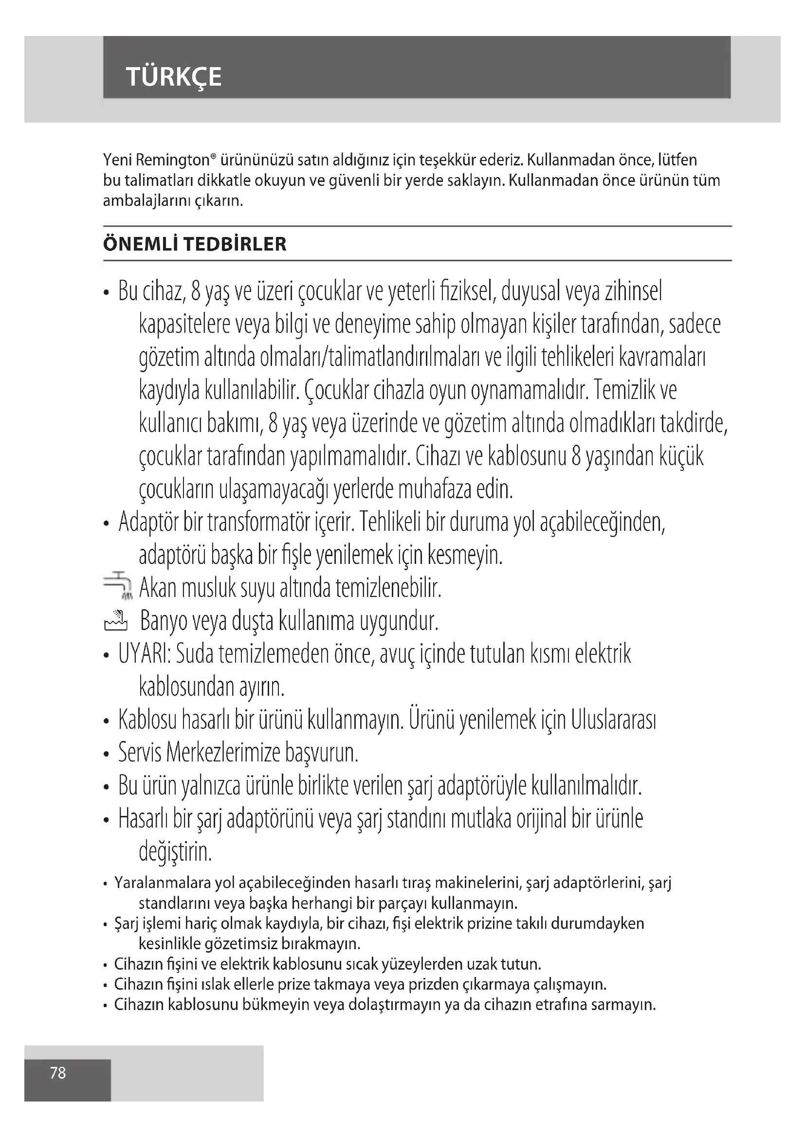 - Bu cihaz, 8 yaş ve üzeri çocuklar ve yeterli fiziksel, duyusal veya zihinsel kapasitelere veya bilgi ve deneyime sahip olmayan kişiler tarafından, sadece gözetim altında olmaları/talimatlandırılmaları ve ilgili tehlikeleri kavramaları kaydıyla kullanılabilir. Çocuklar cihazla oyun oynamamalıdır. Temizlik ve kullanıcı bakımı, 8 yaş veya üzerinde ve gözetim altında olmadıkları takdirde, çocuklar tarafından yapılmamalıdır. Cihazı ve kablosunu 8 yaşından küçük çocukların ulaşamayacağı yerlerde muhafaza edin.