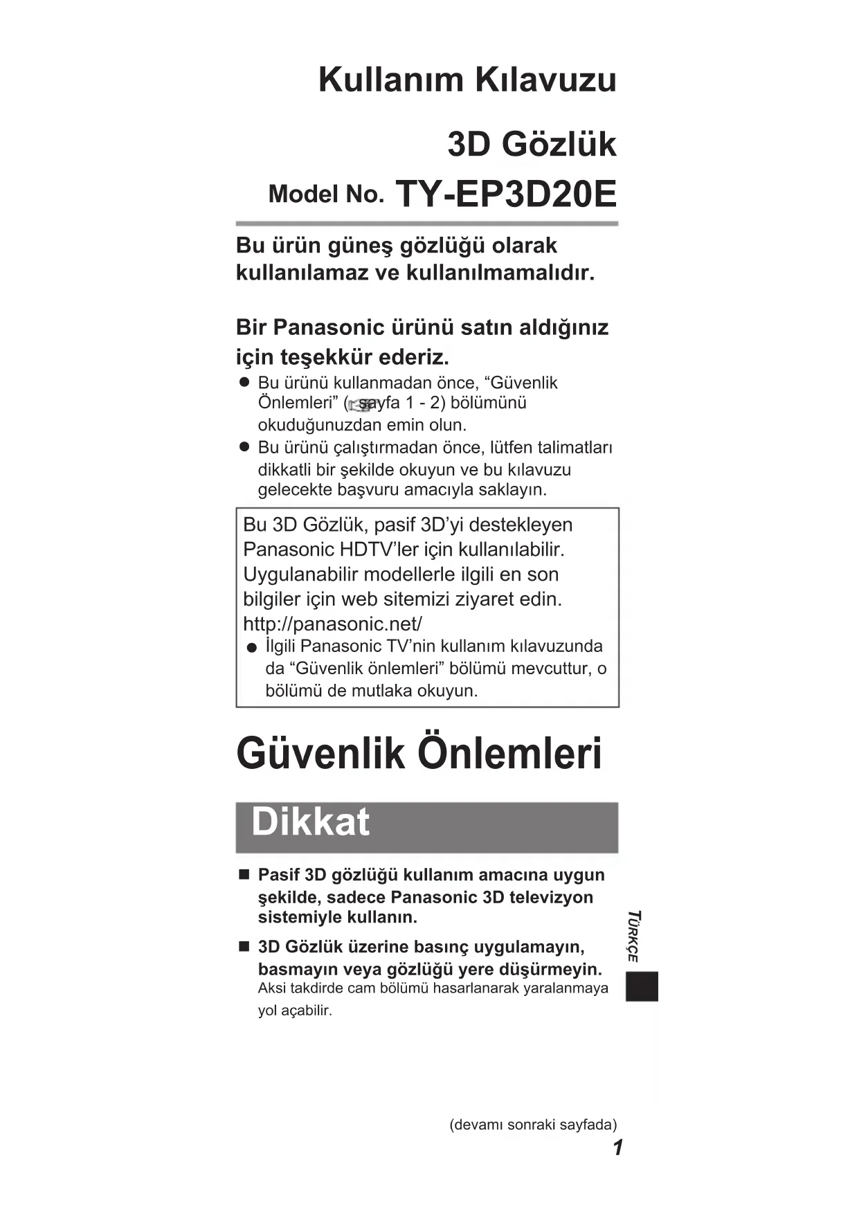 ÜRKÇE Kullanım Kılavuzu 3D Gözlük Model No. TY-EP3D20E Bu ürün güneş gözlüğü olarak kullanılamaz ve kullanılmamalıdır. Bir Panasonic ürünü satın aldığınız için teşekkür ederiz. Bu ürünü kullanmadan önce, “Güvenlik Önlemleri” ( sayfa 1 - 2) bölümünü okuduğunuzdan emin olun. Bu ürünü çalıştırmadan önce, lütfen talimatları dikkatli bir şekilde okuyun ve bu kılavuzu gelecekte başvuru amacıyla saklayın.Bu 3D Gözlük, pasif 3D’yi destekleyen Panasonic HDTV’ler için kullanılabilir.Uygulanabilir modellerle ilgili en son bilgiler için web sitemizi ziyaret edin.http://panasonic.net/ İlgili Panasonic TV’nin kullanım kılavuzunda da “Güvenlik önlemleri” bölümü mevcuttur, o bölümü de mutlaka okuyun. Güvenlik Önlemleri Dikkat Pasif 3D gözlüğü kullanım amacına uygun şekilde, sadece Panasonic 3D televizyon sistemiyle kullanın.3D Gözlük üzerine basınç uygulamayın, basmayın veya gözlüğü yere düşürmeyin.Aksi takdirde cam bölümü hasarlanarak yaralanmaya yol açabilir.(devamı sonraki sayfada)2