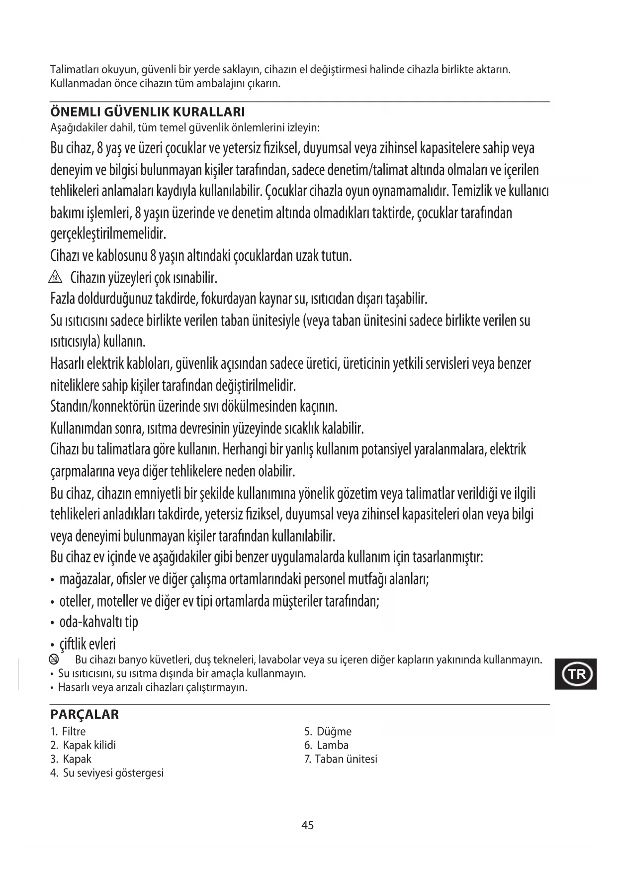 Aşağıdakiler dahil, tüm temel güvenlik önlemlerini izleyin: Bu cihaz, 8 yaş ve üzeri çocuklar ve yetersiz ziksel, duyumsal veya zihinsel kapasitelere sahip veya deneyim ve bilgisi bulunmayan kişiler tarafından, sadece denetim/talimat altında olmaları ve içerilen tehlikeleri anlamaları kaydıyla kullanılabilir. Çocuklar cihazla oyun oynamamalıdır. Temizlik ve kullanıcı bakımı işlemleri, 8 yaşın üzerinde ve denetim altında olmadıkları taktirde, çocuklar tarafından gerçekleştirilmemelidir. Cihazı ve kablosunu 8 yaşın altındaki çocuklardan uzak tutun. h Cihazın yüzeyleri çok ısınabilir. Fazla doldurduğunuz takdirde, fokurdayan kaynar su, ısıtıcıdan dışarı taşabilir. Su ısıtıcısını sadece birlikte verilen taban ünitesiyle (veya taban ünitesini sadece birlikte verilen su ısıtıcısıyla) kullanın. Hasarlı elektrik kabloları, güvenlik açısından sadece üretici, üreticinin yetkili servisleri veya benzer niteliklere sahip kişiler tarafından değiştirilmelidir. Standın/konnektörün üzerinde sıvı dökülmesinden kaçının. Kullanımdan sonra, ısıtma devresinin yüzeyinde sıcaklık kalabilir. Cihazı bu talimatlara göre kullanın. Herhangi bir yanlış kullanım potansiyel yaralanmalara, elektrik çarpmalarına veya diğer tehlikelere neden olabilir. Bu cihaz, cihazın emniyetli bir şekilde kullanımına yönelik gözetim veya talimatlar verildiği ve ilgili tehlikeleri anladıkları takdirde, yetersiz ziksel, duyumsal veya zihinsel kapasiteleri olan veya bilgi veya deneyimi bulunmayan kişiler tarafından kullanılabilir. Bu cihaz ev içinde ve aşağıdakiler gibi benzer uygulamalarda kullanım için tasarlanmıştır: