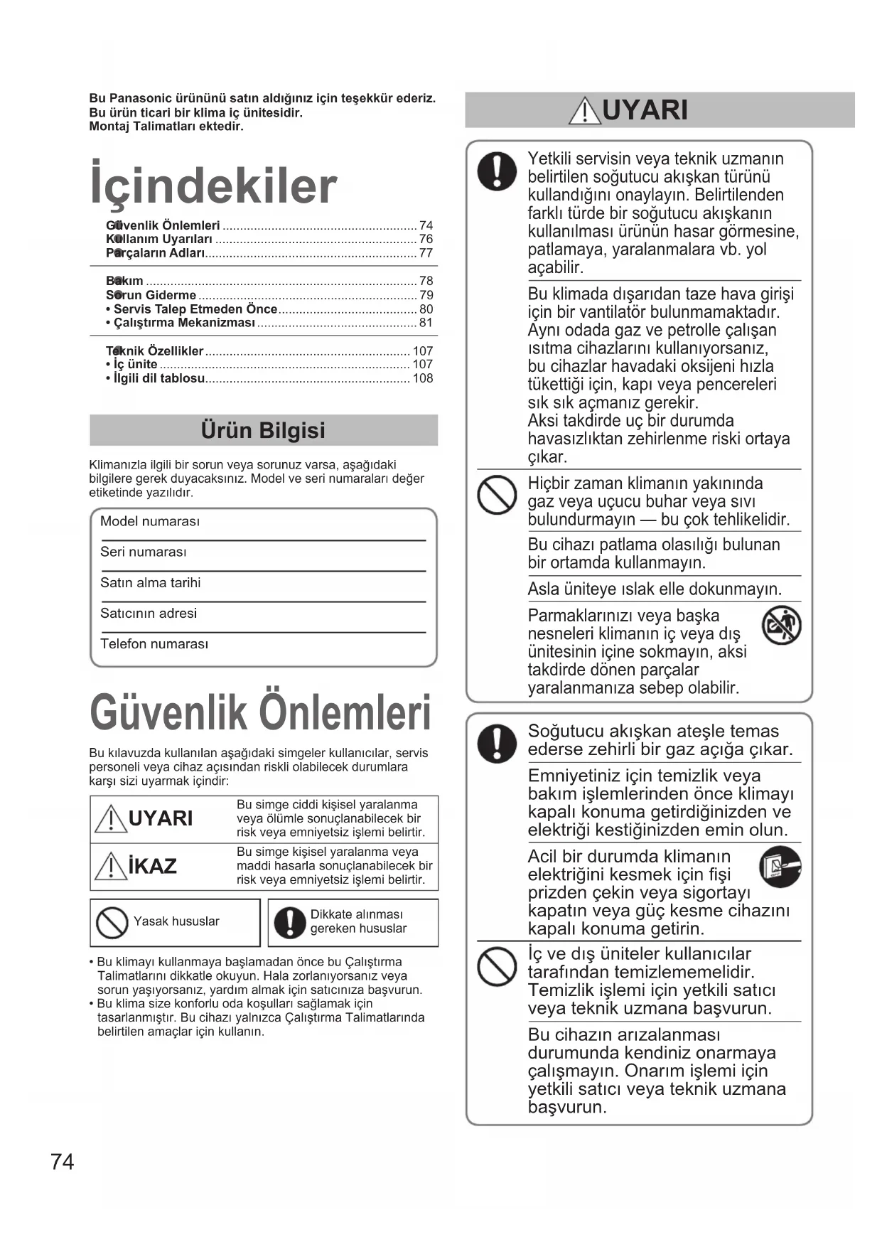- İlgilidiltablosu ........................................................... 108 İçindekiler Güvenlik Önlemleri Ürün Bilgisi Klimanızla ilgili bir sorun veya sorunuz varsa, aşağıdaki bilgilere gerek duyacaksınız. Model ve seri numaraları değer etiketinde yazılıdır.Model numarası Seri numarası Satın alma tarihiSatıcının adresiTelefon numarasıBu kılavuzda kullanılan aşağıdaki simgeler kullanıcılar, servis personeli veya cihaz açısından riskli olabilecek durumlara karşı sizi uyarmak içindir: UYARI Bu simge ciddi kişisel yaralanma veya ölümle sonuçlanabilecek bir risk veya emniyetsiz işlemi belirtir. İKAZ Bu simge kişisel yaralanma veya maddi hasarla sonuçlanabilecek bir risk veya emniyetsiz işlemi belirtir.Yasak hususlarDikkate alınması gereken hususlar• Bu klimayı kullanmaya başlamadan önce bu Çalıştırma Talimatlarını dikkatle okuyun. Hala zorlanıyorsanız veya sorun yaşıyorsanız, yardım almak için satıcınıza başvurun.• Bu klima size konforlu oda koşulları sağlamak için tasarlanmıştır. Bu cihazı yalnızca Çalıştırma Talimatlarında belirtilen amaçlar için kullanın. UYARI OI_00_291492_EU.indb 74 2017/6/20 10:47:3375