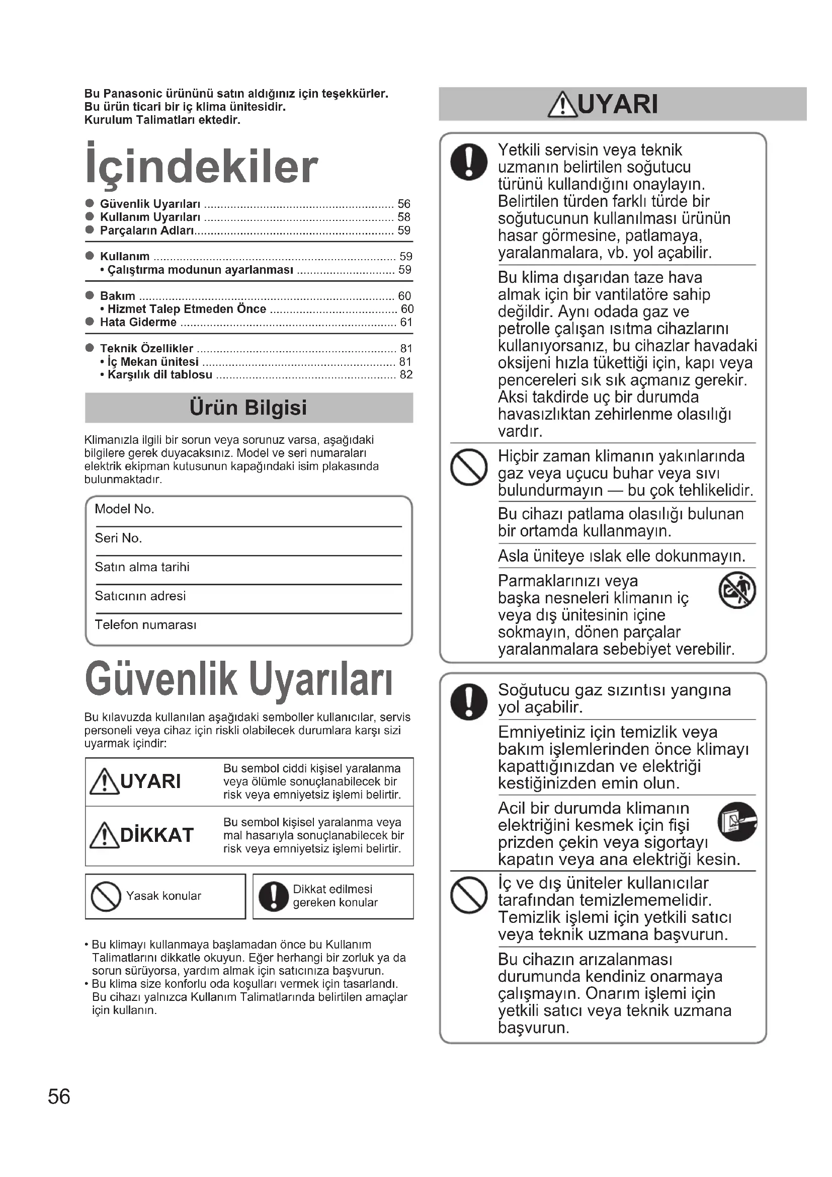 - • Karşılık dil tablosu İçindekiler Güvenlik Uyarıları Ürün Bilgisi Klimanızla ilgili bir sorun veya sorunuz varsa, aşağıdaki bilgilere gerek duyacaksınız. Model ve seri numaraları elektrik ekipman kutusunun kapağındaki isim plakasında bulunmaktadır.Model No. Seri No. Satın alma tarihiSatıcının adresiTelefon numarası Yetkili servisin veya teknik uzmanın belirtilen soğutucu türünü kullandığını onaylayın. Belirtilen türden farklı türde bir soğutucunun kullanılması ürünün hasar görmesine, patlamaya, yaralanmalara, vb. yol açabilir. Bu klima dışarıdan taze hava almak için bir vantilatöre sahip değildir. Aynı odada gaz ve petrolle çalışan ısıtma cihazlarını kullanıyorsanız, bu cihazlar havadaki oksijeni hızla tükettiği için, kapı veya pencereleri sık sık açmanız gerekir. Aksi takdirde uç bir durumda havasızlıktan zehirlenme olasılığı vardır. Hiçbir zaman klimanın yakınlarında gaz veya uçucu buhar veya sıvı bulundurmayın — bu çok tehlikelidir. Bu cihazı patlama olasılığı bulunan bir ortamda kullanmayın. Asla üniteye ıslak elle dokunmayın. Parmaklarınızı veya başka nesneleri klimanın iç veya dış ünitesinin içine sokmayın, dönen parçalar yaralanmalara sebebiyet verebilir. Soğutucu gaz sızıntısı yangına yol açabilir. Emniyetiniz için temizlik veya bakım işlemlerinden önce klimayı kapattığınızdan ve elektriği kestiğinizden emin olun. Acil bir durumda klimanın elektriğini kesmek için şi prizden çekin veya sigortayı kapatın veya ana elektriği kesin. İç ve dış üniteler kullanıcılar tarafından temizlememelidir. Temizlik işlemi için yetkili satıcı veya teknik uzmana başvurun. Bu cihazın arızalanması durumunda kendiniz onarmaya çalışmayın. Onarım işlemi için yetkili satıcı veya teknik uzmana başvurun. Bu kılavuzda kullanılan aşağıdaki semboller kullanıcılar, servis personeli veya cihaz için riskli olabilecek durumlara karşı sizi uyarmak içindir: UYARI Bu sembol ciddi kişisel yaralanma veya ölümle sonuçlanabilecek bir risk veya emniyetsiz işlemi belirtir. DİKKAT Bu sembol kişisel yaralanma veya mal hasarıyla sonuçlanabilecek bir risk veya emniyetsiz işlemi belirtir.Yasak konularDikkat edilmesi gereken konularBu Panasonic ürününü satın aldığınız için teşekkürler.Bu ürün ticari bir iç klima ünitesidir.Kurulum Talimatları ektedir.• Bu klimayı kullanmaya başlamadan önce bu Kullanım Talimatlarını dikkatle okuyun. Eğer herhangi bir zorluk ya da sorun sürüyorsa, yardım almak için satıcınıza başvurun.• Bu klima size konforlu oda koşulları vermek için tasarlandı. Bu cihazı yalnızca Kullanım Talimatlarında belirtilen amaçlar için kullanın. UYARI OI_00_F569714_EU_all.indb 56 2014-10-30 11:07:2657 p. 82