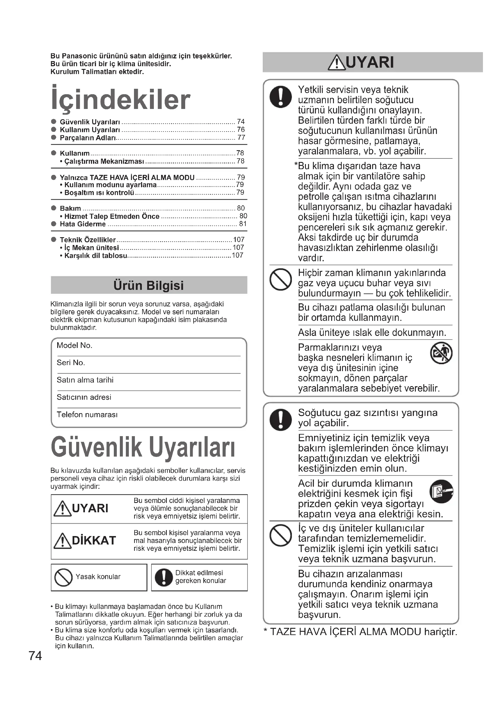 - Karşılık dil tablosu İçindekiler Güvenlik Uyarıları Ürün Bilgisi Klimanızla ilgili bir sorun veya sorunuz varsa, aşağıdaki bilgilere gerek duyacaksınız. Model ve seri numaraları elektrik ekipman kutusunun kapağındaki isim plakasında bulunmaktadır.Model No. Seri No. Satın alma tarihiSatıcının adresiTelefon numarası Yetkili servisin veya teknik uzmanın belirtilen soğutucu türünü kullandığını onaylayın. Belirtilen türden farklı türde bir soğutucunun kullanılması ürünün hasar görmesine, patlamaya, yaralanmalara, vb. yol açabilir. Bu klima dışarıdan taze hava almak için bir vantilatöre sahip değildir. Aynı odada gaz ve petrolle çalışan ısıtma cihazlarını kullanıyorsanız, bu cihazlar havadaki oksijeni hızla tükettiği için, kapı veya pencereleri sık sık açmanız gerekir. Aksi takdirde uç bir durumda havasızlıktan zehirlenme olasılığı vardır. Hiçbir zaman klimanın yakınlarında gaz veya uçucu buhar veya sıvı bulundurmayın — bu çok tehlikelidir. Bu cihazı patlama olasılığı bulunan bir ortamda kullanmayın. Asla üniteye ıslak elle dokunmayın. Parmaklarınızı veya başka nesneleri klimanın iç veya dış ünitesinin içine sokmayın, dönen parçalar yaralanmalara sebebiyet verebilir. Soğutucu gaz sızıntısı yangına yol açabilir. Emniyetiniz için temizlik veya bakım işlemlerinden önce klimayı kapattığınızdan ve elektriği kestiğinizden emin olun. Acil bir durumda klimanın elektriğini kesmek için fi şi prizden çekin veya sigortayı kapatın veya ana elektriği kesin. İç ve dış üniteler kullanıcılar tarafından temizlememelidir. Temizlik işlemi için yetkili satıcı veya teknik uzmana başvurun. Bu cihazın arızalanması durumunda kendiniz onarmaya çalışmayın. Onarım işlemi için yetkili satıcı veya teknik uzmana başvurun. Bu kılavuzda kullanılan aşağıdaki semboller kullanıcılar, servis personeli veya cihaz için riskli olabilecek durumlara karşı sizi uyarmak içindir: UYARI Bu sembol ciddi kişisel yaralanma veya ölümle sonuçlanabilecek bir risk veya emniyetsiz işlemi belirtir. DİKKAT Bu sembol kişisel yaralanma veya mal hasarıyla sonuçlanabilecek bir risk veya emniyetsiz işlemi belirtir.Yasak konularDikkat edilmesi gereken konular Bu Panasonic ürününü satın aldığınız için teşekkürler. Bu ürün ticari bir iç klima ünitesidir.Kurulum Talimatları ektedir.
