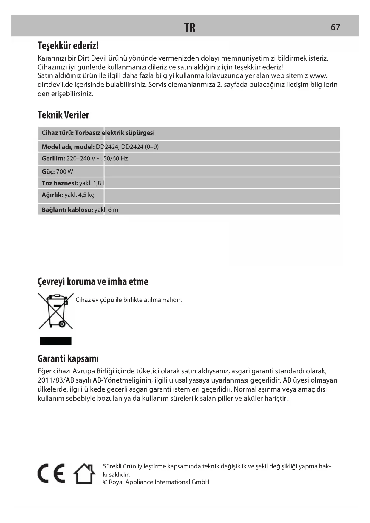 66Çevreyi koruma ve imha etme Cihaz ev çöpü ile birlikte atılmamalıdır. Garanti kapsamı Eğer cihazı Avrupa Birliği içinde tüketici olarak satın aldıysanız, asgari garanti standardı olarak, 2011/83/AB sayılı AB-Yönetmeliğinin, ilgili ulusal yasaya uyarlanması geçerlidir. AB üyesi olmayan ülkelerde, ilgili ülkede geçerli asgari garanti istemleri geçerlidir. Normal aşınma veya amaç dışı kullanım sebebiyle bozulan ya da kullanım süreleri kısalan piller ve aküler hariçtir. Sürekli ürün iyileştirme kapsamında teknik değişiklik ve şekil değişikliği yapma hak- kı saklıdır. © Royal Appliance International GmbH Teşekkür ederiz! Kararınızı bir Dirt Devil ürünü yönünde vermenizden dolayı memnuniyetimizi bildirmek isteriz. Cihazınızı iyi günlerde kullanmanızı dileriz ve satın aldığınız için teşekkür ederiz! Satın aldığınız ürün ile ilgili daha fazla bilgiyi kullanma kılavuzunda yer alan web sitemiz www. dirtdevil.de içerisinde bulabilirsiniz. Servis elemanlarımıza 2. sayfada bulacağınız iletişim bilgilerin- den erişebilirsiniz. Teknk Verler Cihaz türü: Torbasız elektrik süpürgesi Model adı, model: DD2424, DD2424 (0–9) Gerilim: 220–240 V ~, 50/60 Hz Güç: 700 W Toz haznesi: yakl. 1,8 l Ağırlık: yakl. 4,5 kg Bağlantı kablosu: yakl. 6 m