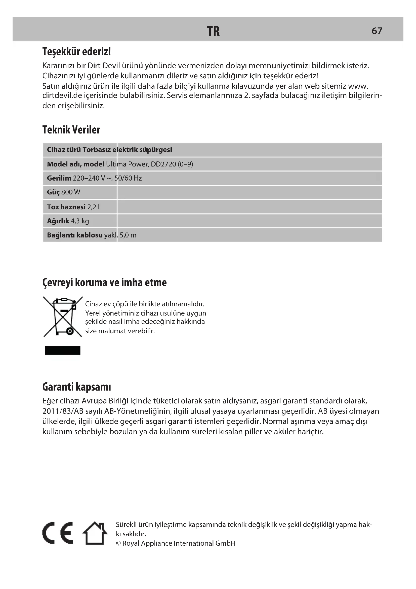 66Çevreyi koruma ve imha etme Cihaz ev çöpü ile birlikte atılmamalıdır. Yerel yönetiminiz cihazı usulüne uygun şekilde nasıl imha edeceğiniz hakkında size malumat verebilir. Garanti kapsamı Eğer cihazı Avrupa Birliği içinde tüketici olarak satın aldıysanız, asgari garanti standardı olarak, 2011/83/AB sayılı AB-Yönetmeliğinin, ilgili ulusal yasaya uyarlanması geçerlidir. AB üyesi olmayan ülkelerde, ilgili ülkede geçerli asgari garanti istemleri geçerlidir. Normal aşınma veya amaç dışı kullanım sebebiyle bozulan ya da kullanım süreleri kısalan piller ve aküler hariçtir. Sürekli ürün iyileştirme kapsamında teknik değişiklik ve şekil değişikliği yapma hak- kı saklıdır. © Royal Appliance International GmbH Teşekkür ederiz! Kararınızı bir Dirt Devil ürünü yönünde vermenizden dolayı memnuniyetimizi bildirmek isteriz. Cihazınızı iyi günlerde kullanmanızı dileriz ve satın aldığınız için teşekkür ederiz! Satın aldığınız ürün ile ilgili daha fazla bilgiyi kullanma kılavuzunda yer alan web sitemiz www. dirtdevil.de içerisinde bulabilirsiniz. Servis elemanlarımıza 2. sayfada bulacağınız iletişim bilgilerin- den erişebilirsiniz. Teknk Verler Cihaz türü Torbasız elektrik süpürgesi Model adı, model Ultima Power, DD2720 (0–9) Gerilim 220–240 V ~, 50/60 Hz Güç 800 W Toz haznesi 2,2 l Ağırlık 4,3 kg Bağlantı kablosu yakl. 5,0 m