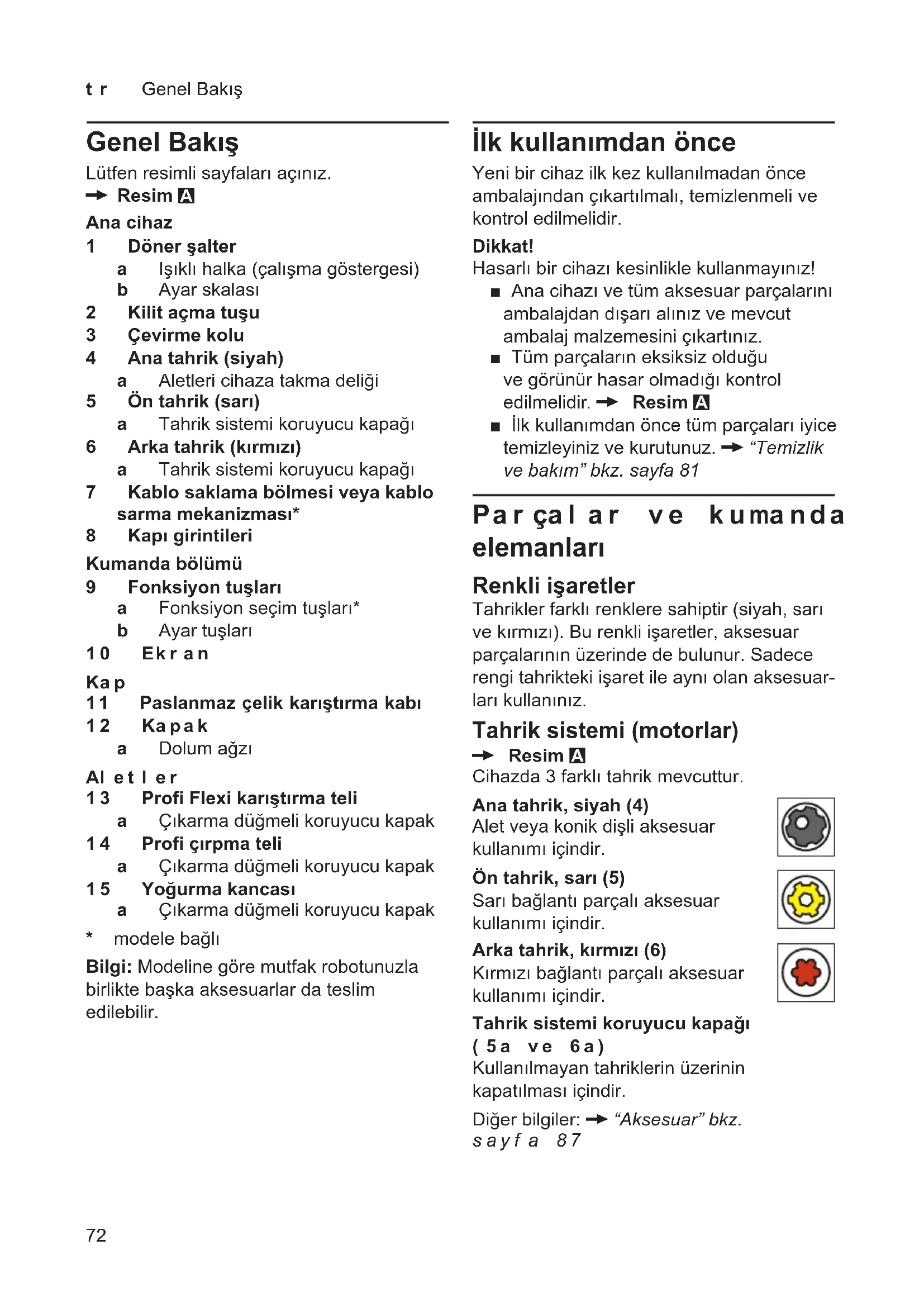 72 tr Genel Bakış İlk kullanımdan önce Yeni bir cihaz ilk kez kullanılmadan önce ambalajından çıkartılmalı, temizlenmeli ve kontrol edilmelidir. Dikkat! Hasarlı bir cihazı kesinlikle kullanmayınız! ■ Ana cihazı ve tüm aksesuar parçalarını ambalajdan dışarı alınız ve mevcut ambalaj malzemesini çıkartınız. ■ Tüm parçaların eksiksiz olduğu ve görünür hasar olmadığı kontrol edilmelidir. X Resim A ■ İlk kullanımdan önce tüm parçaları iyice temizleyiniz ve kurutunuz. X“Temizlik vebakım”bkz.sayfa81 Parçalar ve kumanda elemanları Renkli işaretler Tahrikler farklı renklere sahiptir (siyah, sarı ve kırmızı). Bu renkli işaretler, aksesuar parçalarının üzerinde de bulunur. Sadece rengi tahrikteki işaret ile aynı olan aksesuar- ları kullanınız. Tahrik sistemi (motorlar) X Resim A Cihazda 3 farklı tahrik mevcuttur. Ana tahrik, siyah (4) Alet veya konik dişli aksesuar kullanımı içindir. Ön tahrik, sarı (5) Sarı bağlantı parçalı aksesuar kullanımı içindir. Arka tahrik, kırmızı (6) Kırmızı bağlantı parçalı aksesuar kullanımı içindir. Tahrik sistemi koruyucu kapağı (5a ve 6a) Kullanılmayan tahriklerin üzerinin kapatılması içindir. Diğer bilgiler: X“Aksesuar”bkz. sayfa 87 Genel Bakış Lütfen resimli sayfaları açınız. X Resim A Ana cihaz 1 Döner şalter a Işıklı halka (çalışma göstergesi) b Ayar skalası 2 Kilit açma tuşu 3 Çevirme kolu 4 Ana tahrik (siyah) a Aletleri cihaza takma deliği 5 Ön tahrik (sarı) a Tahrik sistemi koruyucu kapağı 6 Arka tahrik (kırmızı) a Tahrik sistemi koruyucu kapağı 7 Kablo saklama bölmesi veya kablo sarma mekanizması* 8 Kapı girintileri Kumanda bölümü 9 Fonksiyon tuşları a Fonksiyon seçim tuşları* b Ayar tuşları 10 Ekran Kap 11 Paslanmaz çelik karıştırma kabı 12 Kapak a Dolum ağzı Aletler 13 Profi Flexi karıştırma teli a Çıkarma düğmeli koruyucu kapak 14 Profi çırpma teli a Çıkarma düğmeli koruyucu kapak 15 Yoğurma kancası a Çıkarma düğmeli koruyucu kapak