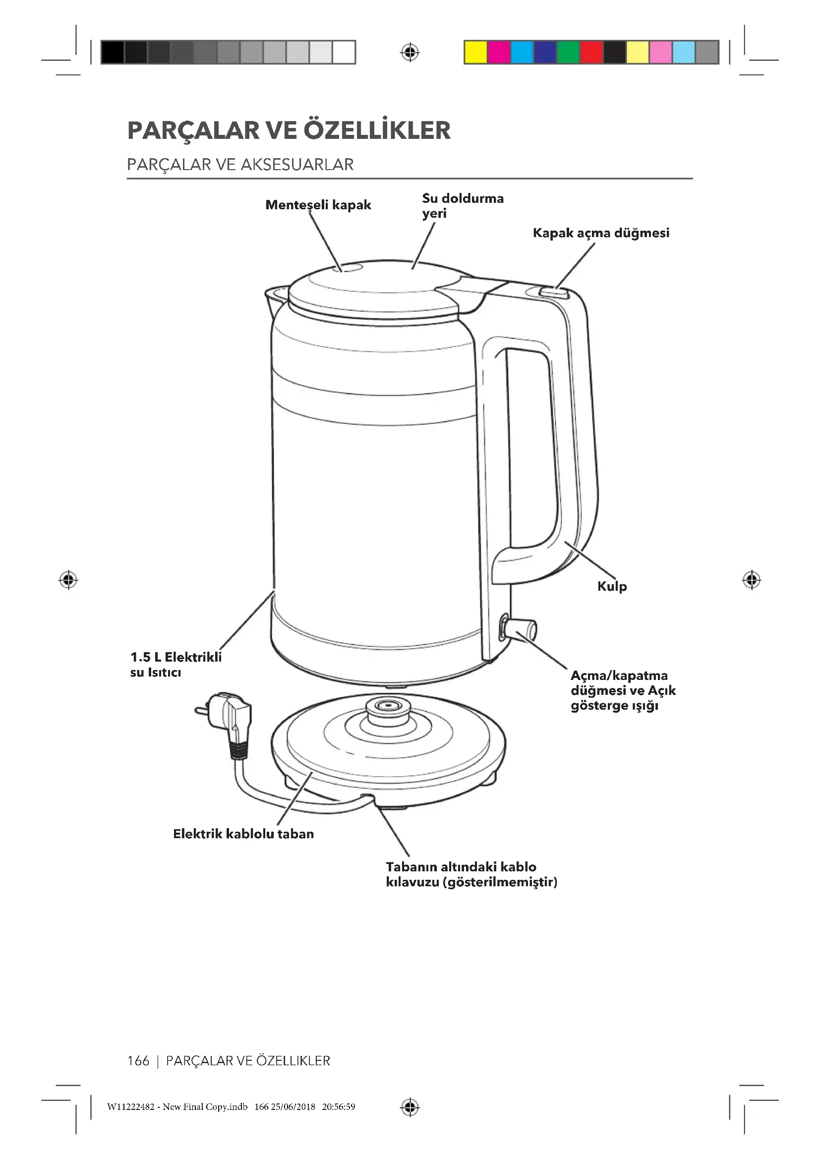 Su doldurma yeri Kapak açma düğmesi Menteşeli kapak Elektrik kablolu taban Açma/kapatma düğmesi ve Açık gösterge ışığı Kulp