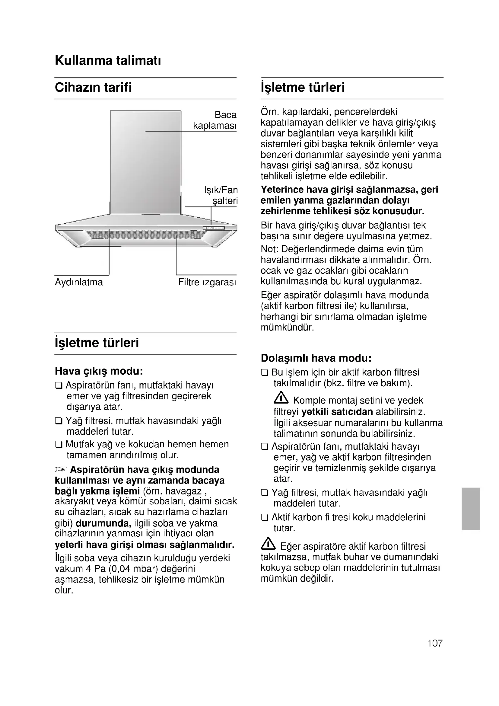 i sidorna i fästskenan med 2 skruvar.107 Cihaz∂n tarifi Kullanma talimat∂ ∑µletme türleri ∑µletme türleri Hava ç∂k∂µ modu: ❑ Aspiratörün fan∂, mutfaktaki havay∂ emer ve yaπ filtresinden geçirerek d∂µar∂ya atar. ❑ Yaπ filtresi, mutfak havas∂ndaki yaπl∂ maddeleri tutar. ❑ Mutfak yaπ ve kokudan hemen hemen tamamen ar∂nd∂r∂lm∂µ olur.