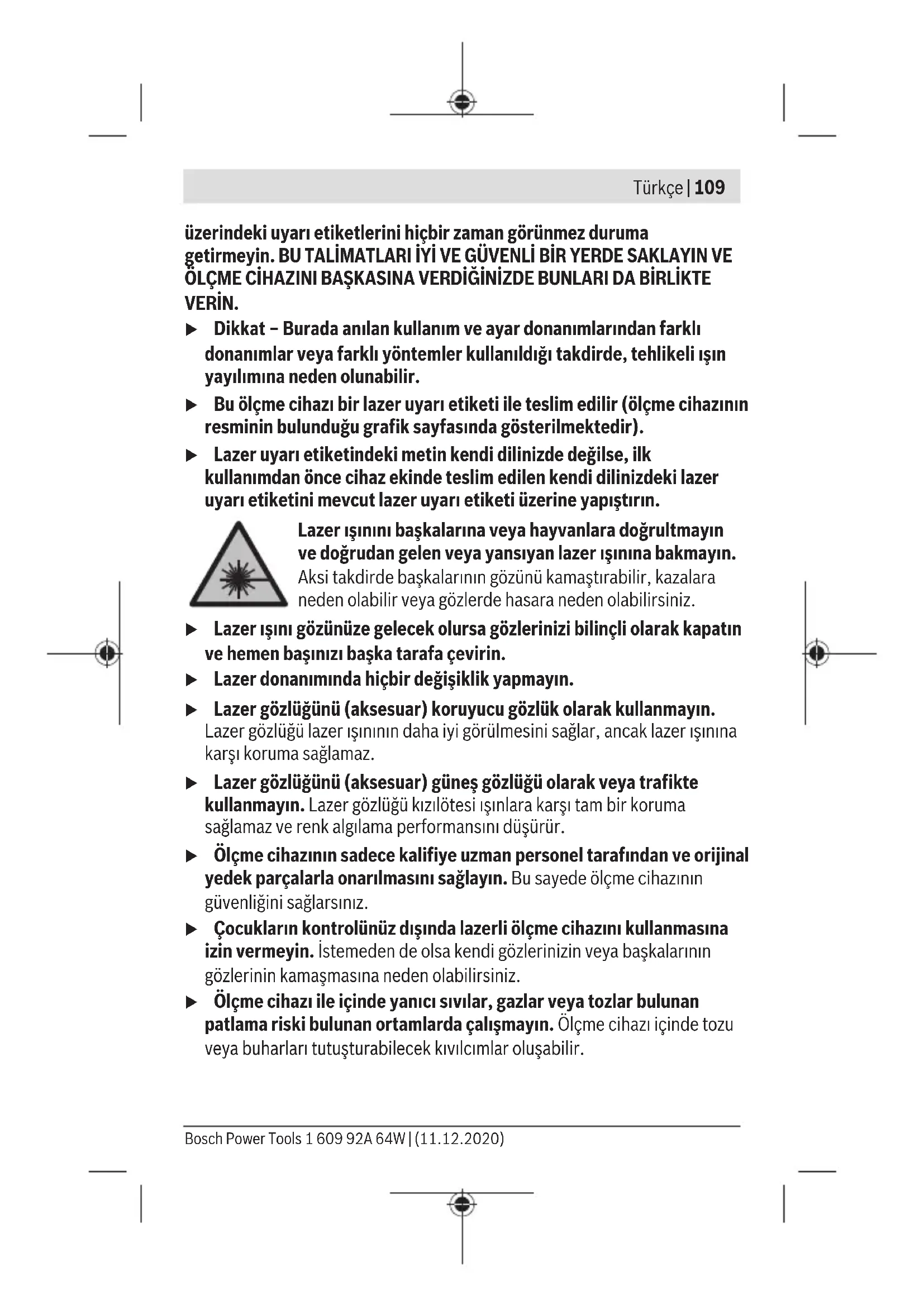 Τα όργανα μέτρησης, τα εξαρτήματα και οι συσκευασίες πρέπει να ανακυκλώνονται με τρόπο φιλικό προς το περιβάλλον. Μη ρίχνετε τα όργανα μέτρησης και τις μπαταρίες στα οικιακά απορρίμματα! Μόνο για χώρες τηςΕΕ: Σύμφωνα με την Ευρωπαϊκή οδηγία 2012/19/ΕΕ τα άχρηστα όργανα μέτρησης και σύμφωνα με την Ευρωπαϊκή οδηγία 2006/66/ΕΚ οι χαλασμένες ή χρησιμοποιημένες μπαταρίες δεν είναι πλέον υποχρεωτικό να συλλέγονται ξεχωριστά για να ανακυκλωθούν με τρόπο φιλικό προς το περιβάλλον. Türkçe Güvenlik talimatı Ölçme cihazı ile tehlikesiz ve güvenli biçimde çalışabilmek için bütün güvenlik talimatı ve uyarılar okunmalıdır. Ölçme cihazı bu güvenlik talimatına uygun olarak kullanılmazsa, ölçme cihazına entegre koruyucu donanımların işlevi kısıtlanabilir. Ölçme cihazı 1 609 92A 64W | (11.12.2020) Bosch Power ToolsTürkçe | 109 üzerindeki uyarı etiketlerini hiçbir zaman görünmez duruma getirmeyin. BU TALİMATLARI İYİ VE GÜVENLİ BİR YERDE SAKLAYIN VE ÖLÇME CİHAZINI BAŞKASINA VERDİĞİNİZDE BUNLARI DA BİRLİKTE VERİN. u Dikkat – Burada anılan kullanım ve ayar donanımlarından farklı donanımlar veya farklı yöntemler kullanıldığı takdirde, tehlikeli ışın yayılımına neden olunabilir. u Bu ölçme cihazı bir lazer uyarı etiketi ile teslim edilir (ölçme cihazının resminin bulunduğu grafik sayfasında gösterilmektedir). u Lazer uyarı etiketindeki metin kendi dilinizde değilse, ilk kullanımdan önce cihaz ekinde teslim edilen kendi dilinizdeki lazer uyarı etiketini mevcut lazer uyarı etiketi üzerine yapıştırın. Lazer ışınını başkalarına veya hayvanlara doğrultmayın ve doğrudan gelen veya yansıyan lazer ışınına bakmayın. Aksi takdirde başkalarının gözünü kamaştırabilir, kazalara neden olabilir veya gözlerde hasara neden olabilirsiniz. u Lazer ışını gözünüze gelecek olursa gözlerinizi bilinçli olarak kapatın ve hemen başınızı başka tarafa çevirin. u Lazer donanımında hiçbir değişiklik yapmayın. u Lazer gözlüğünü (aksesuar) koruyucu gözlük olarak kullanmayın. Lazer gözlüğü lazer ışınının daha iyi görülmesini sağlar, ancak lazer ışınına karşı koruma sağlamaz. u Lazer gözlüğünü (aksesuar) güneş gözlüğü olarak veya trafikte kullanmayın. Lazer gözlüğü kızılötesi ışınlara karşı tam bir koruma sağlamaz ve renk algılama performansını düşürür. u Ölçme cihazının sadece kalifiye uzman personel tarafından ve orijinal yedek parçalarla onarılmasını sağlayın. Bu sayede ölçme cihazının güvenliğini sağlarsınız. u Çocukların kontrolünüz dışında lazerli ölçme cihazını kullanmasına izin vermeyin. İstemeden de olsa kendi gözlerinizin veya başkalarının gözlerinin kamaşmasına neden olabilirsiniz. u Ölçme cihazı ile içinde yanıcı sıvılar, gazlar veya tozlar bulunan patlama riski bulunan ortamlarda çalışmayın. Ölçme cihazı içinde tozu veya buharları tutuşturabilecek kıvılcımlar oluşabilir. Bosch Power Tools 1 609 92A 64W | (11.12.2020)110 | Türkçe Mıknatısı, implantlara ve kalp pili veya insülin pompası gibi özel tıbbi cihazlara yaklaştırmayın. Mıknatıs,implantların ve tıbbi cihazların fonksiyonlarını olumsuz yönde etkileyebilecek bir alan oluşturur. u Ölçüm aletini manyetik veri taşıyıcılarından ve manyetik açıdan duyarlı cihazlardan uzak tutun. Mıknatısların etkisi ile geri dönüşü mümkün olmayan veri kayıpları ortaya çıkabilir. Ürün ve performans açıklaması Lütfen kullanma kılavuzunun ön kısmındaki resimlere dikkat edin. Usulüne uygun kullanım Bu ölçme cihazı yatay ve dikey çizgilerin belirlenmesi ve kontrol edilmesi için tasarlanmıştır. Bu ölçüm aleti, iç mekanlardaki kullanımlara uygundur. Şekli gösterilen elemanlar Şekli gösterilen elemanların numaraları ile grafik sayfasındaki ölçme cihazı resmindeki numaralar aynıdır. (1) Adaptör plakası 1/4" yuvası (2) Adaptör plakası hassas ayar vidası (3) Adaptör plakası (4) Açma/kapama şalteri (5) Lazer ışını çıkış deliği (6) Tripod