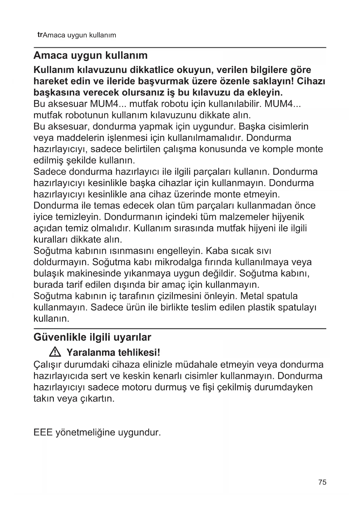 Amaca uygun kullanım Amaca uygun kullanım Kullanım kılavuzunu dikkatlice okuyun, verilen bilgilere göre hareket edin ve ileride başvurmak üzere özenle saklayın! Cihazı başkasına verecek olursanız iş bu kılavuzu da ekleyin. Bu aksesuar MUM4... mutfak robotu için kullanılabilir. MUM4... mutfak robotunun kullanım kılavuzunu dikkate alın. Bu aksesuar, dondurma yapmak için uygundur. Başka cisimlerin veya maddelerin işlenmesi için kullanılmamalıdır. Dondurma hazırlayıcıyı, sadece belirtilen çalışma konusunda ve komple monte edilmiş şekilde kullanın. Sadece dondurma hazırlayıcı ile ilgili parçaları kullanın. Dondurma hazırlayıcıyı kesinlikle başka cihazlar için kullanmayın. Dondurma hazırlayıcıyı kesinlikle ana cihaz üzerinde monte etmeyin. Dondurma ile temas edecek olan tüm parçaları kullanmadan önce iyice temizleyin. Dondurmanın içindeki tüm malzemeler hijyenik açıdan temiz olmalıdır. Kullanım sırasında mutfak hijyeni ile ilgili kuralları dikkate alın. Soğutma kabının ısınmasını engelleyin. Kaba sıcak sıvı doldurmayın. Soğutma kabı mikrodalga fırında kullanılmaya veya bulaşık makinesinde yıkanmaya uygun değildir. Soğutma kabını, burada tarif edilen dışında bir amaç için kullanmayın. Soğutma kabının iç tarafının çizilmesini önleyin. Metal spatula kullanmayın. Sadece ürün ile birlikte teslim edilen plastik spatulayı kullanın. Güvenlikle ilgili uyarılar W Yaralanma tehlikesi! Çalışır durumdaki cihaza elinizle müdahale etmeyin veya dondurma hazırlayıcıda sert ve keskin kenarlı cisimler kullanmayın. Dondurma hazırlayıcıyı sadece motoru durmuş ve şi çekilmiş durumdayken takın veya çıkartın. EEE yönetmeliğine uygundur.76 tr Genel Bakış Genel Bakış Lütfen resimli sayfaları açınız. X Resim A 1 Cihaz kapağı a İşaretler 2 Kuplajlı karıştırma kolu a Kavrayıcı pimler 3 Soğutma kabı 4 Soğutma kabı tutucusu 5 Plastik spatula Aşırı yüklenme emniyeti Dondurma hazırlayıcının aşırı yüklenmesi durumunda cihazınızın fazla zarar gör- mesini önlemek için, karıştırma kolunda bir kuplaj mevcuttur. Çalışma sırasında karıştırma kolu sabitlenirse bir çatlama sesi duyulabilir. Cihaz hemen kapatılmalıdır! Tarifte belirtilen miktarların aşılıp aşılmadığı kontrol edilmelidir. Gerekiyorsa malzeme- lerin bir kısmı çıkartılmalı ve cihaz tekrar çalıştırılmalıdır. Bilgi: Belirtilen işleme süresi bitmeden önce karıştırma kolundan çatlama sesi gelmesi dondurmanın zamanından erken hazır olduğunu gösterir. İlk kullanımdan önce Aksesuar ilk kez kullanılmadan önce amba- lajından çıkartılmalı, temizlenmeli ve kontrol edilmelidir. Dikkat! Hasarlı bir aksesuar kesinlikle kullanılmamalıdır. ■ Tüm aksesuar parçaları paketten çıkartılmalıdır. ■ Mevcut ambalaj malzemesi çıkartılmalıdır. ■ Birleştirilmiş parçalar ayrılarak tekil parçalar haline getirilmelidir. Burada “Hazırlık” altında açıklanan sıranın tersine hareket edilmelidir. ■ Tüm parçaların eksiksiz olduğu kontrol edilmelidir. X Resim A ■ Tüm parçaları görünür bir hasara karşı kontrol ediniz. ■ İlk kullanımdan önce tüm parçalar iyice temizlenmeli ve kurutulmalıdır. X“Bakımvegünlüktemizlik”bkz. sayfa77 Hazırlık Dondurma hazırlayıcıyı soğutma Dikkat! Dondurma hazırlamak için, soğutma kabının iyice temizlenmiş olması gerekir. X Resim sırası B