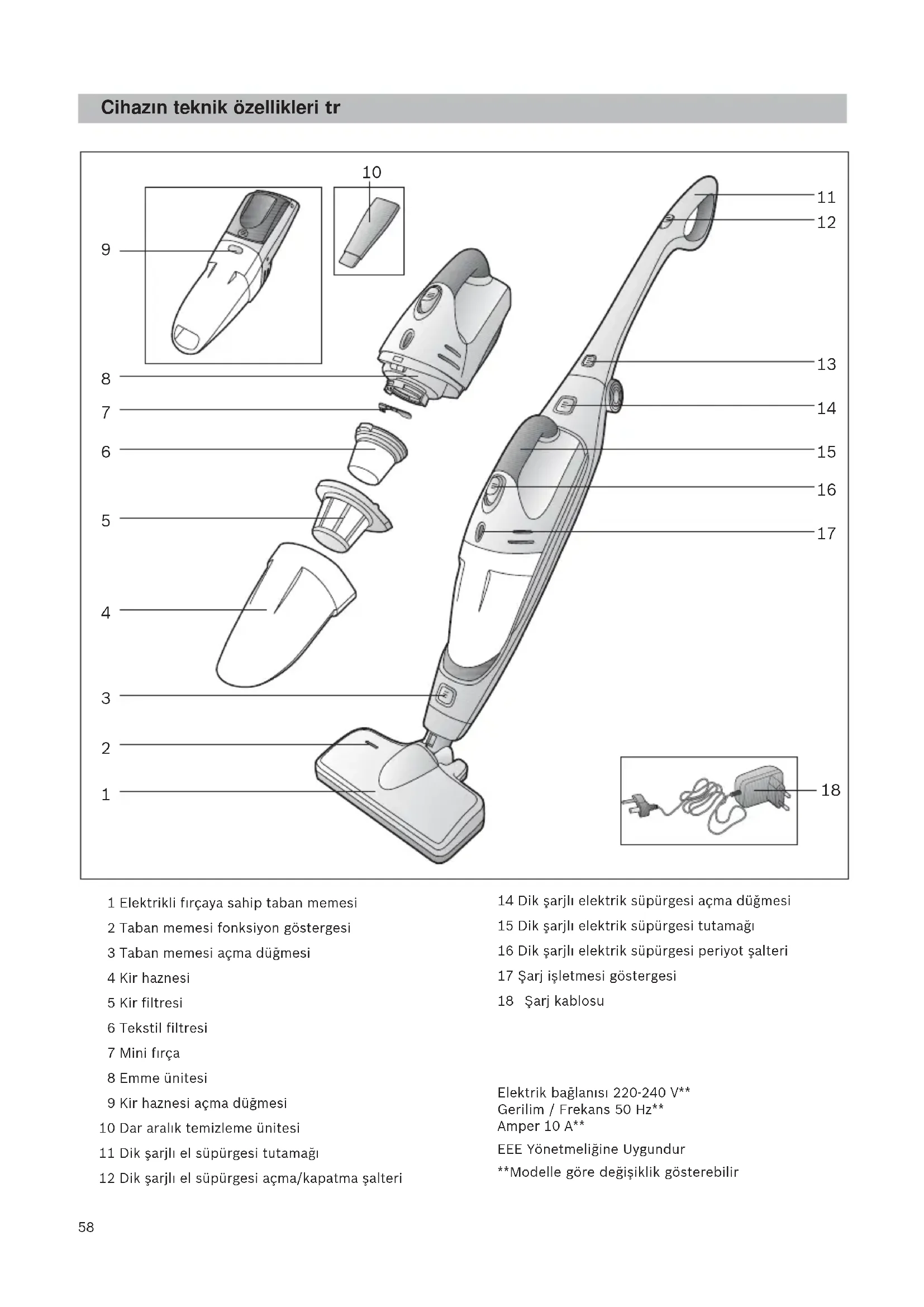 1 Elektrikli fırçaya sahip taban memesi 2 Taban memesi fonksiyon göstergesi 3 Taban memesi açma düğmesi 4 Kir haznesi 5 Kir filtresi 6 Tekstil filtresi 7 Mini fırça 8 Emme ünitesi 9 Kir haznesi açma düğmesi 10 Dar aralık temizleme ünitesi 11 Dik şarjlı el süpürgesi tutamağı 12 Dik şarjlı el süpürgesi açma/kapatma şalteri 14 Dik şarjlı elektrik süpürgesi açma düğmesi 15 Dik şarjlı elektrik süpürgesi tutamağı 16 Dik şarjlı elektrik süpürgesi periyot şalteri 17 Şarj işletmesi göstergesi 18 Şarj ünitesi 19 Şarj ünitesi zemine sabitleyici 20 Şarj kablosu Elektrik bağlanısı 220-240 V** Gerilim / Frekans 50 Hz** Amper 10 A** EEE Yönetmeliğine Uygundur **Modelle göre değişiklik gösterebilir Şarj kablosu Cihaz∂n teknik özellikleri tr59