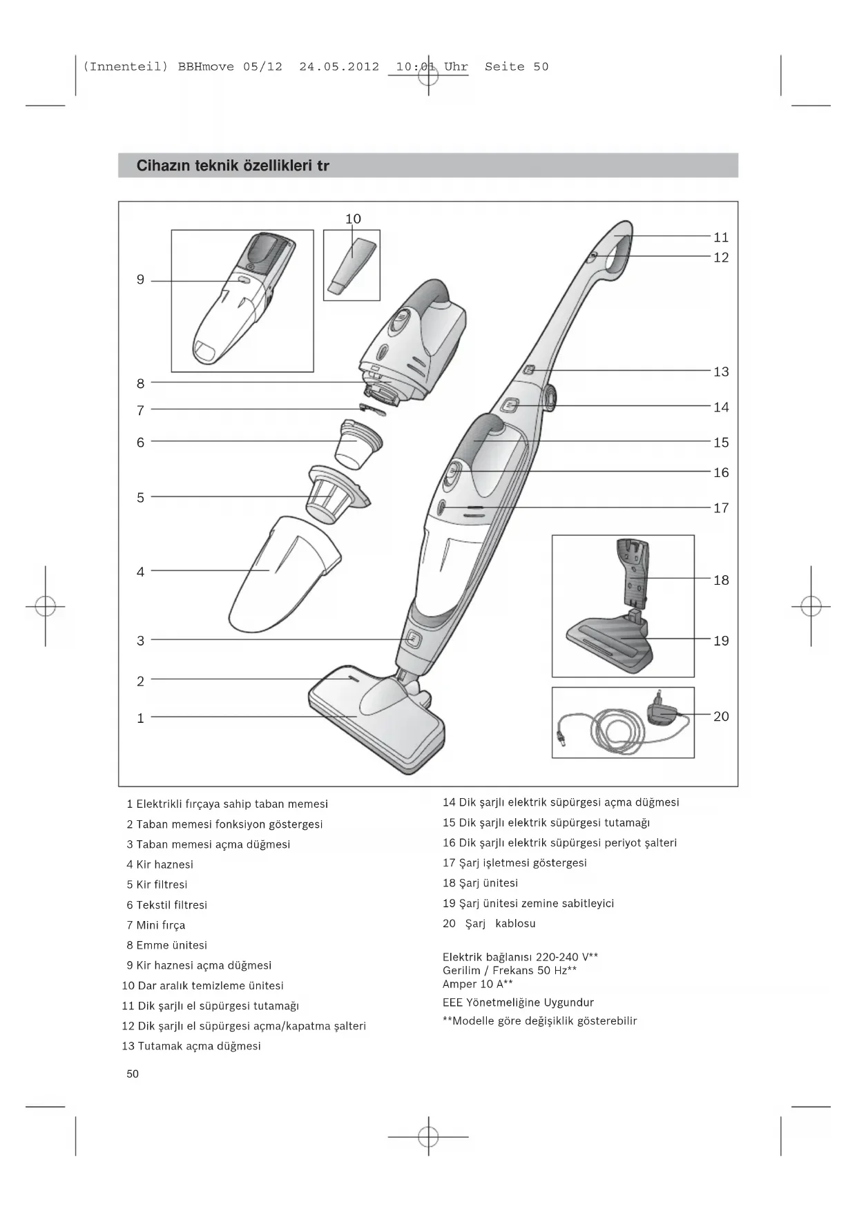 (Innenteil) BBHmove 05/12 24.05.2012 10:01 Uhr Seite 4950 Cihaz∂n teknik özellikleri tr 1 Elektrikli fırçaya sahip taban memesi 2 Taban memesi fonksiyon göstergesi 3 Taban memesi açma düğmesi 4 Kir haznesi 5 Kir filtresi 6 Tekstil filtresi 7 Mini fırça 8 Emme ünitesi 9 Kir haznesi açma düğmesi 10 Dar aralık temizleme ünitesi 11 Dik şarjlı el süpürgesi tutamağı 12 Dik şarjlı el süpürgesi açma/kapatma şalteri 13 Tutamak açma düğmesi 14 Dik şarjlı elektrik süpürgesi açma düğmesi 15 Dik şarjlı elektrik süpürgesi tutamağı 16 Dik şarjlı elektrik süpürgesi periyot şalteri 17 Şarj işletmesi göstergesi 18 Şarj ünitesi 19 Şarj ünitesi zemine sabitleyici 20 Şarj kablosu Elektrik bağlanısı 220-240 V** Gerilim / Frekans 50 Hz** Amper 10 A** EEE Yönetmeliğine Uygundur **Modelle göre değişiklik gösterebilir