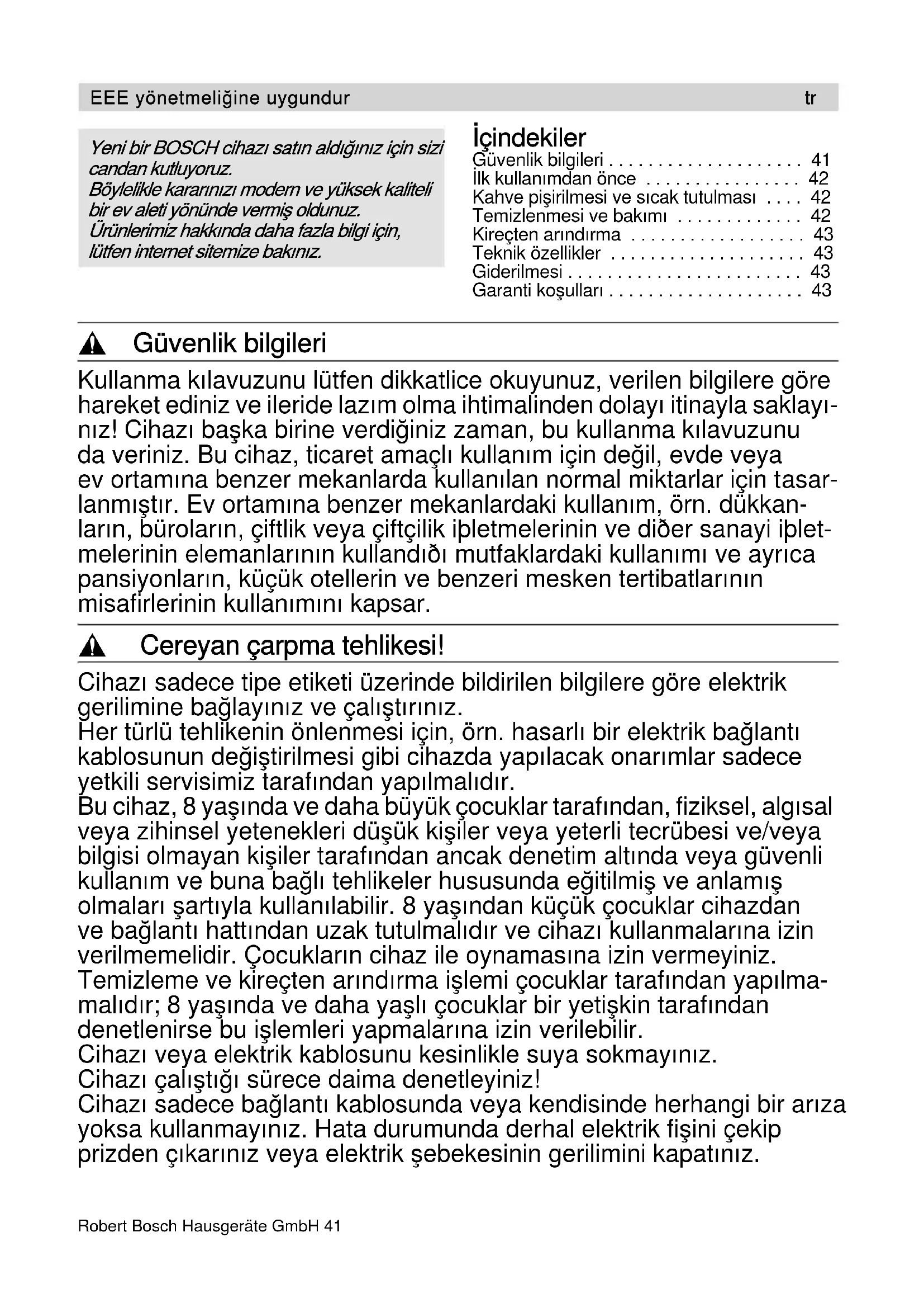 - Garanti koşulları , Güvenlik bilgileri Kullanma kılavuzunu lütfen dikkatlice okuyunuz, verilen bilgilere göre hareket ediniz ve ileride lazım olma ihtimalinden dolayı itinayla saklayı- nız! Cihazı başka birine verdiğiniz zaman, bu kullanma kılavuzunu da veriniz. Bu cihaz, ticaret amaçlı kullanım için değil, evde veya ev ortamına benzer mekanlarda kullanılan normal miktarlar için tasar- lanmıştır. Ev ortamına benzer mekanlardaki kullanım, örn. dükkan- ların, büroların, çiftlik veya çiftçilik iþletmelerinin ve diðer sanayi iþlet- melerinin elemanlarının kullandıðı mutfaklardaki kullanımı ve ayrıca pansiyonların, küçük otellerin ve benzeri mesken tertibatlarının misafirlerinin kullanımını kapsar. , Cereyan çarpma tehlikesi! Cihazı sadece tipe etiketi üzerinde bildirilen bilgilere göre elektrik gerilimine bağlayınız ve çalıştırınız. Her türlü tehlikenin önlenmesi için, örn. hasarlı bir elektrik bağlantı kablosunun değiştirilmesi gibi cihazda yapılacak onarımlar sadece yetkili servisimiz tarafından yapılmalıdır. Bu cihaz, 8 yaşında ve daha büyük çocuklar tarafından, fiziksel, algısal veya zihinsel yetenekleri düşük kişiler veya yeterli tecrübesi ve/veya bilgisi olmayan kişiler tarafından ancak denetim altında veya güvenli kullanım ve buna bağlı tehlikeler hususunda eğitilmiş ve anlamış olmaları şartıyla kullanılabilir. 8 yaşından küçük çocuklar cihazdan ve bağlantı hattından uzak tutulmalıdır ve cihazı kullanmalarına izin verilmemelidir. Çocukların cihaz ile oynamasına izin vermeyiniz. Temizleme ve kireçten arındırma işlemi çocuklar tarafından yapılma- malıdır; 8 yaşında ve daha yaşlı çocuklar bir yetişkin tarafından denetlenirse bu işlemleri yapmalarına izin verilebilir. Cihazı veya elektrik kablosunu kesinlikle suya sokmayınız. Cihazı çalıştığı sürece daima denetleyiniz! Cihazı sadece bağlantı kablosunda veya kendisinde herhangi bir arıza yoksa kullanmayınız. Hata durumunda derhal elektrik fişini çekip prizden çıkarınız veya elektrik şebekesinin gerilimini kapatınız. p. 43
