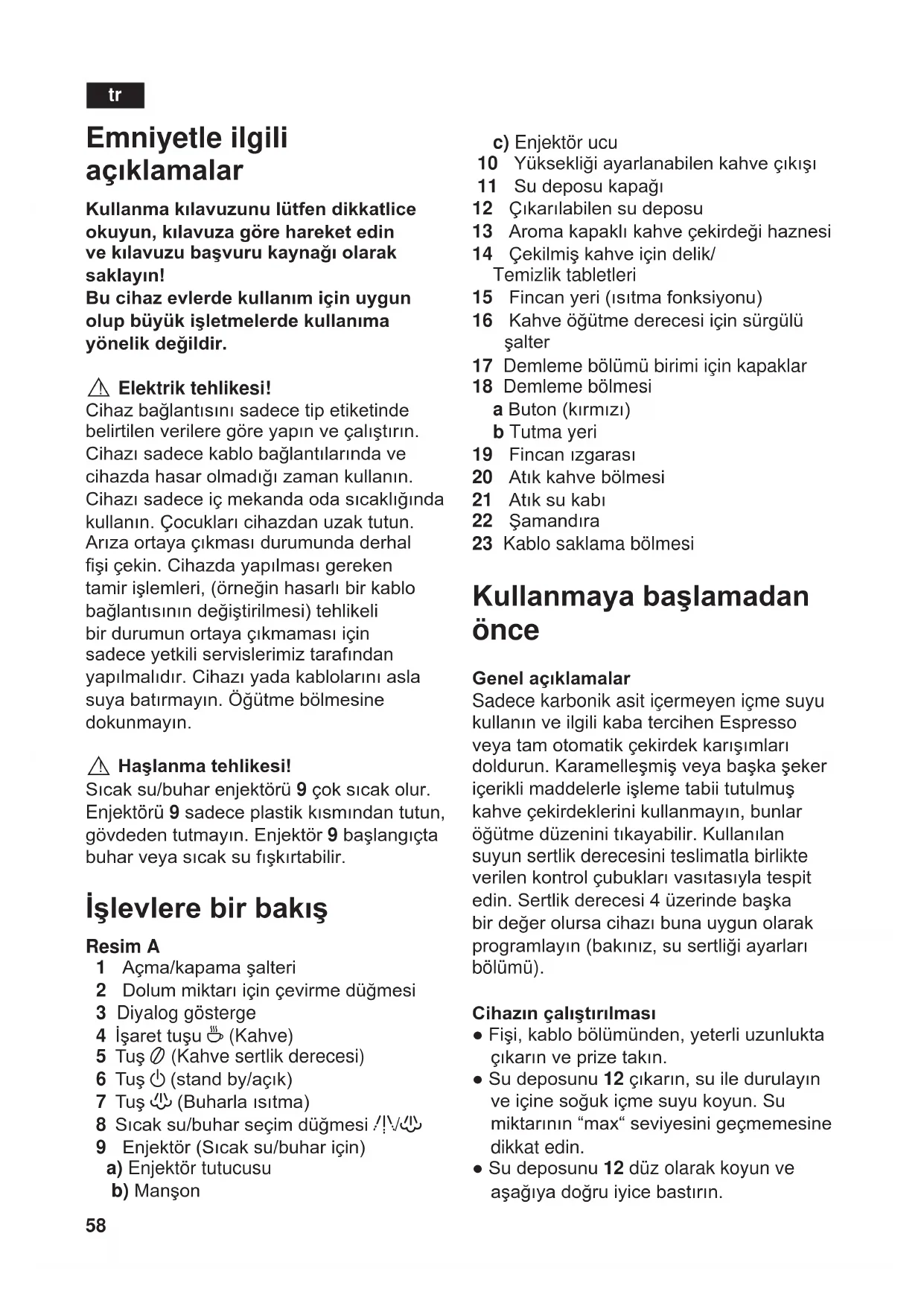 ! Haşlanma tehlikesi! Sıcaksu/buharenjektörü9çoksıcakolur. Enjektörü 9sadeceplastikkısmındantutun, gövdedentutmayın.Enjektör9başlangıçta buharveyasıcaksufışkırtabilir. İşlevlere bir bakış Resim A 1 Açma/kapamaşalteri 2 Dolummiktarıiçinçevirmedüğmesi 3 Diyalog gösterge 4 İşarettuşu4 (Kahve) 5 Tuş5 (Kahve sertlik derecesi) 6 Tuşa(standby/açık) 7 Tuşh(Buharlaısıtma) 8 Sıcaksu/buharseçimdüğmesig/h 9 Enjektör(Sıcaksu/buhariçin) a) Enjektör tutucusu b)Manşon c) Enjektör ucu 10 Yüksekliğiayarlanabilenkahveçıkışı 11 Sudeposukapağı 12 Çıkarılabilensudeposu 13 Aromakapaklıkahveçekirdeğihaznesi 14 Çekilmişkahveiçindelik/ Temizlik tabletleri 15 Fincanyeri(ısıtmafonksiyonu) 16 Kahveöğütmederecesiiçinsürgülü şalter 17 Demleme bölümü birimi için kapaklar 18 Demleme bölmesi aButon(kırmızı) b Tutma yeri 19 Fincanızgarası 20 Atıkkahvebölmesi 21 Atıksukabı 22 Şamandıra 23 Kablo saklama bölmesi Kullanmaya başlamadan önce Genel açıklamalar Sadece karbonik asit içermeyen içme suyu kullanınveilgilikabatercihenEspresso veyatamotomatikçekirdekkarışımları doldurun.Karamelleşmişveyabaşkaşeker içeriklimaddelerleişlemetabiitutulmuş kahveçekirdeklerinikullanmayın,bunlar öğütmedüzeninitıkayabilir.Kullanılan suyun sertlik derecesini teslimatla birlikte verilenkontrolçubuklarıvasıtasıylatespit edin.Sertlikderecesi4üzerindebaşka birdeğerolursacihazıbunauygunolarak programlayın(bakınız,susertliğiayarları bölümü). Cihazın çalıştırılması ●Fişi,kablobölümünden,yeterliuzunlukta çıkarınveprizetakın. ●Sudeposunu12çıkarın,suiledurulayın veiçinesoğukiçmesuyukoyun.Su miktarının“max“seviyesinigeçmemesine dikkat edin. ●Sudeposunu12 düz olarak koyun ve aşağıyadoğruiyicebastırın. tr59 ●Kahveçekirdeğibölmesinikahve çekirdekleriyle doldurun. ●Açma/kapamaşalterini1, I konumuna getirin. a„standby“tuşukırmızıyanar. ●8sıcaksu/buharseçimdüğmesinin“O“ konumundaolmasınadikkatedin. ●atuşunabasın.Diyaloggöstergede8 yanıpsöner. İlkçalıştırmaesnasındacihazdakisuhattı sistemininhaladoluolmasıgerekir. ●Enjektörün9altınabirncankoyun. ●8sıcaksu/buharseçimdüğmesinig/ hkonumunagetirin,ncanabirazsu akacaktır. Düğmeyi“O“ konumuna getirin. ●Şimdituş ayanıpsöner,cihazkendini durularveısıtır. Tümdörttuş4, 5, a, h ve kahve sertlik derecegöstergesidigitalekrandayandığı zaman cihaz çalışmaya hazırdır. iCihazınfabrikaçıkışayarları,optimum performanssergileyecekşekilde programlanmıştır. Not:Cihazilkdefakullanılıyorsaveyauzun sürekullanılmamışsailkncankahvenin aromasıtamdeğildirvebundandolayıilk ncaniçilmemelidir. Kumanda elemanları 1 Fiş Cihazınarkatarafındakiaçma/kapama şalteri1elektrikgirişiniaçarveyakapatır. Elektrikşalterininaçılmasındansonraa tuşusönükkırmızıdayanar.Cihaz„stand by“- konumunda bekler. Dikkat Cihaz çalışır konumundayken açma/ kapama şalterine dokunmayın. Cihazı sadece „stand by“- konumunda iken kapatın. 2 Dolum miktarını ayarlamak için çevirme düğmesi Çevirmedüğmesiyardımıylasumiktarı küçükbirncandanEbüyükbirncana kadar F kademesiz olarak ayarlanabilir. 3 Diyalog gösterge Diyaloggöstergesimgelervasıtasıyla cihazınayarlarınıvemesajlarınıgösterir. 6 Kahvemiktarı2ncan 7 Yanıpsöner Çekilmişkahvebölmesi 14açık 7Yanıyor Çekilmişkahve/ temizleme 5 Yanıyor Kahvesertlikderecesi: haf 55Yanıyor Kahvesertlikderecesi: orta 555Yanıyor Kahvesertlikderecesi: sert 555YanıpsönerKahveçekirdeğibölmesi boş S Yanıyor Servis:Cihazkireçten arındırmalı/temizlenmeli S Yanıp Servisprogramıdevrede 9 Yanıyor Suhaznesini12 doldurun