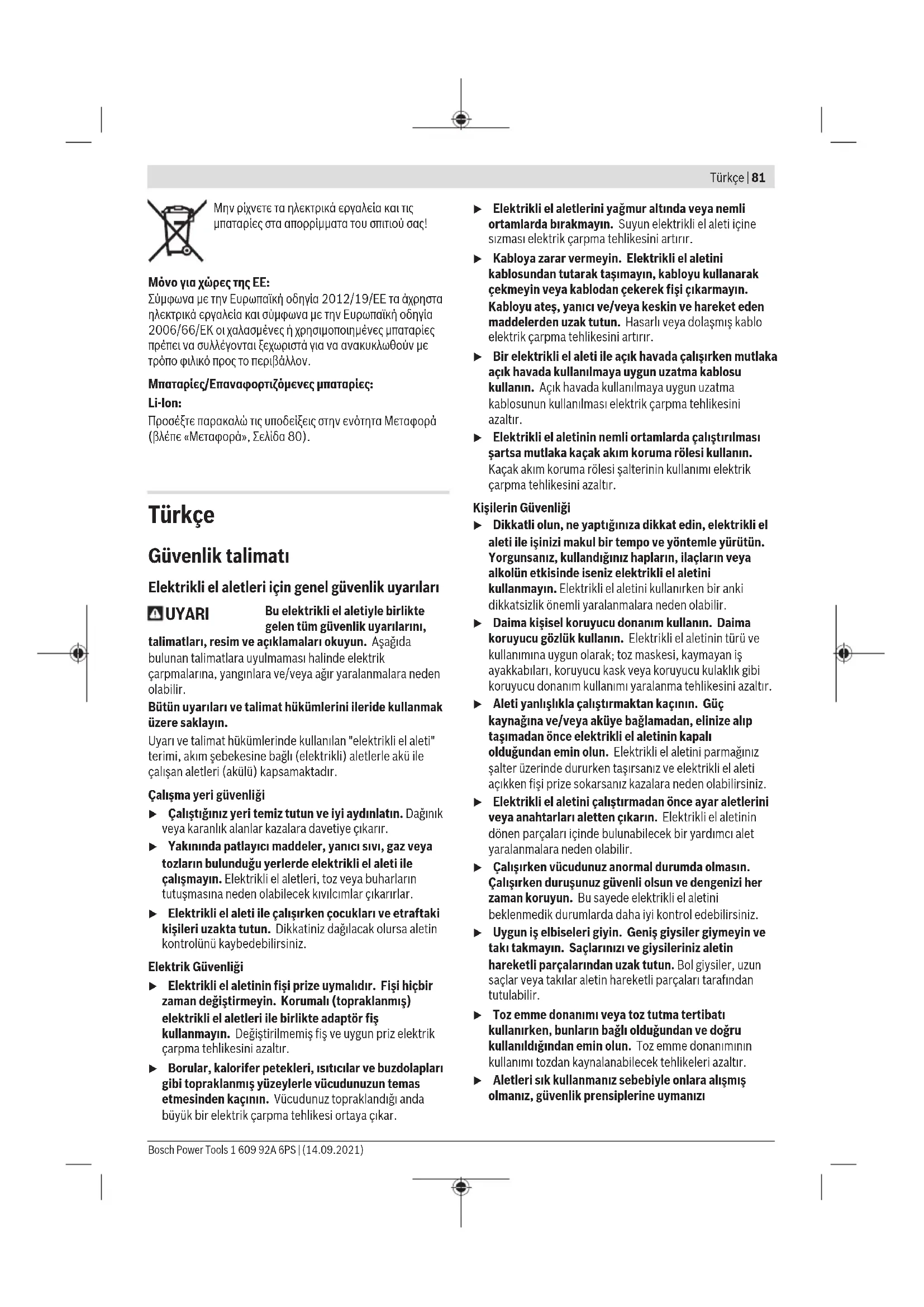 Τα ηλεκτρικά εργαλεία, οι μπαταρίες, τα εξαρτήματα και οι συσκευασίες πρέπει να ανακυκλώνονται με τρόπο φιλικό προς το περιβάλλον. 1 609 92A 6PS | (14.09.2021) Bosch Power ToolsTürkçe | 81 Μην ρίχνετε τα ηλεκτρικά εργαλεία και τις μπαταρίες στα απορρίμματα του σπιτιού σας! Μόνο για χώρες τηςΕΕ: Σύμφωνα με την Ευρωπαϊκή οδηγία 2012/19/ΕΕ τα άχρηστα ηλεκτρικά εργαλεία και σύμφωνα με την Ευρωπαϊκή οδηγία 2006/66/ΕΚ οι χαλασμένες ή χρησιμοποιημένες μπαταρίες πρέπει να συλλέγονται ξεχωριστά για να ανακυκλωθούν με τρόπο φιλικό προς το περιβάλλον. Μπαταρίες/Επαναφορτιζόμενες μπαταρίες: Li-Ion: Προσέξτε παρακαλώ τις υποδείξεις στην ενότητα Μεταφορά (βλέπε «Μεταφορά», Σελίδα80). Türkçe Güvenlik talimatı Elektrikli el aletleri için genel güvenlik uyarıları UYARI Bu elektrikli el aletiyle birlikte gelen tüm güvenlik uyarılarını, talimatları, resim ve açıklamaları okuyun. Aşağıda bulunan talimatlara uyulmaması halinde elektrik çarpmalarına, yangınlara ve/veya ağır yaralanmalara neden olabilir. Bütün uyarıları ve talimat hükümlerini ileride kullanmak üzere saklayın. Uyarı ve talimat hükümlerinde kullanılan "elektrikli el aleti" terimi, akım şebekesine bağlı (elektrikli) aletlerle akü ile çalışan aletleri (akülü) kapsamaktadır. Çalışma yeri güvenliği u Çalıştığınız yeri temiz tutun ve iyi aydınlatın. Dağınık veya karanlık alanlar kazalara davetiye çıkarır. u Yakınında patlayıcı maddeler, yanıcı sıvı, gaz veya tozların bulunduğu yerlerde elektrikli el aleti ile çalışmayın. Elektrikli el aletleri, toz veya buharların tutuşmasına neden olabilecek kıvılcımlar çıkarırlar. u Elektrikli el aleti ile çalışırken çocukları ve etraftaki kişileri uzakta tutun. Dikkatiniz dağılacak olursa aletin kontrolünü kaybedebilirsiniz. Elektrik Güvenliği u Elektrikli el aletinin fişi prize uymalıdır. Fişi hiçbir zaman değiştirmeyin. Korumalı (topraklanmış) elektrikli el aletleri ile birlikte adaptör fiş kullanmayın. Değiştirilmemiş fiş ve uygun priz elektrik çarpma tehlikesini azaltır. u Borular, kalorifer petekleri, ısıtıcılar ve buzdolapları gibi topraklanmış yüzeylerle vücudunuzun temas etmesinden kaçının. Vücudunuz topraklandığı anda büyük bir elektrik çarpma tehlikesi ortaya çıkar. u Elektrikli el aletlerini yağmur altında veya nemli ortamlarda bırakmayın. Suyun elektrikli el aleti içine sızması elektrik çarpma tehlikesini artırır. u Kabloya zarar vermeyin. Elektrikli el aletini kablosundan tutarak taşımayın, kabloyu kullanarak çekmeyin veya kablodan çekerek fişi çıkarmayın. Kabloyu ateş, yanıcı ve/veya keskin ve hareket eden maddelerden uzak tutun. Hasarlı veya dolaşmış kablo elektrik çarpma tehlikesini artırır. u Bir elektrikli el aleti ile açık havada çalışırken mutlaka açık havada kullanılmaya uygun uzatma kablosu kullanın. Açık havada kullanılmaya uygun uzatma kablosunun kullanılması elektrik çarpma tehlikesini azaltır. u Elektrikli el aletinin nemli ortamlarda çalıştırılması şartsa mutlaka kaçak akım koruma rölesi kullanın. Kaçak akım koruma rölesi şalterinin kullanımı elektrik çarpma tehlikesini azaltır. Kişilerin Güvenliği u Dikkatli olun, ne yaptığınıza dikkat edin, elektrikli el aleti ile işinizi makul bir tempo ve yöntemle yürütün. Yorgunsanız, kullandığınız hapların, ilaçların veya alkolün etkisinde iseniz elektrikli el aletini kullanmayın. Elektrikli el aletini kullanırken bir anki dikkatsizlik önemli yaralanmalara neden olabilir. u Daima kişisel koruyucu donanım kullanın. Daima koruyucu gözlük kullanın. Elektrikli el aletinin türü ve kullanımına uygun olarak; toz maskesi, kaymayan iş ayakkabıları, koruyucu kask veya koruyucu kulaklık gibi koruyucu donanım kullanımı yaralanma tehlikesini azaltır. u Aleti yanlışlıkla çalıştırmaktan kaçının. Güç kaynağına ve/veya aküye bağlamadan, elinize alıp taşımadan önce elektrikli el aletinin kapalı olduğundan emin olun. Elektrikli el aletini parmağınız şalter üzerinde dururken taşırsanız ve elektrikli el aleti açıkken fişi prize sokarsanız kazalara neden olabilirsiniz. u Elektrikli el aletini çalıştırmadan önce ayar aletlerini veya anahtarları aletten çıkarın. Elektrikli el aletinin dönen parçaları içinde bulunabilecek bir yardımcı alet yaralanmalara neden olabilir. u Çalışırken vücudunuz anormal durumda olmasın. Çalışırken duruşunuz güvenli olsun ve dengenizi her zaman koruyun. Bu sayede elektrikli el aletini beklenmedik durumlarda daha iyi kontrol edebilirsiniz. u Uygun iş elbiseleri giyin. Geniş giysiler giymeyin ve takı takmayın. Saçlarınızı ve giysileriniz aletin hareketli parçalarından uzak tutun. Bol giysiler, uzun saçlar veya takılar aletin hareketli parçaları tarafından tutulabilir. u Toz emme donanımı veya toz tutma tertibatı kullanırken, bunların bağlı olduğundan ve doğru kullanıldığından emin olun. Toz emme donanımının kullanımı tozdan kaynalanabilecek tehlikeleri azaltır. u Aletleri sık kullanmanız sebebiyle onlara alışmış olmanız, güvenlik prensiplerine uymanızı Bosch Power Tools 1 609 92A 6PS | (14.09.2021)82 | Türkçe önlememelidir. Dikkatsiz bir hareket, bir anda ciddi yaralanmalara yol açabilir. Elektrikli el aletlerinin kullanımı ve bakımı u Elektrikli el aletini aşırı ölçüde zorlamayın. Yaptı