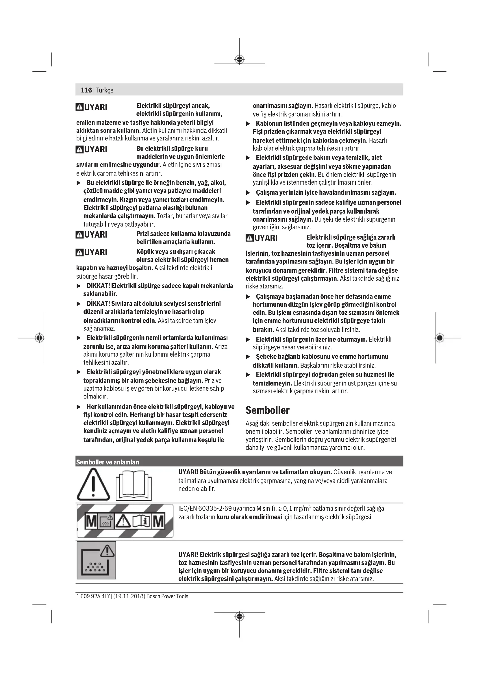 Ο απορροφητήρας, τα εξαρτήματα και οι συσκευασίες πρέπει να ανακυκλώνονται με τρόπο φιλικό προς το περιβάλλον. Μη πετάτε τον απορροφητήρα στα οικιακά απορρίμματα! Μόνο για χώρες τηςΕΕ: Σύμφωνα με την Ευρωπαϊκή Οδηγία 2012/19/ΕΕ σχετικά με τις παλιές ηλεκτρικές και ηλεκτρονικές συσκευές και τη μεταφορά της οδηγίας αυτής σε εθνικό δίκαιο δεν είναι πλέον υποχρεωτικό, οι άχρηστοι απορροφητήρες να συλλέγονται ξεχωριστά για να ανακυκλωθούν με τρόπο φιλικό προς το περιβάλλον. Türkçe Elektrikli süpürgeler için güvenlik talimatı Bütün güvenlik talimatını ve uyarıları okuyun. Güvenlik talimatlarına ve uyarılara uyulmadığı takdirde elektrik çarpmasına, yangına ve/veya ciddi yaralanmalara neden olunabilir. Bütün uyarıları ve talimat hükümlerini ileride kullanmak üzere saklayın. u Bu elektrikli süpürge çocukların ve fiziksel, duyusal veya zihinsel yetenekleri sınırlı veya yeterli deneyim ve bilgisi olmayan kişilerin kullanması için tasarlanmamıştır. Aksi takdirde hatalı kullanım ve yaralanma tehlikesi vardır. u Çocuklara göz kulak olun. Bu yolla çocukların elektrikli süpürge ile oynamasını önlersiniz.. UYARI Hiçbir zaman asbest içeren maddeleri emdirmeyin. Asbest kanserojen kabul edilir. Türkçe | 115 Bosch Power Tools 1 609 92A 4LY | (19.11.2018)116 | Türkçe 1 609 92A 4LY | (19.11.2018) Bosch Power Tools UYARI Elektrikli süpürgeyi ancak, elektrikli süpürgenin kullanımı, emilen malzeme ve tasfiye hakkında yeterli bilgiyi aldıktan sonra kullanın. Aletin kullanımı hakkında dikkatli bilgi edinme hatalı kullanma ve yaralanma riskini azaltır. UYARI Bu elektrikli süpürge kuru maddelerin ve uygun önlemlerle sıvıların emilmesine uygundur. Aletin içine sıvı sızması elektrik çarpma tehlikesini artırır. u Bu elektrikli süpürge ile örneğin benzin, yağ, alkol, çözücü madde gibi yanıcı veya patlayıcı maddeleri emdirmeyin. Kızgın veya yanıcı tozları emdirmeyin. Elektrikli süpürgeyi patlama olasılığı bulunan mekanlarda çalıştırmayın. Tozlar, buharlar veya sıvılar tutuşabilir veya patlayabilir. UYARI Prizi sadece kullanma kılavuzunda belirtilen amaçlarla kullanın. UYARI Köpük veya su dışarı çıkacak olursa elektrikli süpürgeyi hemen kapatın ve hazneyi boşaltın. Aksi takdirde elektrikli süpürge hasar görebilir. u DİKKAT! Elektrikli süpürge sadece kapalı mekanlarda saklanabilir. u DİKKAT! Sıvılara ait doluluk seviyesi sensörlerini düzenli aralıklarla temizleyin ve hasarlı olup olmadıklarını kontrol edin. Aksi takdirde tam işlev sağlanamaz. u Elektrikli süpürgenin nemli ortamlarda kullanılması zorunlu ise, arıza akımı koruma şalteri kullanın. Arıza akımı koruma şalterinin kullanımı elektrik çarpma tehlikesini azaltır. u Elektrikli süpürgeyi yönetmeliklere uygun olarak topraklanmış bir akım şebekesine bağlayın. Priz ve uzatma kablosu işlev gören bir koruyucu iletkene sahip olmalıdır. u Her kullanımdan önce elektrikli süpürgeyi, kabloyu ve fişi kontrol edin. Herhangi bir hasar tespit ederseniz elektrikli süpürgeyi kullanmayın. Elektrikli süpürgeyi kendiniz açmayın ve aletin kalifiye uzman personel tarafından, orijinal yedek parça kullanma koşulu ile onarılmasını sağlayın. Hasarlı elektrikli süpürge, kablo ve fiş elektrik çarpma riskini artırır. u Kablonun üstünden geçmeyin veya kabloyu ezmeyin. Fişi prizden çıkarmak veya elektrikli süpürgeyi hareket ettirmek için kablodan çekmeyin. Hasarlı kablolar elektrik çarpma tehlikesini artırır. u Elektrikli süpürgede bakım veya temizlik, alet ayarları, aksesuar değişimi veya sökme yapmadan önce fişi prizden çekin. Bu önlem elektrikli süpürgenin yanlışlıkla ve istenmeden çalıştırılmasını önler. u Çalışma yerinizin iyice havalandırılmasını sağlayın. u Elektrikli süpürgenin sadece kalifiye uzman personel tarafından ve orijinal yedek parça kullanılarak onarılmasını sağlayın. Bu şekilde elektrikli süpürgenin güvenliğini sağlarsınız. UYARI Elektrikli süpürge sağlığa zararlı toz içerir. Boşaltma ve bakım işlerinin, toz haznesinin tasfiyesinin uzman personel tarafından yapılmasını sağlayın. Bu işler için uygun bir koruyucu donanım gereklidir. Filtre sistemi tam değilse elektrikli süpürgeyi çalıştırmayın. Aksi takdirde sağlığınızı riske atarsınız. u Çalışmaya başlamadan önce her defasında emme hortumunun düzgün işlev görüp görmediğini kontrol edin. Bu işlem esnasında dışarı toz sızmasını önlemek için emme hortumunu elektrikli süpürgeye takılı bırakın. Aksi takdirde toz soluyabilirsiniz. u Elektrikli süpürgenin üzerine oturmayın. Elektrikli süpürgeye hasar verebilirsiniz. u Şebeke bağlantı kablosunu ve emme hortumunu dikkatli kullanın. Başkalarını riske atabilirsiniz. u Elektrikli süpürgeyi doğrudan gelen su huzmesi ile temizlemeyin. Elektrikli süpürgenin üst parçası içine su sızması elektrik çarpma riskini artırır. Semboller Aşağıdaki semboller elektrik süpürgenizin kullanılmasında önemli olabilir. Sembolleri ve anlamlarını zihninize iyice yerleştirin. Sembollerin doğru yorumu elektrik süpürgenizi daha iyi ve güvenli kullanmanıza yardımcı olur. Semboller ve anlamları UYARI! Bütün güvenlik uyarılarını ve talimatları okuyun. Güvenlik uyarılarına ve talimatlara uyulmaması elektrik çarpmasına, yangına ve/veya ciddi yaralanmalara neden olabilir. IEC/EN 60335-2-69 uyarınca M sınıfı,≥0,1mg/m