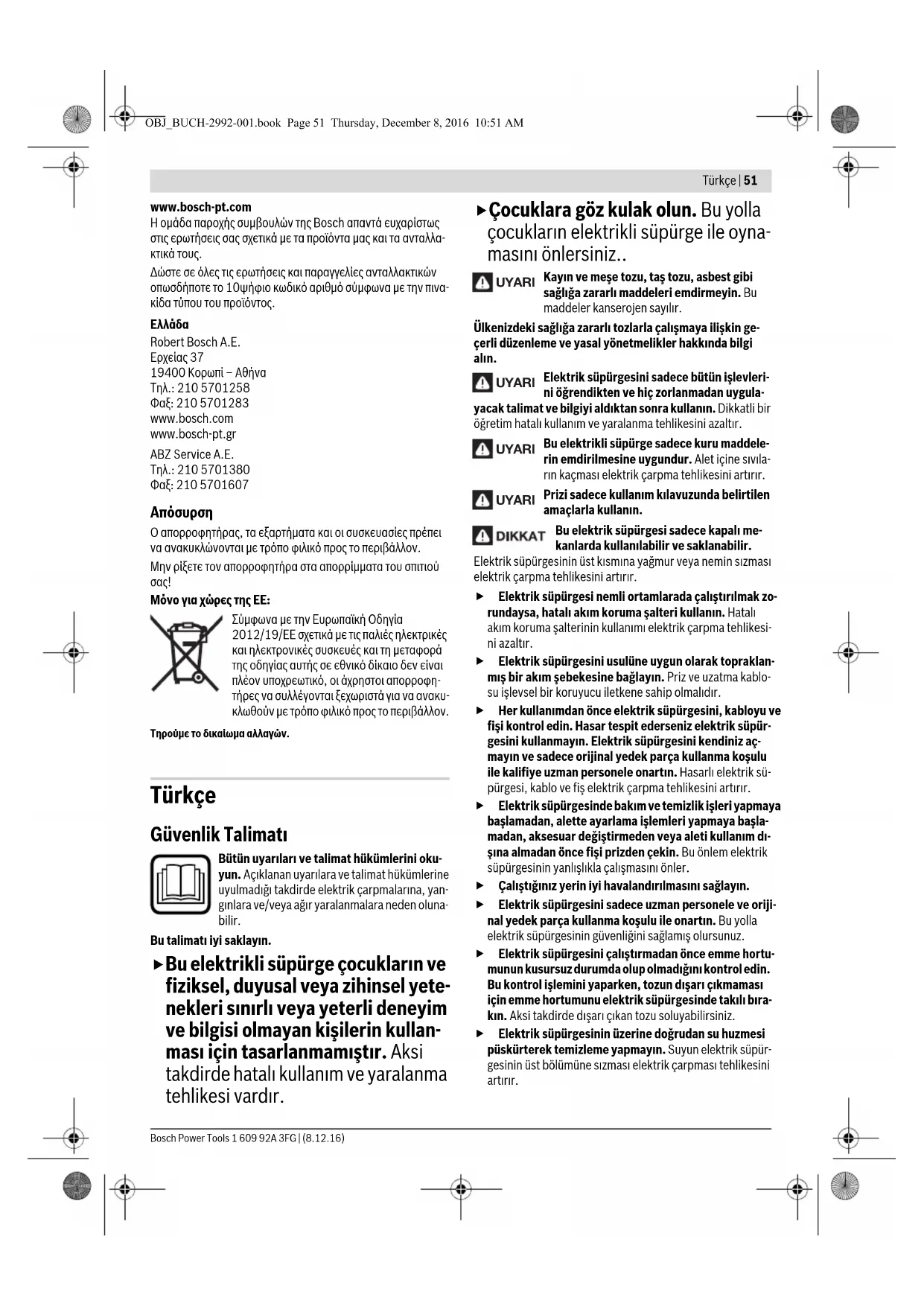 – Να μεταφέρετε τον αποροφητήρα κρατώντας τον μόνο από τη λαβή 5. Service και παροχή συμβουλών χρήσης Το Service απαντά στις ερωτήσεις σας σχετικά με την επισκευή και τη συντήρηση του προϊόνος σας καθώς για τα κατάλληλα ανταλλακτικά: –Για τη θέση σε λειτουργία της διάτα- ξης αυτόματης εκκίνησης/στάσης του απορροφητήρα θέστε το διακόπτη επιλογής τρόπων λειτουργίας 2 στο σύμβολο «Διάταξη αυτόματης εκκίνη- σης/στάσης». –Για την απενεργοποίηση του απορροφητή- ρα, θέστε το διακόπτη επιλογής τρόπων λει- τουργίας 2 στο σύμβολο «Απενεργοποίηση». OBJ_BUCH-2992-001.book Page 50 Thursday, December 8, 2016 10:51 AMTürkçe | 51Bosch Power Tools 1 609 92A 3FG | (8.12.16)www.bosch-pt.comΗ ομάδα παροχής συμβουλών της Bosch απαντά ευχαρίστως στις ερωτήσεις σας σχετικά με τα προϊόντα μας και τα ανταλλα-κτικά τους.Δώστε σε όλες τις ερωτήσεις και παραγγελίες ανταλλακτικών οπωσδήποτε το 10ψήφιο κωδικό αριθμό σύμφωνα με την πινα-κίδα τύπου του προϊόντος.ΕλλάδαRobert Bosch A.E.Ερχείας 3719400 Κορωπί – ΑθήναΤηλ.: 210 5701258Φαξ: 210 5701283www.bosch.comwww.bosch-pt.grABZ Service A.E.Τηλ.: 210 5701380Φαξ: 210 5701607 Ο απορροφητήρας, τα εξαρτήματα και οι συσκευασίες πρέπει να ανακυκλώνονται με τρόπο φιλικό προς το περιβάλλον.Μην ρίξετε τον απορροφητήρα στα απορρίμματα του σπιτιού Μόνο για χώρες της ΕΕ:Σύμφωνα με την Ευρωπαϊκή Οδηγία 2012/19/ΕΕ σχετικά με τις παλιές ηλεκτρικές και ηλεκτρονικές συσκευές και τη μεταφορά της οδηγίας αυτής σε εθνικό δίκαιο δεν είναι πλέον υποχρεωτικό, οι άχρηστοι απορροφη-τήρες να συλλέγονται ξεχωριστά για να ανακυ-κλωθούν με τρόπο φιλικό προς το περιβάλλον.Τηρούμε το δικαίωμα αλλαγών. Türkçe Güvenlik Talimatı Bütün uyarıları ve talimat hükümlerini oku-yun. Açıklanan uyarılara ve talimat hükümlerine uyulmadığı takdirde elektrik çarpmalarına, yan-gınlara ve/veya ağır yaralanmalara neden oluna-bilir.Bu talimatı iyi saklayın. Bu elektrikli süpürge çocukların ve fiziksel, duyusal veya zihinsel yete- nekleri sınırlı veya yeterli deneyim ve bilgisi olmayan kişilerin kullan- ması için tasarlanmamıştır. Aksi takdirde hatalı kullanım ve yaralanma tehlikesi vardır. Çocuklara göz kulak olun. Bu yolla çocukların elektrikli süpürge ile oyna- masını önlersiniz.. Kayın ve meşe tozu, taş tozu, asbest gibi sağlığa zararlı maddeleri emdirmeyin. Bu maddeler kanserojen sayılır.Ülkenizdeki sağlığa zararlı tozlarla çalışmaya ilişkin ge-çerli düzenleme ve yasal yönetmelikler hakkında bilgi alın.Elektrik süpürgesini sadece bütün işlevleri-ni öğrendikten ve hiç zorlanmadan uygula-yacak talimat ve bilgiyi aldıktan sonra kullanın. Dikkatli bir öğretim hatalı kullanım ve yaralanma tehlikesini azaltır.Bu elektrikli süpürge sadece kuru maddele-rin emdirilmesine uygundur. Alet içine sıvıla-rın kaçması elektrik çarpma tehlikesini artırır.Prizi sadece kullanım kılavuzunda belirtilen amaçlarla kullanın.Bu elektrik süpürgesi sadece kapalı me-kanlarda kullanılabilir ve saklanabilir. Elektrik süpürgesinin üst kısmına yağmur veya nemin sızması elektrik çarpma tehlikesini artırır. Elektrik süpürgesi nemli ortamlarada çalıştırılmak zo-rundaysa, hatalı akım koruma şalteri kullanın. Hatalı akım koruma şalterinin kullanımı elektrik çarpma tehlikesi-ni azaltır. Elektrik süpürgesini usulüne uygun olarak topraklan-mış bir akım şebekesine bağlayın. Priz ve uzatma kablo-su işlevsel bir koruyucu iletkene sahip olmalıdır. Her kullanımdan önce elektrik süpürgesini, kabloyu ve fişi kontrol edin. Hasar tespit ederseniz elektrik süpür-gesini kullanmayın. Elektrik süpürgesini kendiniz aç-mayın ve sadece orijinal yedek parça kullanma koşulu ile kalifiye uzman personele onartın. Hasarlı elektrik sü-pürgesi, kablo ve fiş elektrik çarpma tehlikesini artırır. Elektrik süpürgesinde bakım ve temizlik işleri yapmaya başlamadan, alette ayarlama işlemleri yapmaya başla-madan, aksesuar değiştirmeden veya aleti kullanım dı-şına almadan önce fişi prizden çekin. Bu önlem elektrik süpürgesinin yanlışlıkla çalışmasını önler. Çalıştığınız yerin iyi havalandırılmasını sağlayın. Elektrik süpürgesini sadece uzman personele ve oriji-nal yedek parça kullanma koşulu ile onartın. Bu yolla elektrik süpürgesinin güvenliğini sağlamış olursunuz. Elektrik süpürgesini çalıştırmadan önce emme hortu-munun kusursuz durumda olup olmadığını kontrol edin. Bu kontrol işlemini yaparken, tozun dışarı çıkmaması için emme hortumunu elektrik süpürgesinde takılı bıra-kın. Aksi takdirde dışarı çıkan tozu soluyabilirsiniz. Elektrik süpürgesinin üzerine doğrudan su huzmesi püskürterek temizleme yapmayın. Suyun elektrik süpür-gesinin üst bölümüne sızması elektrik çarpması tehlikesini artırır. UYARI UYARI UYARI UYARI OBJ_BUCH-