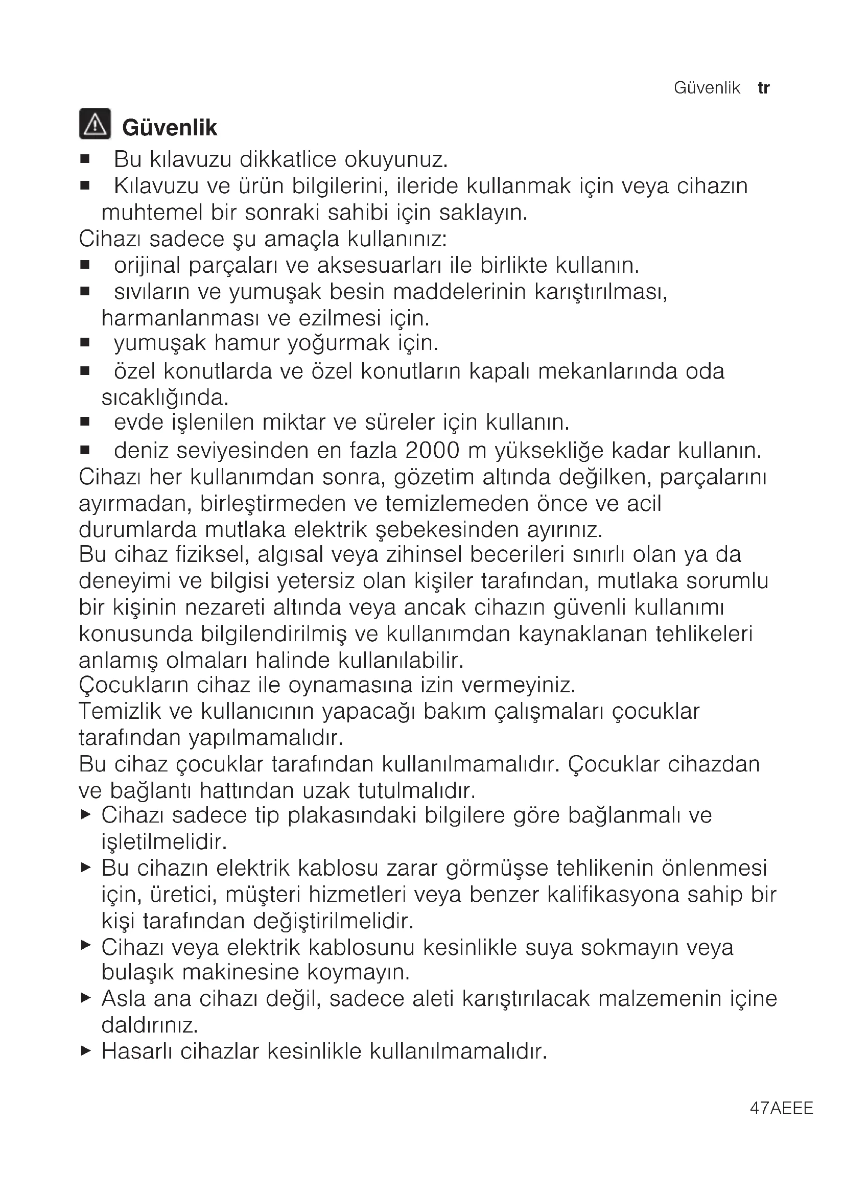 Όροι εγγύησης Όροι εγγύησης Όροι εγγύησης Έχετε για τη συσκευή σας δικαίωμα εγγύησης σύμφωνα με τους ακόλουθους όρους.el Όροι εγγύησης 46 Εκτυπωμένο σε 100 % ανακυκλωμένο χαρτίGüvenlik tr 47AEEE Yönetmeliǧine Uygundur. PCB içermez. Güvenlik ¡ Bu kılavuzu dikkatlice okuyunuz. ¡ Kılavuzu ve ürün bilgilerini, ileride kullanmak için veya cihazın muhtemel bir sonraki sahibi için saklayın. Cihazı sadece şu amaçla kullanınız: ¡ orijinal parçaları ve aksesuarları ile birlikte kullanın. ¡ sıvıların ve yumuşak besin maddelerinin karıştırılması, harmanlanması ve ezilmesi için. ¡ yumuşak hamur yoğurmak için. ¡ özel konutlarda ve özel konutların kapalı mekanlarında oda sıcaklığında. ¡ evde işlenilen miktar ve süreler için kullanın. ¡ deniz seviyesinden en fazla 2000m yüksekliğe kadar kullanın. Cihazı her kullanımdan sonra, gözetim altında değilken, parçalarını ayırmadan, birleştirmeden ve temizlemeden önce ve acil durumlarda mutlaka elektrik şebekesinden ayırınız. Bu cihaz fiziksel, algısal veya zihinsel becerileri sınırlı olan ya da deneyimi ve bilgisi yetersiz olan kişiler tarafından, mutlaka sorumlu bir kişinin nezareti altında veya ancak cihazın güvenli kullanımı konusunda bilgilendirilmiş ve kullanımdan kaynaklanan tehlikeleri anlamış olmaları halinde kullanılabilir. Çocukların cihaz ile oynamasına izin vermeyiniz. Temizlik ve kullanıcının yapacağı bakım çalışmaları çocuklar tarafından yapılmamalıdır. Bu cihaz çocuklar tarafından kullanılmamalıdır. Çocuklar cihazdan ve bağlantı hattından uzak tutulmalıdır.