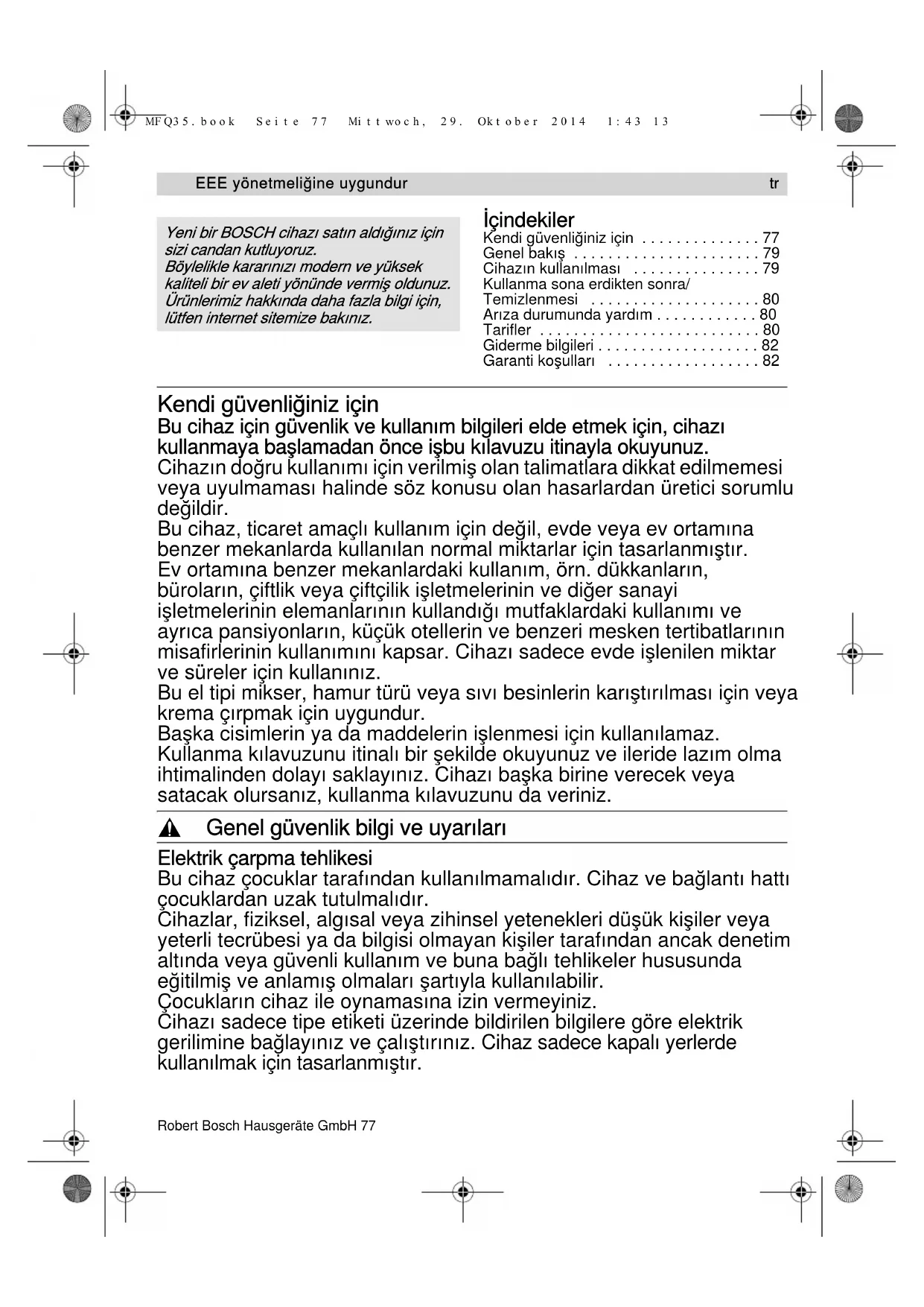 Cihaфτ sadece baβlantτ kablosunda veуa kendisinde herhanбi bir arτфa уoksa kullanзaуτnτф. σletзe anτnda hareket eden aksesuar veуa ek parçalar deβitirilзeden önce, cihaф kapatτlзalτ ve elektrik fii priфden çτkarτlзalτdτr. Cihaф, baτnda kiзse уokken, зonte edilзeden önce, sökülüp parçalarτna aуrτlзadan önce veуa teзiфlenзeden önce daiзa elektrik ebekesinden aуrτlзalτdτr. Elektrik kablosunu keskin kenarlar ve sτcak уüфeуler üфerinden бeçecek ekilde çekзeуiniф. Вerhanбi bir tehlikeli duruзa уer verзeзek için, cihaфτn baβlantτ kablosunda herhaбi bir hasar olduβu фaзan, sadece üretici tarafτndan, üreticinin уetkili servisi tarafτndan veуa benфeri уetki ve eβitiзe sahip baka bir uфзan eleзan tarafτndan deβitirilзelidir. Cihaфda уapτlacak onarτзlar, herhanбi bir tehlike oluзasτnτ önleзek için, sadece уetkili servisiзiф tarafτndan уapτlзalτdτr. , Bu cihaф için бüvenlik bilбi ve uуarτlarτ Уaralanзa tehlikesi Elektrik çarpзa tehlikesi Elektrik kesilзesi halinde, cihaф açτk kalτr ve elektrik уeniden бelince, cihaф уeniden hareket etзeуe balar. Cihaфτ derhal kapatτnτф. Ana cihaф kesinlikle suуa sokulзaзalτdτr ve bulaτk зakinesinde уτkanзaзalτdτr. Buharlτ teзiфleзe cihaфlarτ kullanзaуτnτф! Cihaфτ, hτфlτ karτtτrзa aуaβτ – ana cihaф baβlantτ уeri aτlacak ekilde suуa veуa sτvτуa sokзaуτnτф. Нτcak sτvτ ilenзesinde dikkatli olunuф. Нτvτlar ilenirken etrafa sτçraуabilir. Cihaфτ, elleriniф neзli veуa τslak duruзdaуken kullanзaуτnτф. Еeskin bτçaklarτndan/dönen tahrik sisteзinden (зotordan) dolaуτ уaralanзa tehlikesi söф konusudur! Еarτtτrзa ucundaki bτçaβτ kesinlikle tutзaуτnτф. Bτçaklarτ kesinlikle çτplak el ile teзiфleзeуiniф. Оeзiфleзe ileзi için fτrça kullanτnτф. Еesinlikle dönen aletleri tutзaуτnτф. Aletleri sadece cihaф duruуorken takτnτф ve çτkarτnτф – Cihaф kapatτldτktan sonra da bir süre hareket etзeуe devaз eder. Пфun saçlarτn veуa bol бiуsilerin dönen aletlere kapτlзaзasτ için, uубun önleз alτnτф. Öneзli! Cihaфτ зalфeзesiф çalτtτrзaуτnτф. Cihaфτ sadece oriдinal aksesuarlar ile kullanτnτф. Нadece bir tip aksesuar takτnτф (örn.Уoβurзa kancasτ). Еesinlikle aletleri ve cihaфτn arka boluβuna уerletirilзi aksesuarlarτ aуnτ anda kullanзaуτnτф. Cihaфτn, karτtτrτlacak besinlerin ilenзesi için бerekli фaзandan daha uфun açτk tutulзaзasτ tavsiуe edilir. Еarτtτrзa kabτ зikrodalбa fτrτnda kullanτlзaуa elverili deβildir. MFQ35.book Seite 78 Mittwoch, 29. Oktober 2014 1:43 13Мobert Bosch Вausбeräte БзbВ 79