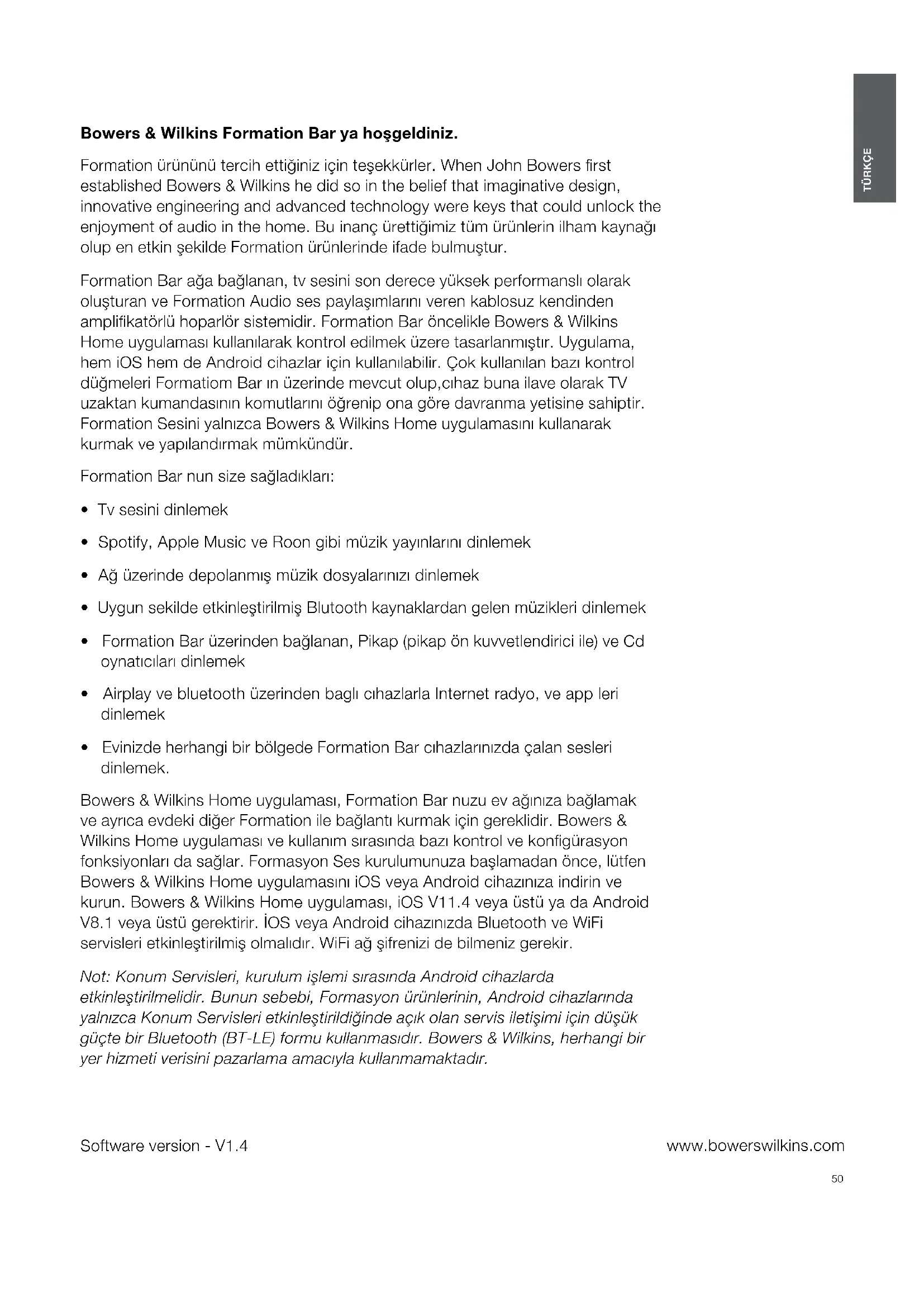 - Evinizde herhangi bir bölgede Formation Bar cıhazlarınızda çalan sesleri dinlemek. Bowers & Wilkins Home uygulaması, Formation Bar nuzu ev ağınıza bağlamak ve ayrıca evdeki diğer Formation ile bağlantı kurmak için gereklidir. Bowers & Wilkins Home uygulaması ve kullanım sırasında bazı kontrol ve kongürasyon fonksiyonları da sağlar. Formasyon Ses kurulumunuza başlamadan önce, lütfen Bowers & Wilkins Home uygulamasını iOS veya Android cihazınıza indirin ve kurun. Bowers & Wilkins Home uygulaması, iOS V11.4 veya üstü ya da Android V8.1 veya üstü gerektirir. İOS veya Android cihazınızda Bluetooth ve WiFi servisleri etkinleştirilmiş olmalıdır. WiFi ağ şifrenizi de bilmeniz gerekir. Not: Konum Servisleri, kurulum işlemi sırasında Android cihazlarda etkinleştirilmelidir. Bunun sebebi, Formasyon ürünlerinin, Android cihazlarında yalnızca Konum Servisleri etkinleştirildiğinde açık olan servis iletişimi için düşük güçte bir Bluetooth (BT-LE) formu kullanmasıdır. Bowers & Wilkins, herhangi bir yer hizmeti verisini pazarlama amacıyla kullanmamaktadır. Software version - V1.4