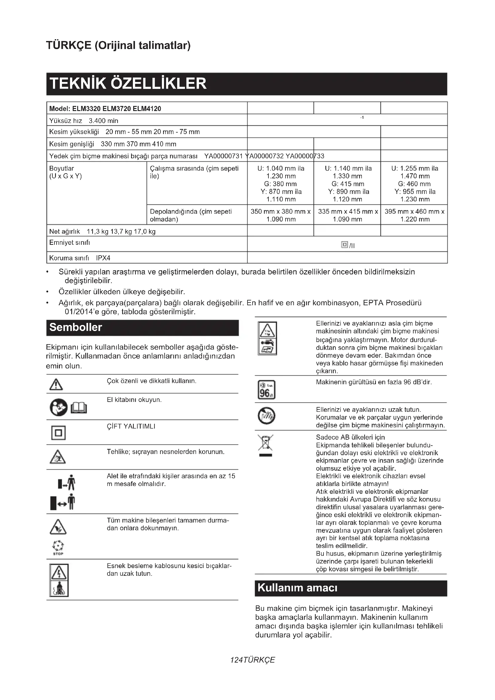 - Ağırlık,ekparçaya(parçalara)bağlıolarakdeğişebilir.Enhafifveenağırkombinasyon,EPTAProsedürü 01/2014’egöre,tablodagösterilmiştir. Semboller Ekipmanıiçinkullanılabileceksembolleraşağıdagöste- rilmiştir.Kullanmadanönceanlamlarınıanladığınızdan eminolun. Çoközenlivedikkatlikullanın. Elkitabınıokuyun. ÇİFTYALITIMLI Tehlike;sıçrayannesnelerdenkorunun. Aletileetrafındakikişilerarasındaenaz15 mmesafeolmalıdır. Tümmakinebileşenleritamamendurma- danonlaradokunmayın. Esnekbeslemekablosunukesicibıçaklar- dan uzak tutun. Elleriniziveayaklarınızıaslaçimbiçme makinesininaltındakiçimbiçmemakinesi bıçağınayaklaştırmayın.Motordurdurul- duktansonraçimbiçmemakinesibıçakları dönmeyedevameder.Bakımdanönce veyakablohasargörmüşsefişimakineden çıkarın. Makineningürültüsüenfazla96dB’dir. Elleriniziveayaklarınızıuzaktutun. Korumalarveekparçalaruygunyerlerinde değilseçimbiçmemakinesiniçalıştırmayın. SadeceABülkeleriiçin Ekipmandatehlikelibileşenlerbulundu- ğundandolayıeskielektrikliveelektronik ekipmanlarçevreveinsansağlığıüzerinde olumsuzetkiyeyolaçabilir. Elektrikliveelektronikcihazlarıevsel atıklarlabirlikteatmayın! Atıkelektrikliveelektronikekipmanlar hakkındakiAvrupaDirektifivesözkonusu direktifinulusalyasalarauyarlanmasıgere- ğinceeskielektrikliveelektronikekipman- larayrıolaraktoplanmalıveçevrekoruma mevzuatınauygunolarakfaaliyetgösteren ayrıbirkentselatıktoplamanoktasına teslimedilmelidir. Buhusus,ekipmanınüzerineyerleştirilmiş üzerindeçarpıişaretibulunantekerlekli çöpkovasısimgesiilebelirtilmiştir. Kullanım amacı Bumakineçimbiçmekiçintasarlanmıştır.Makineyi başkaamaçlarlakullanmayın.Makineninkullanım amacıdışındabaşkaişlemleriçinkullanılmasıtehlikeli durumlarayolaçabilir.125 TÜRKÇE Güç kaynağı Aletin,yalnızcaisimlevhasındabelirtilenleaynıvoltajlı güçkaynağınabağlanmasıgerekirveyalnızcatekfazlı ACgüçkaynağıylaçalıştırılabilir.Çifteyalıtımlıdırve topraklamasızprizlerledekullanılabilir. Beslemekablosuhasargörürsetehlikeninönüne geçmekiçinkabloüreticifirmaveyaservisitarafından değiştirilmelidir. 220 V ile 250 V arası umumi düşük voltaj dağıtım sistemleri için Elektriklialetlerinaçılıpkapatılmasıgerilimdalgalan- malarınanedenolur.Bucihazınuygunolmayanşebeke elektriğişartlarıaltındaçalıştırılmasıdiğercihazların çalışmasınaolumsuzetkisiolabilir.Şebekeelektriği empedansı0,425Ohm(ELM3720için)veya0,427 Ohm(ELM4120için)değerineeşitveyabundandaha düşükikenolumsuzetkiolmayacağıvarsayılabilir.Bu cihaziçinkullanılanşebekeprizi,yavaşatanözelliklibir sigortaveyakoruyucudevrekesiciilekorunmalıdır. Gürültü Geçerlistandart:ENIEC62841-4-3 Model Sesbasıncıseviyesi Sesgücüseviyesi