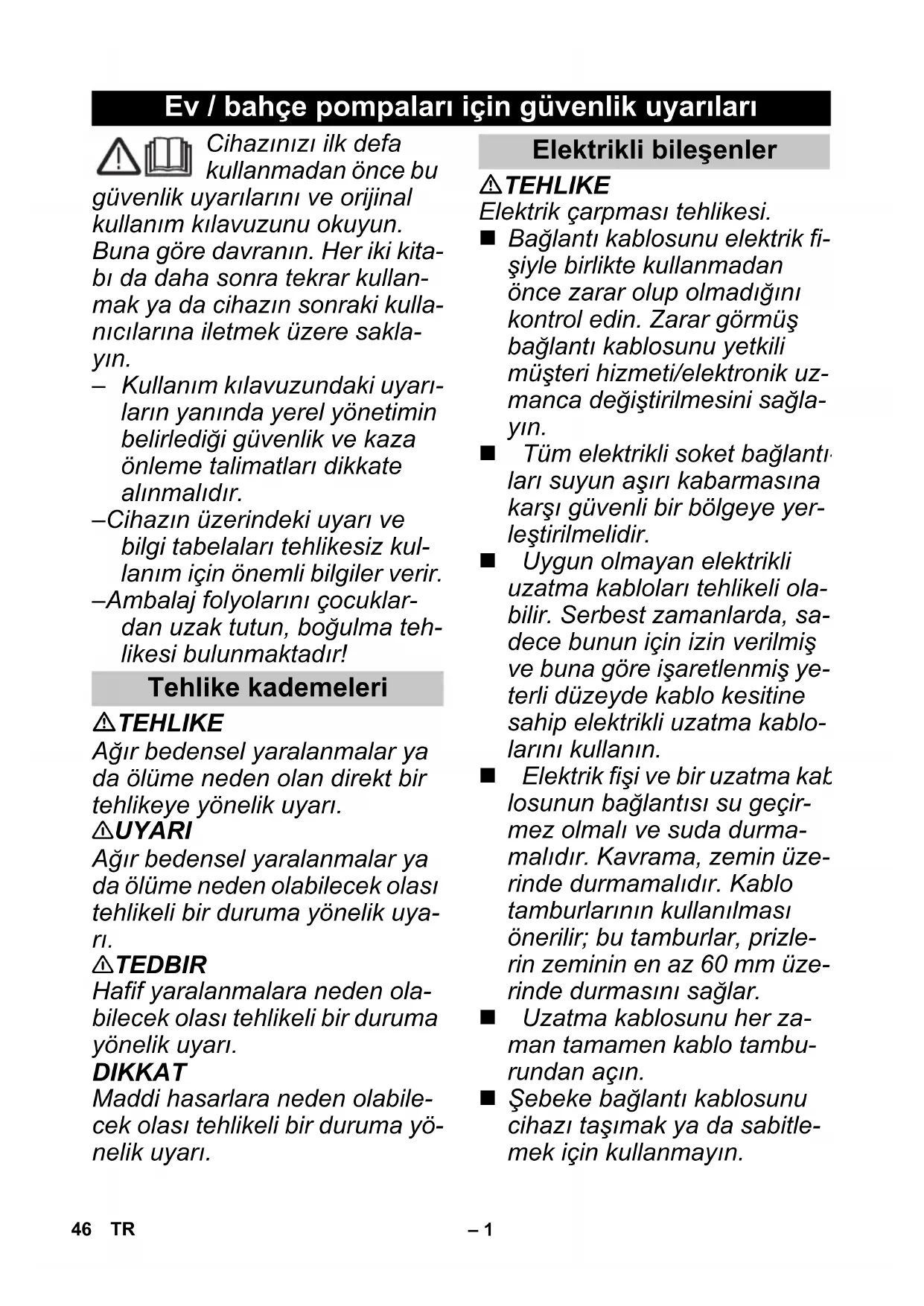 Μην αντλείτε λίπη, έλαια και αλατούχο νερό. Μην αντλείτε λύματα από του- αλέτες ή λασπώδη ύδατα, τα οποία έχουν μικρότερη ρευ- στότητα από το καθαρό νερό. Μην αντλείτε νερό με θερμο- κρασία άνω των 35°C. Λοιποί κίνδυνοι 45EL– 1 Cihazınızı ilk defa kullanmadan önce bu güvenlik uyarılarını ve orijinal kullanım kılavuzunu okuyun. Buna göre davranın. Her iki kita- bı da daha sonra tekrar kullan- mak ya da cihazın sonraki kulla- nıcılarına iletmek üzere sakla- yın. – Kullanım kılavuzundaki uyarı- ların yanında yerel yönetimin belirlediği güvenlik ve kaza önleme talimatları dikkate alınmalıdır. – Cihazın üzerindeki uyarı ve bilgi tabelaları tehlikesiz kul- lanım için önemli bilgiler verir. – Ambalaj folyolarını çocuklar- dan uzak tutun, boğulma teh- likesi bulunmaktadır! TEHLIKE Ağır bedensel yaralanmalar ya da ölüme neden olan direkt bir tehlikeye yönelik uyarı. 몇 UYARI
