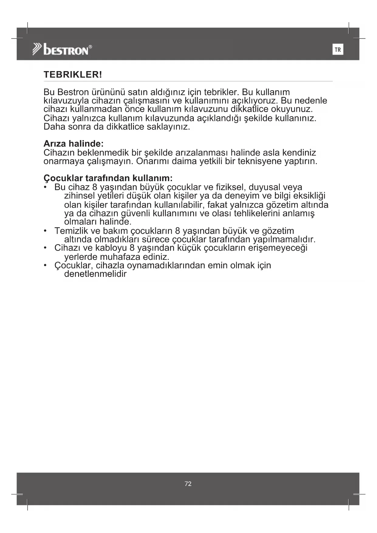 TEBRIKLER! Bu Bestron ürününü satın aldığınız için tebrikler. Bu kullanım kılavuzuyla cihazın çalışmasını ve kullanımını açıklıyoruz. Bu nedenle cihazı kullanmadan önce kullanım kılavuzunu dikkatlice okuyunuz. Cihazı yalnızca kullanım kılavuzunda açıklandığı şekilde kullanınız. Daha sonra da dikkatlice saklayınız. Arıza halinde: Cihazın beklenmedik bir şekilde arızalanması halinde asla kendiniz onarmaya çalışmayın. Onarımı daima yetkili bir teknisyene yaptırın. Çocuklar tarafından kullanım:
