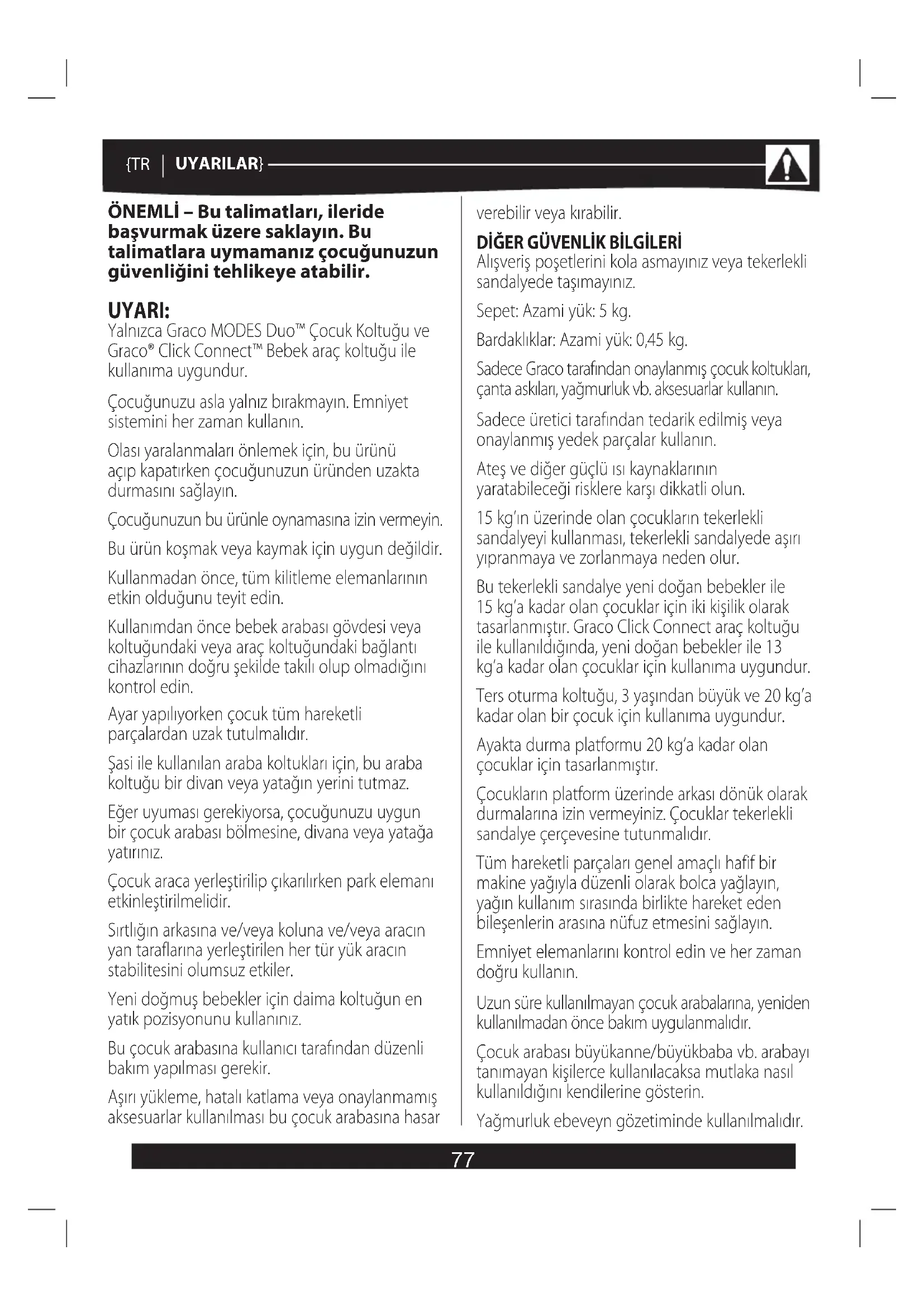 KOLTUK MİNDERİNİN TEMİZLENMESİ. Koltuk minderini temiz ve nemli bir bez ile silin. ÇOCUK ARABASINI PLAJDA KULLANDIYSANIZ, kullandıktan sonra tekerlek gruplarındaki kumu ve tuzu iyice temizleyin. ÇOCUK ARABASINI DÜZENLİ OLARAK gevşemiş vidalara, aşınmış parçalara, yırtılmış malzemelere veya atmış dikişlere karşı kontrol edin. Parçaları onarın veya gerekiyorsa yenileriyle değiştirin. Hasar görmesi veya kırılması halinde, ÇOCUK KOLTUĞUNU KULLANMAYA SON VERİN. ÇOCUK KOLTUĞUNUN İSKELETİNİ TEMİZLEMEK için sadece ev tipi sabun veya deterjan ile ılık su kullanın. ÇAMAŞIR SUYU, TUZ RUHU VEYA AŞINDIRICI TEMİZLİK MALZEMELERİ KULLANMAYINIZ. {TR UYARILAR} Tente ile donatılmamış bir çocuk arabasında veya araç koltuğunda yağmurluk kullanmayın. Yağmurluğu kapalı mekanlarda, sıcak havada ya da bir doğrudan ısı kaynağının yakınında kullanmayın, bebeğiniz aşırı hararet yapabilir. Çocuk arabasını katlamadan önce yağmurluğu tamamen çıkarın. Yollara veya demiryollarına yakınken, fren ETKİN olsa bile çocuk arabasını bırakmayın; hızla geçen bir otomobilin veya trenin yaratacağı hava akımı sabit duran bir çocuk arabasının yerinden oynamasına neden olabilir. Merdiven veya yürüyen merdivenden inip çıkarken çocuğunuzu çocuk arabasından indirip arabayı katlayın. İplerin düğümlenmesini önleyin. Çocuk arabasından ipler SARKITMAYIN veya ipi bulunan eşyaları çocuğunuzun üzerine KOYMAYIN. Devrilmeyi önlemek için tekerlekli sandalyeye girerken ve tekerlekli sandalyeden çıkarken her zaman çocuğunuza yardım edin. Depolamadan önce kurumasını bekleyin. Yağmurluğu elde yıkayarak temizleyin. ÇAMAŞIR SUYU KULLANMAYIN. Tulumu elde yıkayarak temizleyin ve asarak kurutun. ÇAMAŞIR SUYU KULLANMAYIN. (seçili modellerde) GÜNEŞE FAZLA MARUZ KALMALARI halinde çocuk koltuğunun plastik ve kumaş kısımları kısa sürede solabilir.79 {TR TALIMATLAR} Tekerlekli sandalye çerçevesini açma - bakınız sayfa 5; resimler 1, 2, 3 Arka Tekerler - bakınız sayfa 5; resimler 4, 5, 6, 7, 8, 9 Ön Tekerler - bakınız sayfa 6; resimler 1, 2 Ters oturma koltuğu - bakınız sayfa 6; resimler 3, 4 Çocuk Koltuğu - bakınız sayfa 7; resimler 1, 2 Gölgelik - bakınız sayfa 7; resimler 3, 4 Tutunma Barı - bakınız sayfa 8, resimler 1, 2, 3, 4, 5 Araba koltuğu/Çocuk koltuğu takma yuvaları - bakınız sayfa 8; resimler 6, 7, 8 Ön konum yuvaları - bakınız sayfa 9; resimler 1, 2 Çocuk Koltuğunun kullanımı - bakınız sayfa 9; resimler 3, 4, 5, 6, 7, 8 Çocuk koltuğunun çıkarılması - bakınız sayfa 10; resimler 1, 2 Gölgelik Kullanımı - bakınız sayfa 10; resimler 3, 4, 5, 6 Çocuğunuzun Güvenliğini Sağlama - bakınız sayfa 11; resimler 1, 2, 3, 4, 5, 6 Kayış Yüksekliği Pozisyonunun Ayarlanması - bakınız sayfa 11; resimler 7, 8 Koltuğun kaldırılması ve yatırılması - bakınız sayfa 12; resimler 1, 2 Frenler - bakınız sayfa 13; resimler 1, 2 Döner Teker Kilidi - bakınız sayfa 13; resimler 3, 4 Graco® Click Connect™ Bebek Araba Koltuğunu arka konuma Takma ve arka konumdan Çıkarma - bakınız sayfa 14; resimler 1, 2, 3, 4, 5, 6 Graco® Click Connect™ Bebek Araba Koltuğunu ön konuma Takma ve ön konumdan Çıkarma - bakınız sayfa 15; resimler 1, 2, 3, 4, 5, 6 Tekerlekli Sandalyeyi Katlama - bakınız sayfa 16; resimler 1, 2, 3, 4, 5, 6 Ayak Tulumu - bakınız sayfa 17; resimler 1, 2, 3, 4, 5 Kemer kılıfı - bakınız sayfa 18; resim 1 Yağmur koruyucusunu kullanmak - bakınız sayfa 18; resimler 2, 3, 4, 580 {SL OPOZORILA} POMEMBNO – Shranite ta navodila za poznejšo rabo. Neupoštevanje teh navodil lahko vpliva na varnost vašega otroka. OPOZORILO: Primerno le za uporabo s sedežem za malčke Graco MODES Duo™ ali z avtosedežem za dojenčke Graco® Click Connect™. Otrok mora biti vedno pod nadzorom. Vedno uporabite zadrževalni sistem. Če želite preprečiti poškodbe, poskrbite, da otroka ni v bližini, kadar sestavljate in zlagate ta izdelek. Ne dovolite otroku, da bi se igral s tem izdelkom. Ta izdelek ni primeren za tek ali rolanje. Pred uporabo se prepričajte, da so vsi zaklepni mehanizmi sklopljeni. Pred uporabo preverite, ali so košara, sedež ali držala sedežne enote pravilno aktivirani. Pri nastavljanju otrok ne sme biti v bližini gibljivih delov. Za avtosedeže, ki se uporabljajo v povezavi z ohišjem, to vozilo ne nadomesti ležišča ali posteljice. Če mora otrok spati, ga položite v primerno košaro, ležišče ali posteljico. Kadar otroka polagate v voziček in ga jemljete iz njega, mora biti aktivirana parkirna zavora. Vsako breme, pritrjeno na ročaj, hrbtni del naslonjala ali na bok vozička, vpliva na stabilnost vozička. Za novorojenčke vedno uporabljajte najbolj nagnjen položaj sedeža. Ta voziček mora uporabnik redno vzdrževati. Preobremenitev, nepravilno zlaganje in uporaba neodobrene dodatne opreme lahko poškodujejo ali zlomijo voziček.
