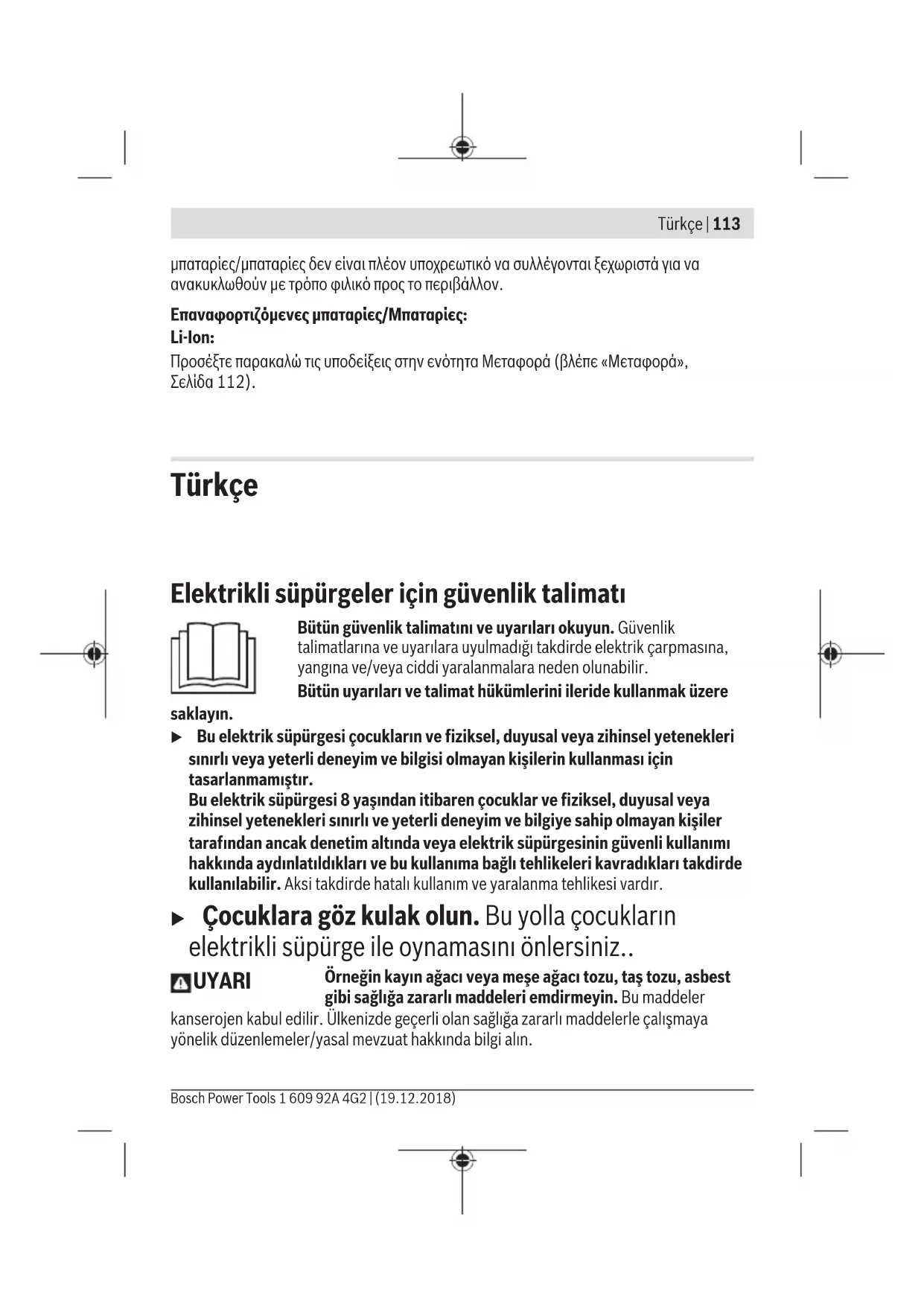 Ο απορροφητήρας, οι μπαταρίες, τα εξαρτήματα και οι συσκευασίες πρέπει να ανακυκλώνονται με τρόπο φιλικό προς το περιβάλλον. Μη ρίχνετε τον απορροφητήρα και τις μπαταρίες στα οικιακά απορρίμματα! Μόνο για χώρες τηςΕΕ: Σύμφωνα με την Κοινοτική Οδηγία 2012/19/ΕΕ οι άχρηστοι απορροφητήρες και σύμφωνα με την Κοινοτική Οδηγία 2006/66/ΕΚ οι χαλασμένες ή αναλωμένες επαναφορτιζόμενες 1 609 92A 4G2 | (19.12.2018) Bosch Power ToolsTürkçe | 113 μπαταρίες/μπαταρίες δεν είναι πλέον υποχρεωτικό να συλλέγονται ξεχωριστά για να ανακυκλωθούν με τρόπο φιλικό προς το περιβάλλον. Επαναφορτιζόμενες μπαταρίες/Μπαταρίες: Li-Ion: Προσέξτε παρακαλώ τις υποδείξεις στην ενότητα Μεταφορά (βλέπε «Μεταφορά», Σελίδα112). Türkçe Elektrikli süpürgeler için güvenlik talimatı Bütün güvenlik talimatını ve uyarıları okuyun. Güvenlik talimatlarına ve uyarılara uyulmadığı takdirde elektrik çarpmasına, yangına ve/veya ciddi yaralanmalara neden olunabilir. Bütün uyarıları ve talimat hükümlerini ileride kullanmak üzere saklayın. u Bu elektrik süpürgesi çocukların ve fiziksel, duyusal veya zihinsel yetenekleri sınırlı veya yeterli deneyim ve bilgisi olmayan kişilerin kullanması için tasarlanmamıştır. Bu elektrik süpürgesi 8 yaşından itibaren çocuklar ve fiziksel, duyusal veya zihinsel yetenekleri sınırlı ve yeterli deneyim ve bilgiye sahip olmayan kişiler tarafından ancak denetim altında veya elektrik süpürgesinin güvenli kullanımı hakkında aydınlatıldıkları ve bu kullanıma bağlı tehlikeleri kavradıkları takdirde kullanılabilir. Aksi takdirde hatalı kullanım ve yaralanma tehlikesi vardır. u Çocuklara göz kulak olun. Bu yolla çocukların elektrikli süpürge ile oynamasını önlersiniz.. UYARI Örneğin kayın ağacı veya meşe ağacı tozu, taş tozu, asbest gibi sağlığa zararlı maddeleri emdirmeyin. Bu maddeler kanserojen kabul edilir. Ülkenizde geçerli olan sağlığa zararlı maddelerle çalışmaya yönelik düzenlemeler/yasal mevzuat hakkında bilgi alın. Bosch Power Tools 1 609 92A 4G2 | (19.12.2018)114 | Türkçe u Elektrikli süpürgeyi ancak kullanımı hakkında yeterli bilgi aldıktan sonra kullanın. Aletin kullanımı hakkında dikkatli bilgi edinme hatalı kullanma ve yaralanma riskini azaltır. UYARI Bu elektrikli süpürge sadece kuru maddelerin emilmesine uygundur. Aletin içine sıvı sızması elektrik çarpma tehlikesini artırır. u DİKKAT! Bu elektrikli süpürge sadece kapalı mekanlarda kullanılabilir ve saklanabilir.Elektrikli süpürgenin üst parçasına yağmur suyunun veya nemin sızması elektrik çarpma tehlikesini artırır. u Çalışma yerinizin iyice havalandırılmasını sağlayın. u Elektrikli süpürgenin sadece kalifiye uzman personel tarafından ve orijinal yedek parça kullanılarak onarılmasını sağlayın. Bu şekilde elektrikli süpürgenin güvenliğini sağlarsınız. u Çalışmaya başlamadan önce her defasında emme hortumunun düzgün işlev görüp görmediğini kontrol edin. Bu işlem esnasında dışarı toz sızmasını önlemek için emme hortumunu elektrikli süpürgeye takılı bırakın. Aksi takdirde toz soluyabilirsiniz. u Elektrikli süpürgeyi doğrudan gelen su huzmesi ile temizlemeyin. Elektrikli süpürgenin üst parçası içine su sızması elektrik çarpma riskini artırır. u Akü hasar görürse veya usulüne aykırı kullanılırsa dışarı buhar sızabilir. Akü yanabilir veya patlayabilir. Çalıştığınız yeri havalandırın ve şikayet olursa hekime başvurun. Akülerden çıkan buharlar nefes yollarını tahriş edebilir. u Yanlış kullanım veya hasarlı akü, yanıcı sıvının aküden dışarı sızmasına neden olabilir. Bu sıvı ile temas etmekten kaçının. Yanlışlıkla temas ederseniz temas eden yeri su ile yıkayın. Sıvı gözlerinize gelecek olursa hekime başvurun. Dışarı sızan akü sıvısı cilt tahrişlerine ve yanmalara neden olabilir. u Çivi veya tornavida gibi sivri nesneler veya dışarıdan kuvvet uygulama aküde hasara neden olabilir. Akü içinde bir kısa devre oluşabilir ve akü yanabilir, duman çıkarabilir, patlayabilir veya aşırı ölçüde ısınabilir. u Kullanım dışındaki aküyü, kontaklar arasında köprüleme yapabilecek büro ataçları, madeni paralar, anahtarlar, çiviler, vidalar veya başka küçük metal nesnelerden uzak tutun. Akü kontakları arasındaki bir kısa devre yanmalara veya yangınlara neden olabilir. u Aküyü açmayın. Kısa devre tehlikesi vardır. 1 609 92A 4G2 | (19.12.2018) Bosch Power ToolsTürkçe | 115 Aküyü sıcaktan, sürekli gelen güneş ışınından, ateşten, sudan ve nemden koruyun. Patlama tehlikesi vardır. u Aküyü sadece üreticinin ürünlerinde kullanın. Ancak bu yolla akü tehlikeli zorlanmalara karşı korunur. u Kızgan veya yanan maddeleri emdirmeyin ve patlama tehlikesi bulunan yerlerde emdirme yapmayın. Tozlar tutuşabilir veya patlayabilir. Ürün ve performans açıklaması Usulüne uygun kullanım Bu elektrik süpürgesi sağlığa zararlı olmayan kuru maddelerin emilmesi ve temizlenmesi için tasarlanmıştır. Bu elektrik süpürgesi sadece evlerde ve evsel alanlarda kullanılmak üzere tasarlanmıştır. Şekli gösterilen elemanlar Şekli gösterilen elemanların numaraları ile bu kullanma kılavuzunun başındaki grafik sayfasındaki numaralar aynıdır. (1) Toz haznesi kilidini açma tuşu (2) Açma/kapama tuşu (3) Akü