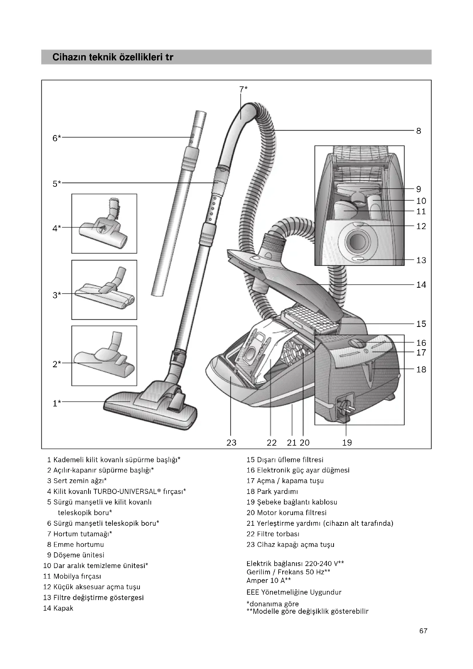 Yüksek güç alanı: Sağlam zemin kaplamalarının, sert zeminlerin ve çok kirli zeminlerin temizlenmesi için. b)Air Power: aşırı kirlenme durumunda ve kaba kirde. Cihaz azami emme gücü ile çalışır. Resim Zemin süpürme ünitesinin ayarlanması: a)Halıların ve halı kaplamalarının süpürülmesi için => b)Sert zeminlerin süpürülmesi için => Dikkat! Yer fırçaları sert yüzeyin özelliklerine bağlı olarak (Örn. sert, sade akış) belirli bir aşınmaya maruz kalır. Bu nedenle fırçanın temas yüzeyi belirli aralıklarda kontrol edilmelidir. Aşınmış, keskin kenarlı fırça yüzeyleri parke veya linolyum gibi hassas sert yüzeylerde hasarlara neden olabilir. Üretici aşınmış yer fırçaları nedeniyle meydana gelen olası hasarlar için sorumluluk kabul etmez. Turbo-fırça Cihazınız bir turbo-fırça ile donatılmışsa lütfen ilgili kullanma kılavuzundaki uyarılardan ve bakım ile ilgili bilgilerden faydalanınız. Kullanmadığınız küçük aksesuar cihazın içindeki aksesuar bölümünde rahatça saklanabilir. Resim Açma tuşuna bastığınızda aksesuar bölümü kapağı kendiliğinden açılır. İstediğiniz aksesuarı çıkarınız. Resim Çıkardıktan sonra aksesuar bölümü kapağını kapatarak oturtunuz.