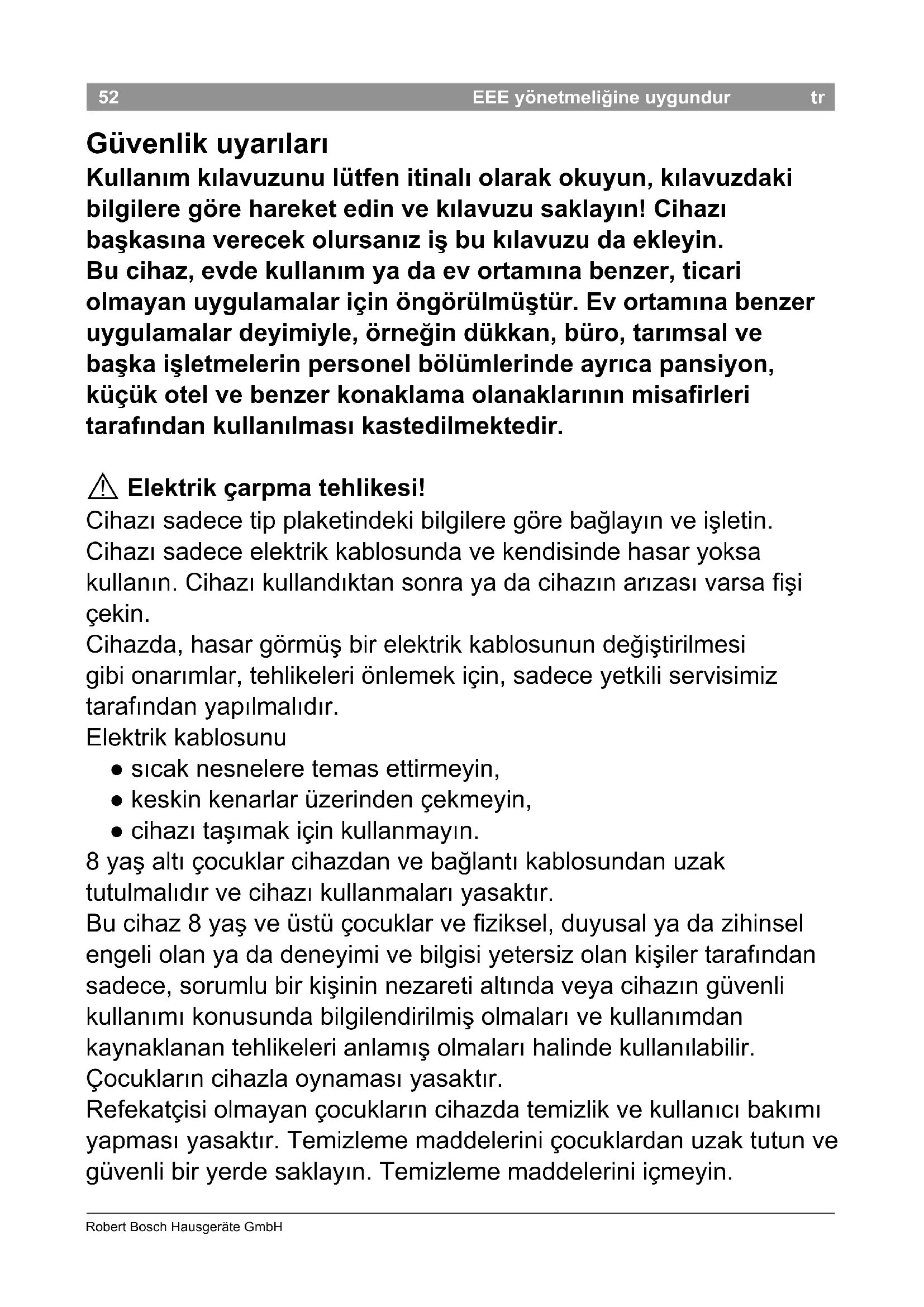 Elektrik çarpma tehlikesi! Cihazı sadece tip plaketindeki bilgilere göre bağlayın ve işletin. Cihazı sadece elektrik kablosunda ve kendisinde hasar yoksa kullanın. Cihazı kullandıktan sonra ya da cihazın arızası varsa şi çekin. Cihazda, hasar görmüş bir elektrik kablosunun değiştirilmesi gibi onarımlar, tehlikeleri önlemek için, sadece yetkili servisimiz tarafından yapılmalıdır. Elektrik kablosunu ● sıcak nesnelere temas ettirmeyin, ● keskin kenarlar üzerinden çekmeyin, ● cihazı taşımak için kullanmayın. 8 yaş altı çocuklar cihazdan ve bağlantı kablosundan uzak tutulmalıdır ve cihazı kullanmaları yasaktır. Bu cihaz 8 yaş ve üstü çocuklar ve ziksel, duyusal ya da zihinsel engeli olan ya da deneyimi ve bilgisi yetersiz olan kişiler tarafından sadece, sorumlu bir kişinin nezareti altında veya cihazın güvenli kullanımı konusunda bilgilendirilmiş olmaları ve kullanımdan kaynaklanan tehlikeleri anlamış olmaları halinde kullanılabilir. Çocukların cihazla oynaması yasaktır. Refekatçisi olmayan çocukların cihazda temizlik ve kullanıcı bakımı yapması yasaktır. Temizleme maddelerini çocuklardan uzak tutun ve güvenli bir yerde saklayın. Temizleme maddelerini içmeyin. EEE yönetmeliğine uygundur53 TAT 3A.. 06/2013