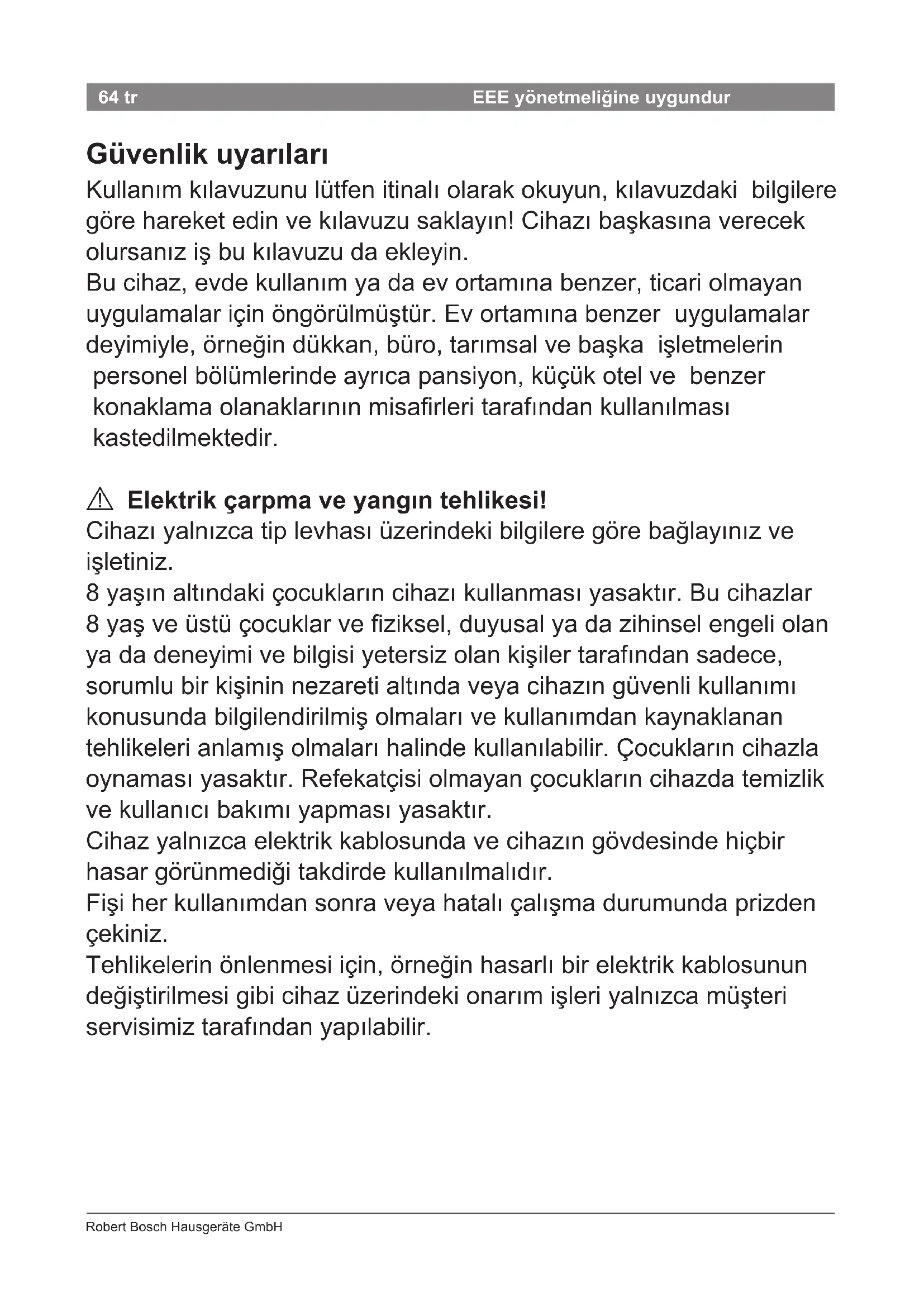 στώνται κατά τη διάρκεια της εγγύησης επιστρέφονται στο συνεργείο. Με επιφύλαξη για τις όποιες αλλαγές.64 Robert Bosch Hausgeräte GmbH 64 tr Güvenlik uyarıları Kullanım kılavuzunu lütfen itinalı olarak okuyun, kılavuzdaki bilgilere göre hareket edin ve kılavuzu saklayın! Cihazı başkasına verecek olursanız iş bu kılavuzu da ekleyin. Bu cihaz, evde kullanım ya da ev ortamına benzer, ticari olmayan uygulamalar için öngörülmüştür. Ev ortamına benzer uygulamalar deyimiyle, örneğin dükkan, büro, tarımsal ve başka işletmelerin personel bölümlerinde ayrıca pansiyon, küçük otel ve benzer konaklama olanaklarının misarleri tarafından kullanılması kastedilmektedir.