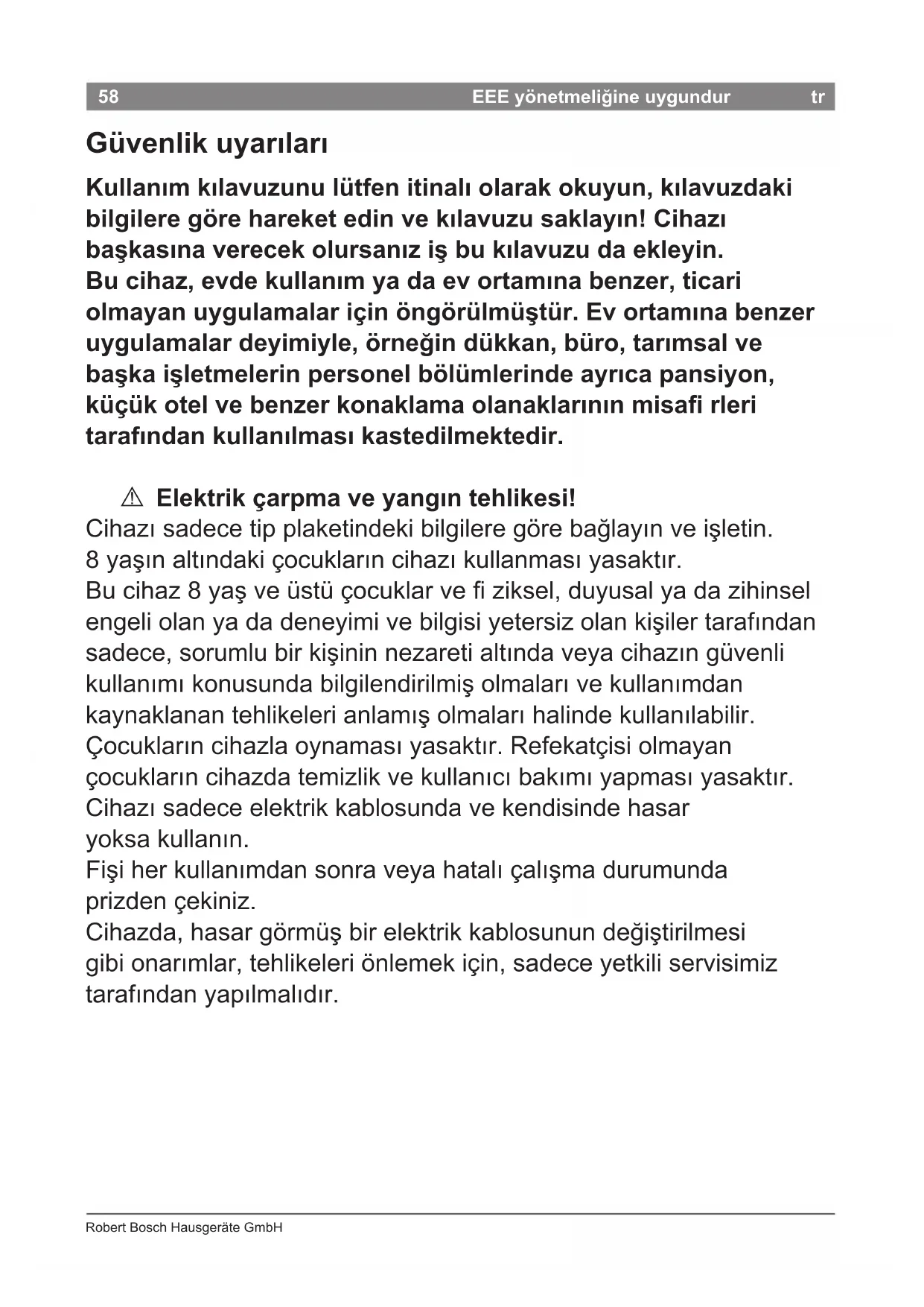 Banyo küvetlerinin, lavaboların veya içinde su bulunan veya içine su dökülen başka haznelerin yakınında kullanmayınız. A Ölüm tehlikesi! Cihaz asla suya temas ettirilmemelidir. Cihaz kapalıyken de tehlike vardır. Bu nedenle kullanımdan sonra ve kullanım esnasında saça uygulamaya ara verildiğinde mutlaka şi çekilmelidir. Evinizdeki elektrik tesisatına 30 mA’e kadar olan bir hata akımı koruma şalterinin montajı ek bir koruma sağlar. Lütfen bir elektrik tesisatçısına başvurarak bilgi alınız. A Boğulma riski! Çocukların ambalaj malzemesiyle oynamasına izin vermeyin. A Yanma tehlikesi! Şekillendirme başlığı ve dağıtıcı çok ısınabilir. Çıkartmadan önce soğumalarını bekleyin.60 Robert Bosch Hausgeräte GmbH