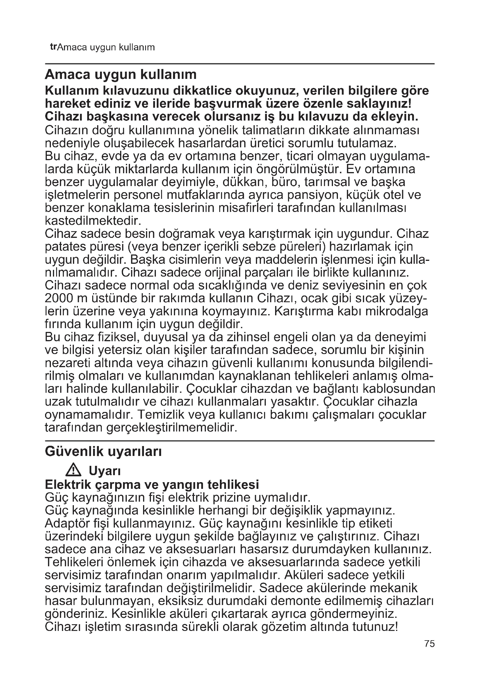 Amaca uygun kullanım Amaca uygun kullanım Kullanım kılavuzunu dikkatlice okuyunuz, verilen bilgilere göre hareket ediniz ve ileride başvurmak üzere özenle saklayınız! Cihazı başkasına verecek olursanız iş bu kılavuzu da ekleyin. Cihazın doğru kullanımına yönelik talimatların dikkate alınmaması nedeniyle oluşabilecek hasarlardan üretici sorumlu tutulamaz. Bu cihaz, evde ya da ev ortamına benzer, ticari olmayan uygulama- larda küçük miktarlarda kullanım için öngörülmüştür. Ev ortamına benzer uygulamalar deyimiyle, dükkan, büro, tarımsal ve başka işletmelerin personel mutfaklarında ayrıca pansiyon, küçük otel ve benzer konaklama tesislerinin misarleri tarafından kullanılması kastedilmektedir. Cihaz sadece besin doğramak veya karıştırmak için uygundur. Cihaz patates püresi (veya benzer içerikli sebze püreleri) hazırlamak için uygun değildir. Başka cisimlerin veya maddelerin işlenmesi için kulla- nılmamalıdır. Cihazı sadece orijinal parçaları ile birlikte kullanınız. Cihazı sadece normal oda sıcaklığında ve deniz seviyesinin en çok 2000 m üstünde bir rakımda kullanın Cihazı, ocak gibi sıcak yüzey- lerin üzerine veya yakınına koymayınız. Karıştırma kabı mikrodalga fırında kullanım için uygun değildir. Bu cihaz ziksel, duyusal ya da zihinsel engeli olan ya da deneyimi ve bilgisi yetersiz olan kişiler tarafından sadece, sorumlu bir kişinin nezareti altında veya cihazın güvenli kullanımı konusunda bilgilendi- rilmiş olmaları ve kullanımdan kaynaklanan tehlikeleri anlamış olma- ları halinde kullanılabilir. Çocuklar cihazdan ve bağlantı kablosundan uzak tutulmalıdır ve cihazı kullanmaları yasaktır. Çocuklar cihazla oynamamalıdır. Temizlik veya kullanıcı bakımı çalışmaları çocuklar tarafından gerçekleştirilmemelidir. Güvenlik uyarıları W Uyarı Elektrik çarpma ve yangın tehlikesi Güç kaynağınızın şi elektrik prizine uymalıdır. Güç kaynağında kesinlikle herhangi bir değişiklik yapmayınız. Adaptör şi kullanmayınız. Güç kaynağını kesinlikle tip etiketi üzerindeki bilgilere uygun şekilde bağlayınız ve çalıştırınız. Cihazı sadece ana cihaz ve aksesuarları hasarsız durumdayken kullanınız. Tehlikeleri önlemek için cihazda ve aksesuarlarında sadece yetkili servisimiz tarafından onarım yapılmalıdır. Aküleri sadece yetkili servisimiz tarafından değiştirilmelidir. Sadece akülerinde mekanik hasar bulunmayan, eksiksiz durumdaki demonte edilmemiş cihazları gönderiniz. Kesinlikle aküleri çıkartarak ayrıca göndermeyiniz. Cihazı işletim sırasında sürekli olarak gözetim altında tutunuz!76 tr Güvenlik uyarıları Bağlantı kablosunu sıcak parçalar ile temas ettirmeyiniz veya sivri kenarlar üzerine çekmeyiniz. Ana cihazı, şarj istasyonunu ve güç kaynağını kesinlikle suya daldırılmayınız veya bulaşık makinesinde yıkamayınız. Cihazı ıslak veya nemli elle tutmayınız ve boşta çalış- maya bırakmayınız. Cihazı, karıştırma ayağı ve ana cihaz bağlantı noktası üzerinden karıştırılacak malzeme içine daldırılmayınız. Cihazın uzun süre kullanılmayacağı hallerde, akülerin tamamen şarj edilmiş olmaları durumunda, parçaların birleştirilmesi veya ayrılması işlemlerinden önce veya temizlik sırasında ve hata durumlarında güç kaynağını her zaman elektrik şebekesinden ayırınız. Ana cihazı sadece cihaz ile birlikte teslim edilen şarj istasyonu ve ilgili güç kaynağı ile birlikte kullanınız. Güç kaynağının üzerini örtmeyiniz. Kolay alevlenen cisimleri cihazdan uzak tutunuz. W Uyarı Patlama tehlikesi! Aküleri sıcağa ve ateşe karşı koruyunuz. W Uyarı Yaralanma tehlikesi Cihazı kullandıktan sonra, karıştırma ayağı bıçağının durmasını bekleyiniz. Cihazın kullanımı sırasında hareket eden aksesuar par- çalarını veya yedek parçaları değiştirmeden önce, cihazı kapatınız. Kesinlikle karıştırma ayağı bıçağına müdahalede bulunmayınız. Karıştırma ayağı bıçağını kesinlikle çıplak elle tutmayınız. Hatalı kullanım durumunda ana cihazın aküsünden sıvı çıkabilir. Bu sıvı ile temastan kaçınınız. W Uyarı Haşlanma tehlikesi var Karıştırılacak sıcak malzemeler ile çalışırken dikkatli olunuz . Sıcak malzemeler karıştırılmaları sırasında dışarı sıçrayabilir. Karıştırma ayağını kesinlikle sıcak yüzeyler üzerine koymayınız veya çok sıcak karıştırma maddeleri içinde kullanmayınız. Pişme durumundaki karıştırılacak sıcak malzemeler, işlenmeden önce en az 80°C seviyesine kadar soğutulmalıdır. El blenderini tencere içinde kullanacaksanız öncelikle tencereyi ocaktan alınız. W Uyarı Boğulma riski Çocukların ambalaj malzemesiyle oynamasına izin vermeyin. EEE yönetmeliğine uygundur.77