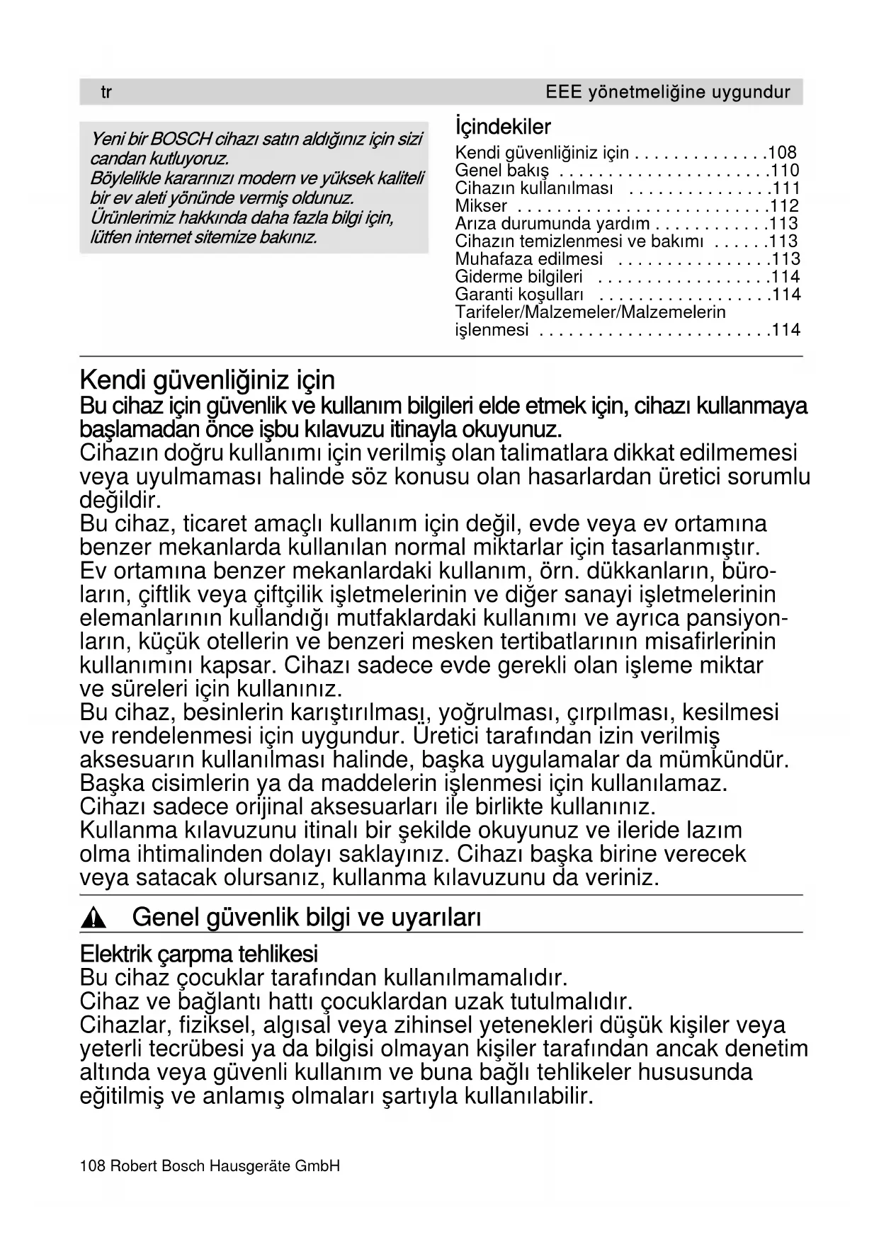 - Tarifeler/Malzemeler/Malzemelerin işlenmesi Kendi güvenliğiniz için Bu cihaz için güvenlik ve kullanım bilgileri elde etmek için, cihazı kullanmaya başlamadan önce işbu kılavuzu itinayla okuyunuz. Cihazın doğru kullanımı için verilmiş olan talimatlara dikkat edilmemesi veya uyulmaması halinde söz konusu olan hasarlardan üretici sorumlu değildir. Bu cihaz, ticaret amaçlı kullanım için değil, evde veya ev ortamına benzer mekanlarda kullanılan normal miktarlar için tasarlanmıştır. Ev ortamına benzer mekanlardaki kullanım, örn. dükkanların, büro- ların, çiftlik veya çiftçilik işletmelerinin ve diğer sanayi işletmelerinin elemanlarının kullandığı mutfaklardaki kullanımı ve ayrıca pansiyon- ların, küçük otellerin ve benzeri mesken tertibatlarının misafirlerinin kullanımını kapsar. Cihazı sadece evde gerekli olan işleme miktar ve süreleri için kullanınız. Bu cihaz, besinlerin karıştırılması, yoğrulması, çırpılması, kesilmesi ve rendelenmesi için uygundur. Üretici tarafından izin verilmiş aksesuarın kullanılması halinde, başka uygulamalar da mümkündür. Başka cisimlerin ya da maddelerin işlenmesi için kullanılamaz. Cihazı sadece orijinal aksesuarları ile birlikte kullanınız. Kullanma kılavuzunu itinalı bir şekilde okuyunuz ve ileride lazım olma ihtimalinden dolayı saklayınız. Cihazı başka birine verecek veya satacak olursanız, kullanma kılavuzunu da veriniz. , Genel güvenlik bilgi ve uyarıları Elektrik çarpma tehlikesi Bu cihaz çocuklar tarafından kullanılmamalıdır. Cihaz ve bağlantı hattı çocuklardan uzak tutulmalıdır. Cihazlar, fiziksel, algısal veya zihinsel yetenekleri düşük kişiler veya yeterli tecrübesi ya da bilgisi olmayan kişiler tarafından ancak denetim altında veya güvenli kullanım ve buna bağlı tehlikeler hususunda eğitilmiş ve anlamış olmaları şartıyla kullanılabilir. p. 114