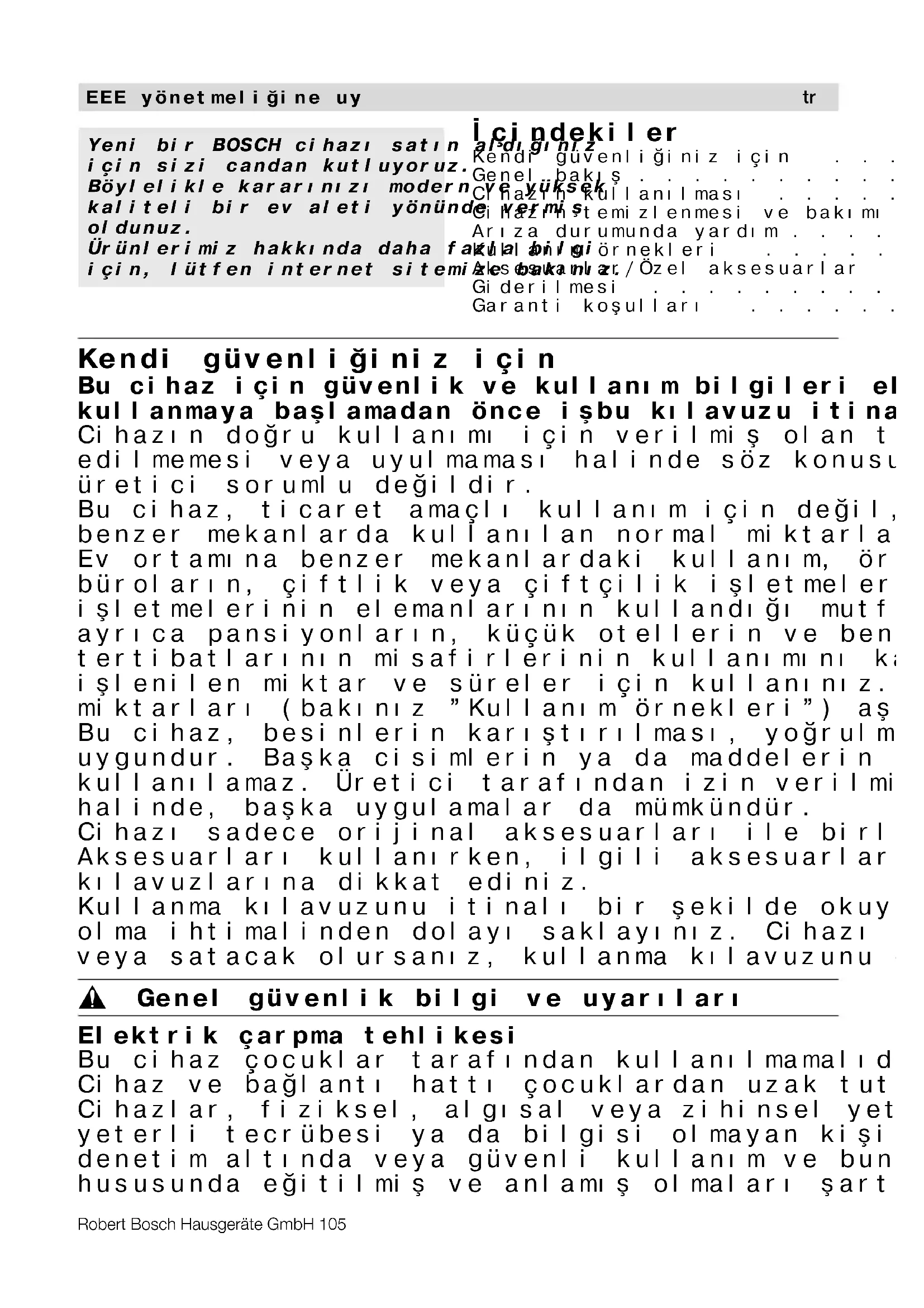 EEE yönetmeliðine uygundur Yeni bir BOSCH cihazý satýn aldýðýnýz için sizi candan kutluyoruz. Böylelikle kararýnýzý modern ve yüksek kaliteli bir ev aleti yönünde vermiþ oldunuz. Ürünlerimiz hakkýnda daha fazla bilgi için, lütfen internet sitemize bakýnýz.106 Robert Bosch Hausgeräte GmbH Çocuklarýn cihaz ile oynamasýna izin vermeyiniz. Cihazý sadece tipe etiketi üzerinde bildirilen bilgilere göre elektrik gerilimine baðlayýnýz ve çalýþtýrýnýz. Sadece elektrik kablosunda ve cihazda herhangi bir hasar yoksa kullanýnýz. Cihaz, baþýnda kimse yokken, monte edilmeden önce, sökülüp parçalarýna ayrýlmadan önce veya temizlenmeden önce daima elektrik þebekesinden ayrýlmalýdýr. Elektrik kablosunu keskin kenarlar ve sýcak yüzeyler üzerinden geçecek þekilde çekmeyiniz. Herhangi bir tehlikeli duruma yer vermemek için, cihazýn baðlantý kablosunda herhagi bir hasar olduðu zaman, sadece üretici tarafýndan, üreticinin yetkili servisi tarafýndan veya benzeri yetki ve eðitime sahip baþka bir uzman eleman tarafýndan deðiþtirilmelidir. Cihazda yapýlacak onarýmlar, herhangi bir tehlike oluþmasýný önlemek için, sadece yetkili servisimiz tarafýndan yapýlmalýdýr. , Bu cihaz için güvenlik bilgi ve uyarýlarý Yaralanma tehlikesi Elektrik çarpma tehlikesi! Elektrik fiþini ancak cihaz ile çalýþmak için tüm ön hazýrlýklar sona erdikten sonra prize takýnýz. Ana cihazý kesinlikle suya sokmayýnýz ve musluktan akan su altýna tutmayýnýz. Temizleme iþlemi için buharlý temizleme cihazý kullanmayýnýz. Cihaz çalýþma konumundayken, çevirme kolunun ayarýnda bir deðiþiklik yapmayýnýz. Tahrik sisteminin tamamen durmasýný bekleyiniz. Aleti/Aksesuarý sadece tahrik (motor) duruyorken deðiþtiriniz — Tahrik (motor), cihaz kapatýldýktan sonra da bir süre hareket etmeye devam eder. Cihazý sadece döner þalter ile açýnýz ve kapatýnýz. Cihaz kullanýlmadýðý zaman, elektrik fiþini prizden çekip çýkarýnýz. Bir arýza giderilmeden önce, elektrik fiþi çekilip prizden çýkarýlmalýdýr. Elektrik kesilmesi halinde, tekrar elektrik geldiðinde cihaz çalýþmaya devam eder. trRobert Bosch Hausgeräte GmbH 107 Dönen alet ve takýmlardan dolayý yaralanma tehlikesi söz konusudur! Dönen parçalarý tutmayýnýz ve dokunmayýnýz. Cihaz çalýþýrken elinizi karýþtýrma kabýnýn, yani çanaðýn içine kesinlikle sokmayýnýz. Cihaza takýlan alet ve aksesuarlarý sadece cihazýn tahrik sistemi dururken deðiþtiriniz. Cihaz kapatýldýktan sonra tahrik sistemi, yani motor belli bir süre hareket etmeye devam eder. Cihaz güvenlik açýsýndan sadece kullanýl-mayan tahrik sistemleri ilgili koruyucu kapaklar (4, 7) ile kapatýlmýþ olarak çalýþtýrýlmalýdýr. Keskin býçaklarýndan/dönen tahrik sisteminden (motordan) dolayý yaralanma tehlikesi söz konusudur! Mikser cihaza takýlýyken kesinlikle miksere elinizi sokmayýnýz! Mikserin parçalarýný kesinlikle ana cihaza takýlý þekilde birbirine monte etmeyiniz. Mikseri cihazdan çýkaracaðýnýz/cihaza takacaðýnýz zaman cihazýn durur vaziyette olmasýna özellikle dikkat ediniz! Mikseri daima tamamen monte edilmiþ þekilde ve kapaðýný kapatarak çalýþtýrýnýz. Mikserin býçaklarýna çýplak elleriniz ile dokunmayýnýz. Haþlanma tehlikesi! Mikserde sýcak malzeme iþlendiði zaman, kapakdaki huniden sýcak buhar çýkar. En fazla 0,5 litre sýcak veya köpüren sývý doldurunuz. Önemli! Ayný anda sadece bir alet ya da aksesuar kullanýnýz. Kullanma kýlavuzu deðiþik modeller için geçerlidir (ekteki model listesine de bakýnýz, Resim ). Cihazýn bakýma ihtiyacý yoktur. Genel bakýþ Lütfen resimli sayfalarý açýnýz. Resim Ana cihaz