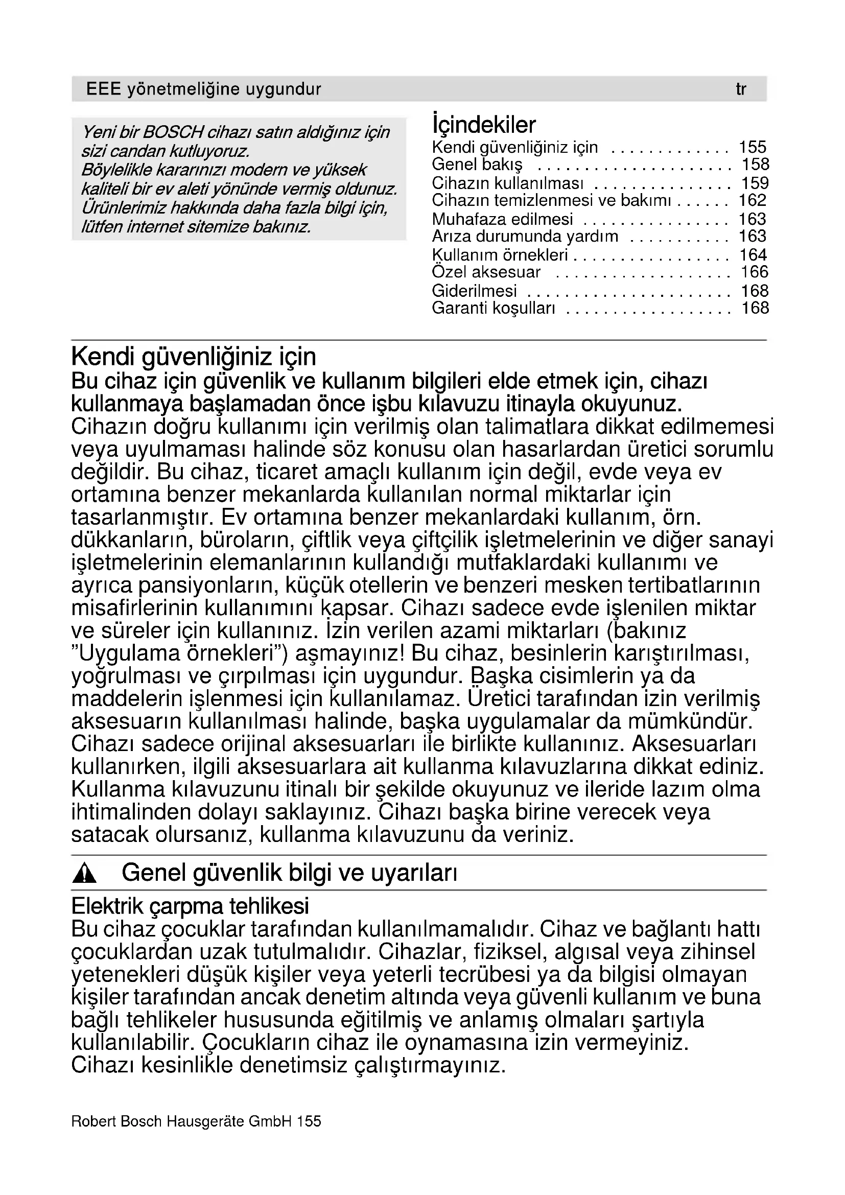 - Garanti koşulları Kendi güvenliğiniz için Bu cihaz için güvenlik ve kullanım bilgileri elde etmek için, cihazı kullanmaya başlamadan önce işbu kılavuzu itinayla okuyunuz. Cihazın doğru kullanımı için verilmiş olan talimatlara dikkat edilmemesi veya uyulmaması halinde söz konusu olan hasarlardan üretici sorumlu değildir. Bu cihaz, ticaret amaçlı kullanım için değil, evde veya ev ortamına benzer mekanlarda kullanılan normal miktarlar için tasarlanmıştır. Ev ortamına benzer mekanlardaki kullanım, örn. dükkanların, büroların, çiftlik veya çiftçilik işletmelerinin ve diğer sanayi işletmelerinin elemanlarının kullandığı mutfaklardaki kullanımı ve ayrıca pansiyonların, küçük otellerin ve benzeri mesken tertibatlarının misafirlerinin kullanımını kapsar. Cihazı sadece evde işlenilen miktar ve süreler için kullanınız. İzin verilen azami miktarları (bakınız ”Uygulama örnekleri”) aşmayınız! Bu cihaz, besinlerin karıştırılması, yoğrulması ve çırpılması için uygundur. Başka cisimlerin ya da maddelerin işlenmesi için kullanılamaz. Üretici tarafından izin verilmiş aksesuarın kullanılması halinde, başka uygulamalar da mümkündür. Cihazı sadece orijinal aksesuarları ile birlikte kullanınız. Aksesuarları kullanırken, ilgili aksesuarlara ait kullanma kılavuzlarına dikkat ediniz. Kullanma kılavuzunu itinalı bir şekilde okuyunuz ve ileride lazım olma ihtimalinden dolayı saklayınız. Cihazı başka birine verecek veya satacak olursanız, kullanma kılavuzunu da veriniz. , Genel güvenlik bilgi ve uyarıları Elektrik çarpma tehlikesi Bu cihaz çocuklar tarafından kullanılmamalıdır. Cihaz ve bağlantı hattı çocuklardan uzak tutulmalıdır. Cihazlar, fiziksel, algısal veya zihinsel yetenekleri düşük kişiler veya yeterli tecrübesi ya da bilgisi olmayan kişiler tarafından ancak denetim altında veya güvenli kullanım ve buna bağlı tehlikeler hususunda eğitilmiş ve anlamış olmaları şartıyla kullanılabilir. Çocukların cihaz ile oynamasına izin vermeyiniz. Cihazı kesinlikle denetimsiz çalıştırmayınız. p. 168