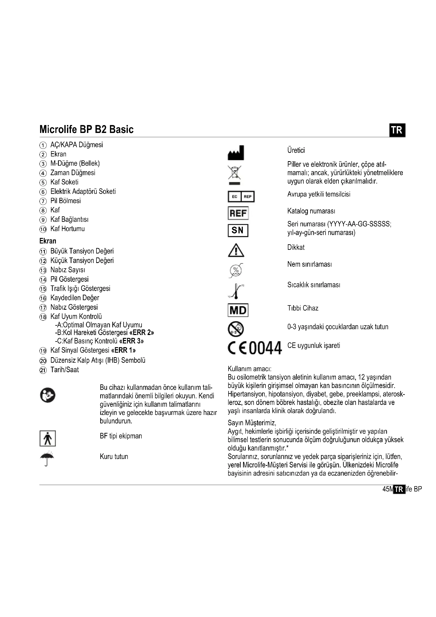 Ekran Kullanım amacı: Bu osilometrik tansiyon aletinin kullanım amacı, 12 yaşından büyük kişilerin girişimsel olmayan kan basıncının ölçülmesidir. Hipertansiyon, hipotansiyon, diyabet, gebe, preeklampsi, aterosk- leroz, son dönem böbrek hastalığı, obezite olan hastalarda ve yaşlı insanlarda klinik olarak doğrulandı. Sayın Müşterimiz, Aygıt, hekimlerle işbirliği içerisinde geliştirilmiştir ve yapılan bilimsel testlerin sonucunda ölçüm doğruluğunun oldukça yüksek olduğu kanıtlanmıştır.* Sorularınız, sorunlarınız ve yedek parça siparişleriniz için, lütfen, yerel Microlife-Müşteri Servisi ile görüşün. Ülkenizdeki Microlife bayisinin adresini satıcınızdan ya da eczanenizden öğrenebilir- Microlife BP B2 Basic