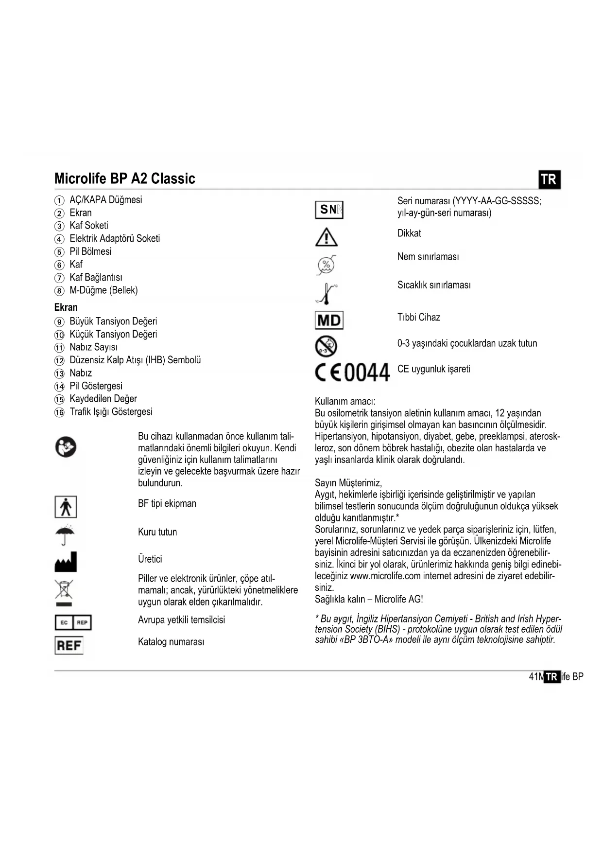 Ekran Kullanım amacı: Bu osilometrik tansiyon aletinin kullanım amacı, 12 yaşından büyük kişilerin girişimsel olmayan kan basıncının ölçülmesidir. Hipertansiyon, hipotansiyon, diyabet, gebe, preeklampsi, aterosk- leroz, son dönem böbrek hastalığı, obezite olan hastalarda ve yaşlı insanlarda klinik olarak doğrulandı. Sayın Müşterimiz, Aygıt, hekimlerle işbirliği içerisinde geliştirilmiştir ve yapılan bilimsel testlerin sonucunda ölçüm doğruluğunun oldukça yüksek olduğu kanıtlanmıştır.* Sorularınız, sorunlarınız ve yedek parça siparişleriniz için, lütfen, yerel Microlife-Müşteri Servisi ile görüşün. Ülkenizdeki Microlife bayisinin adresini satıcınızdan ya da eczanenizden öğrenebilir- siniz. İkinci bir yol olarak, ürünlerimiz hakkında geniş bilgi edinebi- leceğiniz www.microlife.com internet adresini de ziyaret edebilir- siniz. Sağlıkla kalın – Microlife AG!