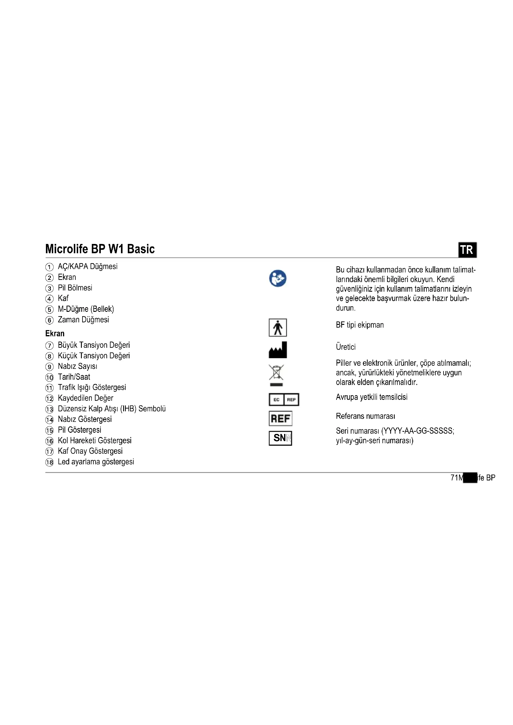 1 AÇ/KAPA Düğmesi 2 Ekran 3 Pil Bölmesi 4 Kaf 5 M-Düğme (Bellek) 6 Zaman Düğmesi 7 Büyük Tansiyon Değeri 8 Küçük Tansiyon Değeri 9 Nabız Sayısı AT Tarih/Saat AK Trafik Işığı Göstergesi AL Kaydedilen Değer AM Düzensiz Kalp Atışı (IHB) Sembolü AN Nabız Göstergesi AO Pil Göstergesi AP Kol Hareketi Göstergesi AQ Kaf Onay Göstergesi AR Led ayarlama göstergesi Bu cihazı kullanmadan önce kullanım talimat- larındaki önemli bilgileri okuyun. Kendi güvenliğiniz için kullanım talimatlarını izleyin ve gelecekte başvurmak üzere hazır bulun- durun. BF tipi ekipman Üretici Piller ve elektronik ürünler, çöpe atılmamalı; ancak, yürürlükteki yönetmeliklere uygun olarak elden çıkarılmalıdır. Avrupa yetkili temsilcisi Referans numarası Seri numarası (YYYY-AA-GG-SSSSS; yıl-ay-gün-seri numarası)
